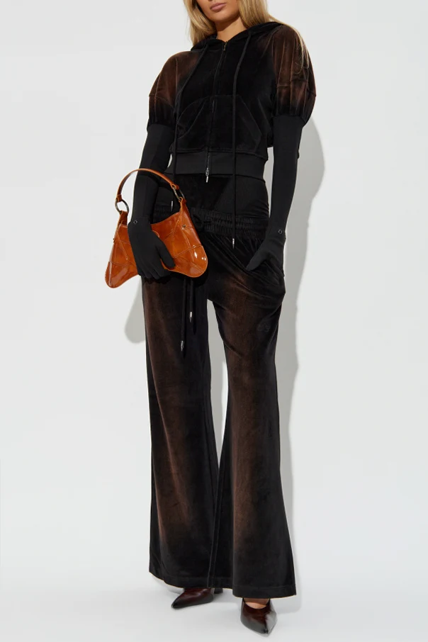 Wyróżniający się gęsty welur najwyższej jakości subtelnie połyskuje, tworząc efekt głębi ożywiający czerń materiału. Drobne haftowane logo umieszczone poniżej kieszeni dyskretnie nawiązuje do ekskluzywnych projektów, zaś srebrne wykończenia troczka oraz precyzyjne przeszycia budują luksusowy charakter.