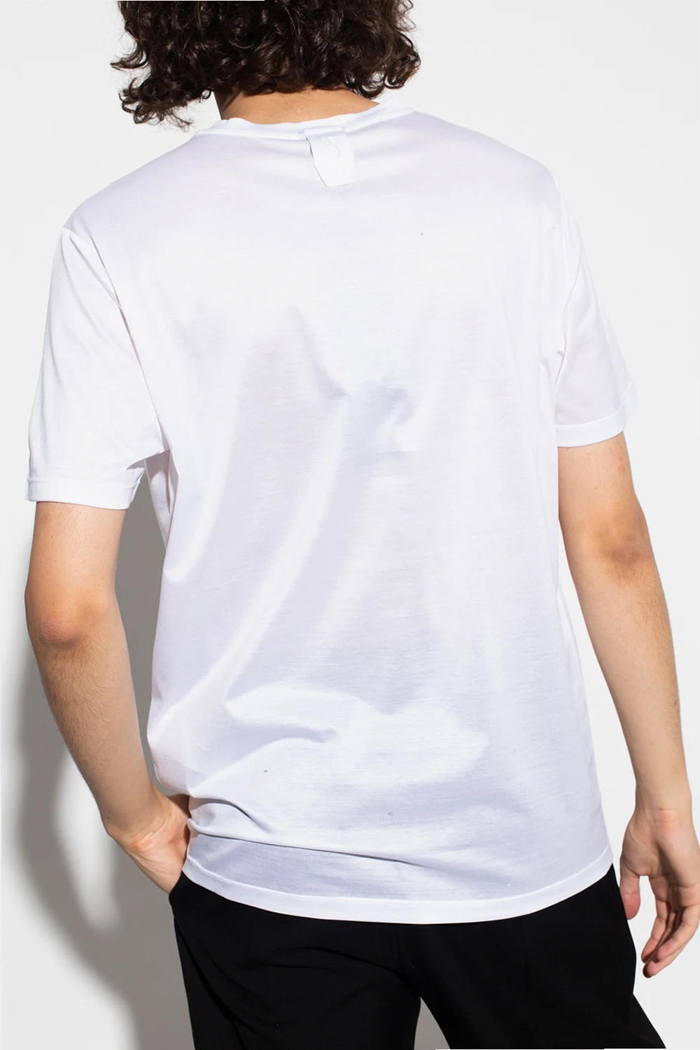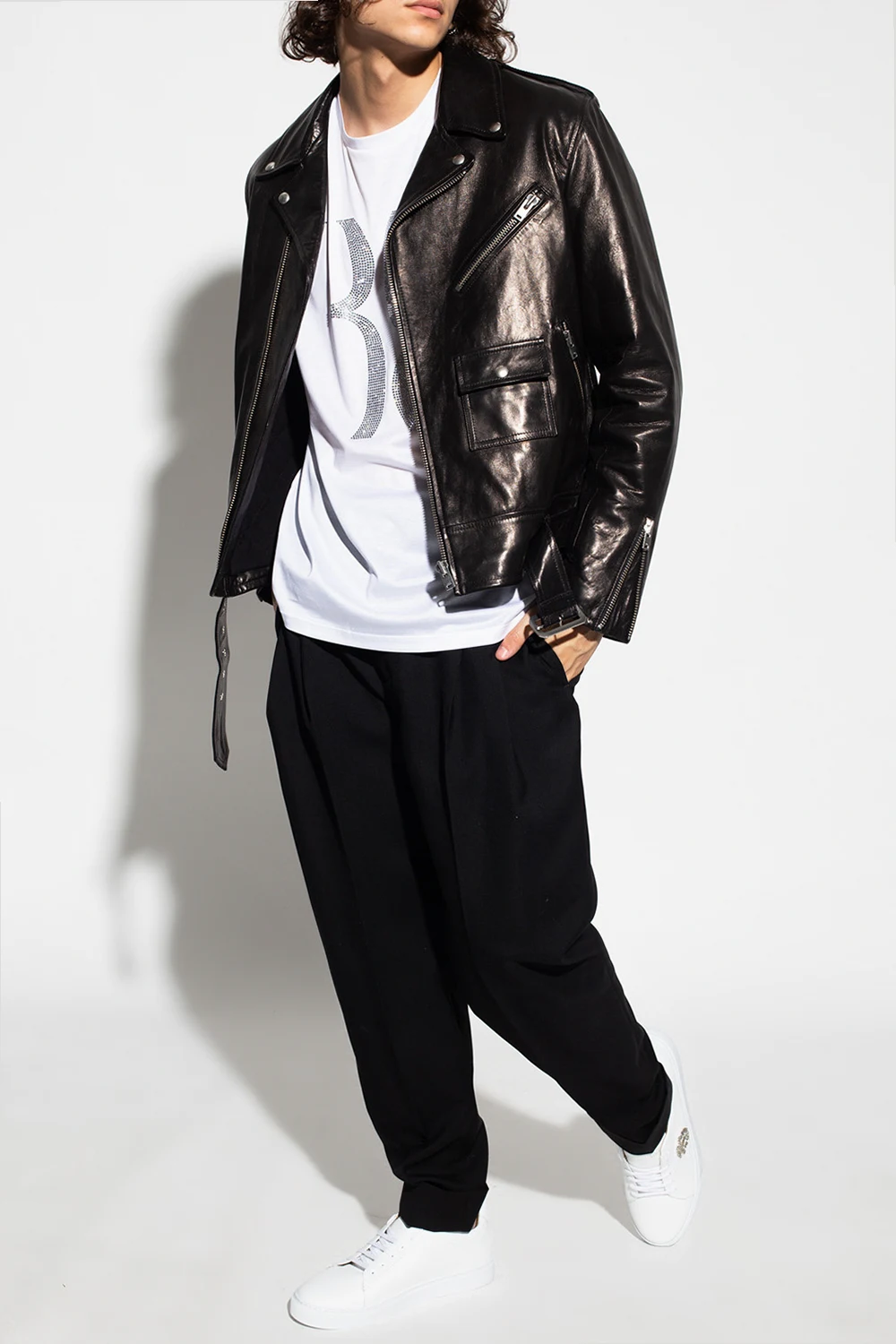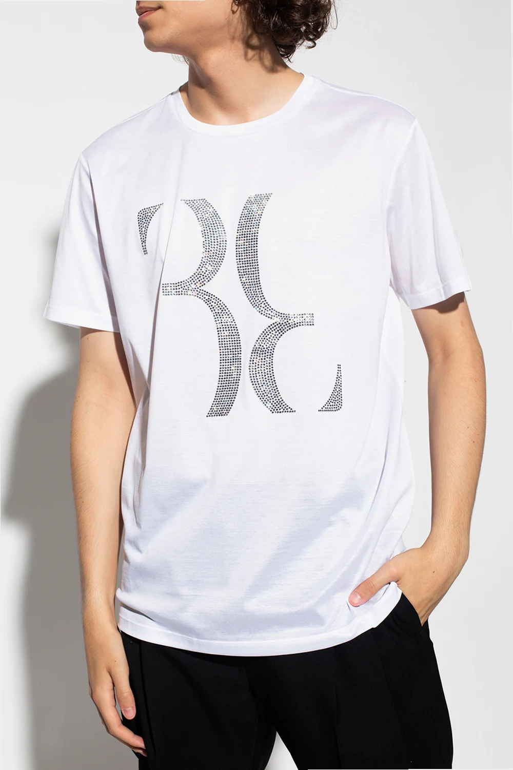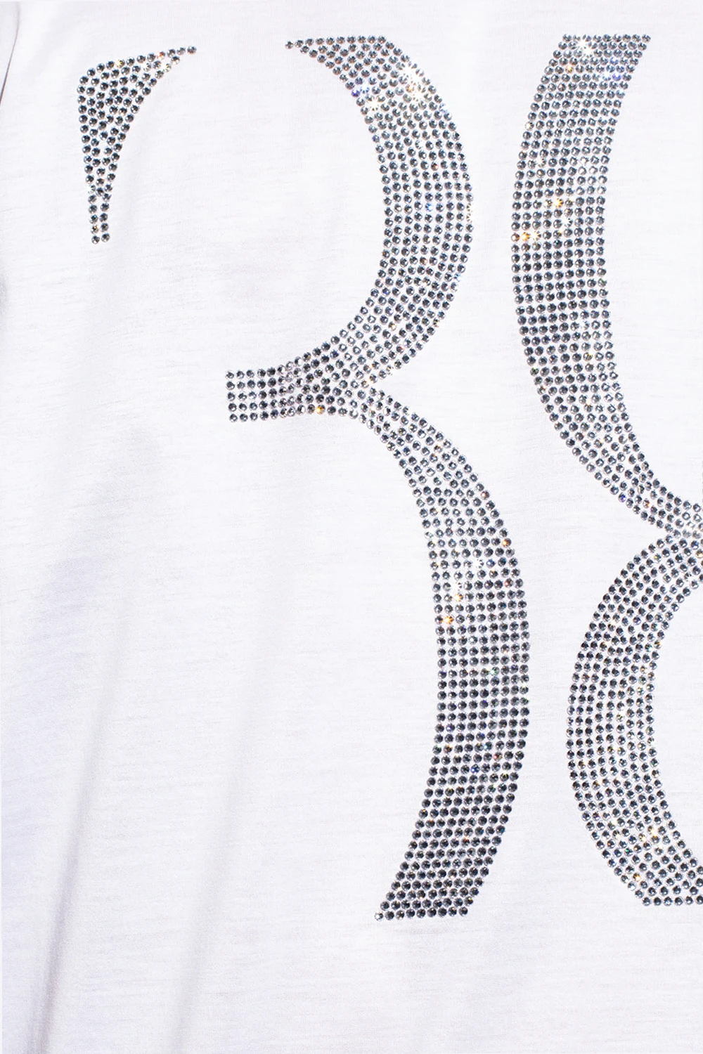 Biały, bawełniany t-shirt Billionaire. Z przodu ozdobiony logo ułożonym z białych cekinów. Okrągły dekolt. Krótkie rękawy.