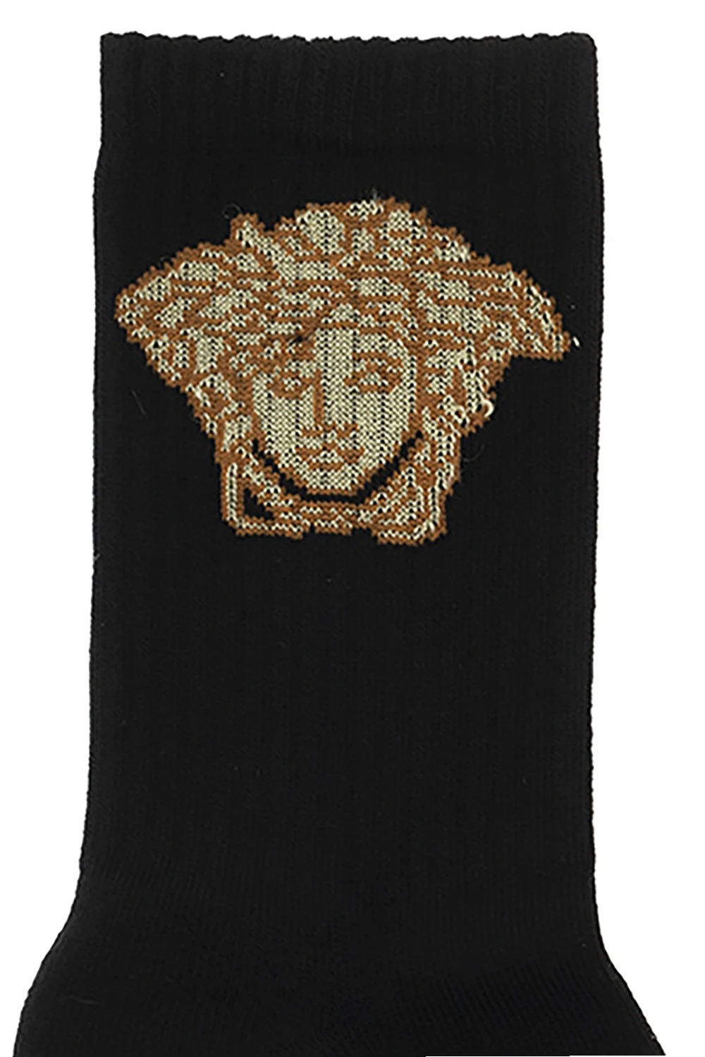 Czarne, bawełniane skarpety Versace Kid. Ozdobione wyszytym logo oraz charakterystyczną dla marki głową Meduzy w kolorze brązowo-złotym. Zakończone prążkowanym ściągaczem.