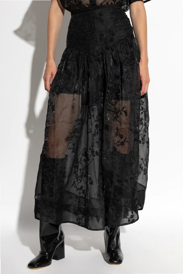 Spódnica z motywem kwiatowym marki GANNI to kunsztowne połączenie lekkości i wyrafinowanego stylu. Jej długość maxi oraz lekko rozkloszowany fason pozwalają subtelnie podkreślić talię, oferując równocześnie swobodę ruchu i niepowtarzalną wygodę noszenia. Transparentny tiul, z którego została wykonana, nadaje całości wyrafinowanie, zaś częściowa przezroczystość u dołu sprawia, iż spódnica zachwyca lekkością.