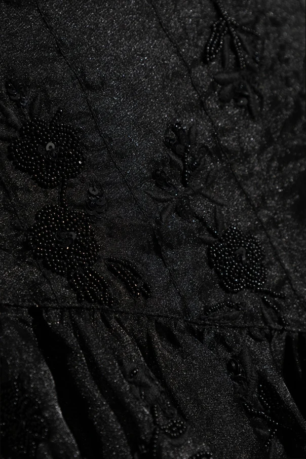 Wyrazisty, haftowany wzór kwiatowy oraz misternie rozmieszczone drobne koralikowe aplikacje tworzą wyjątkową fakturę, podkreślającą luksusowy charakter produktu. Brak widocznych emblematów oraz wysublimowane wykończenie sprawiają, że spódnica zachwyca subtelnością i klasą. Projekt sygnowany przez GANNI stanowi hołd dla ponadczasowej elegancji oraz najwyższej jakości detali.