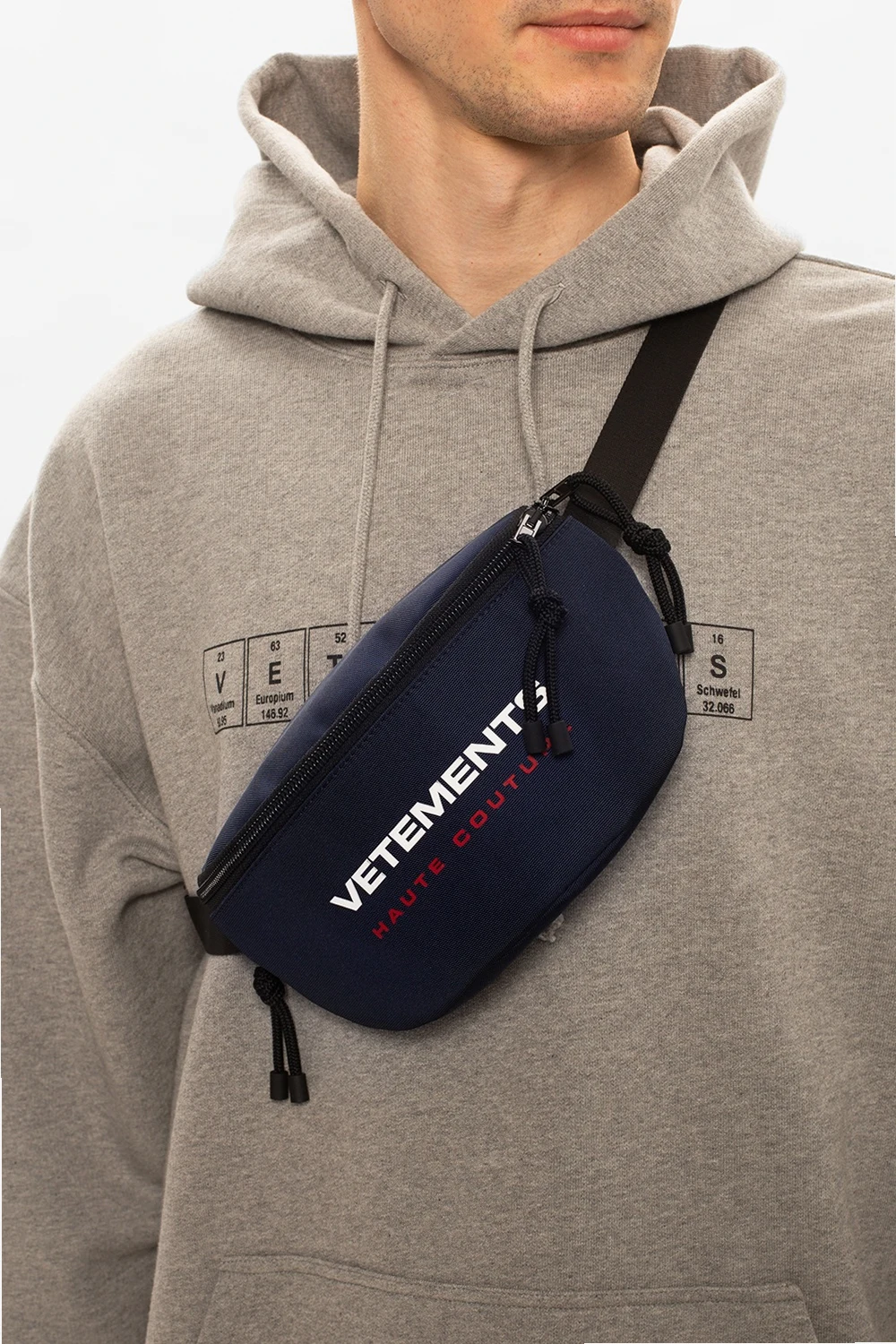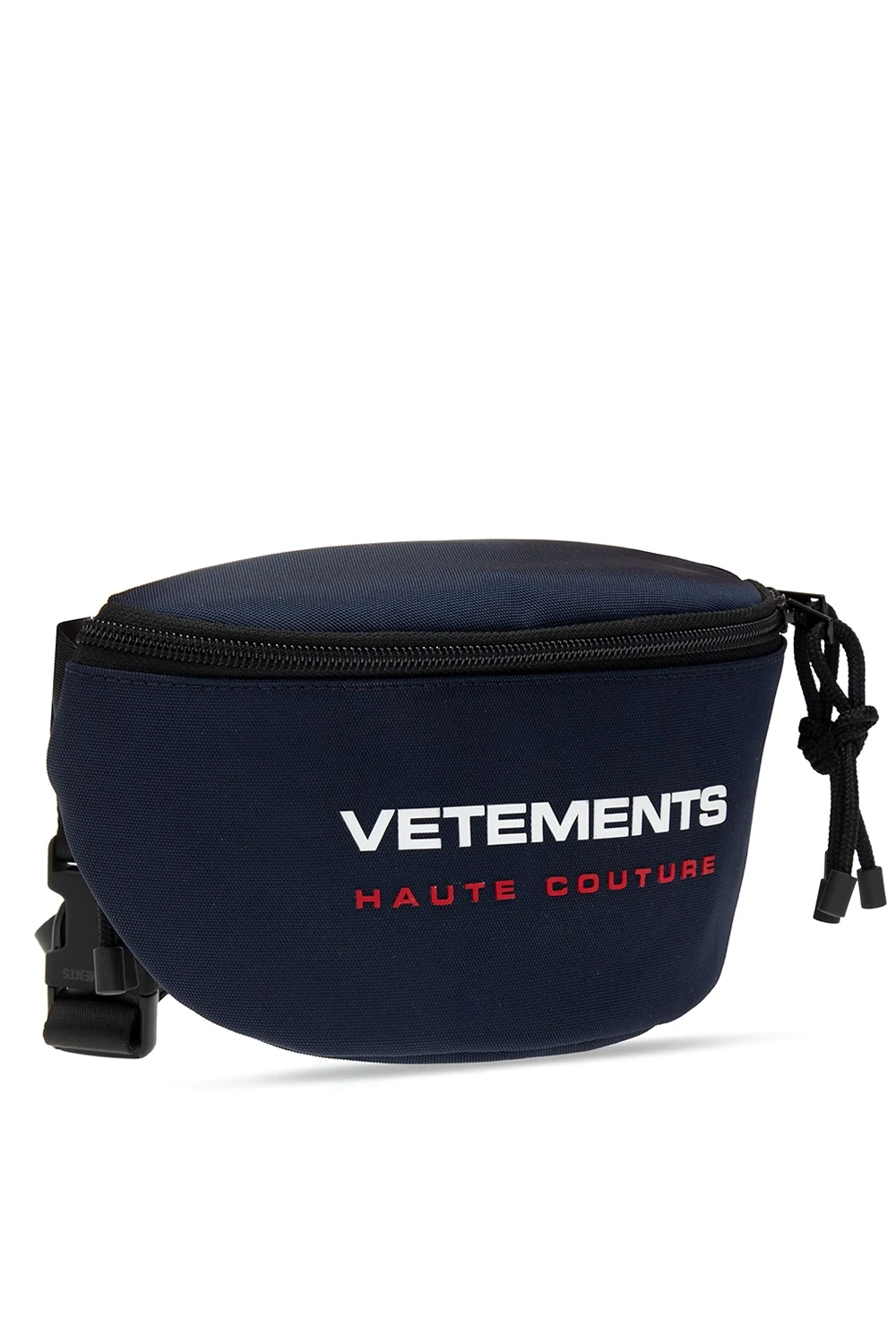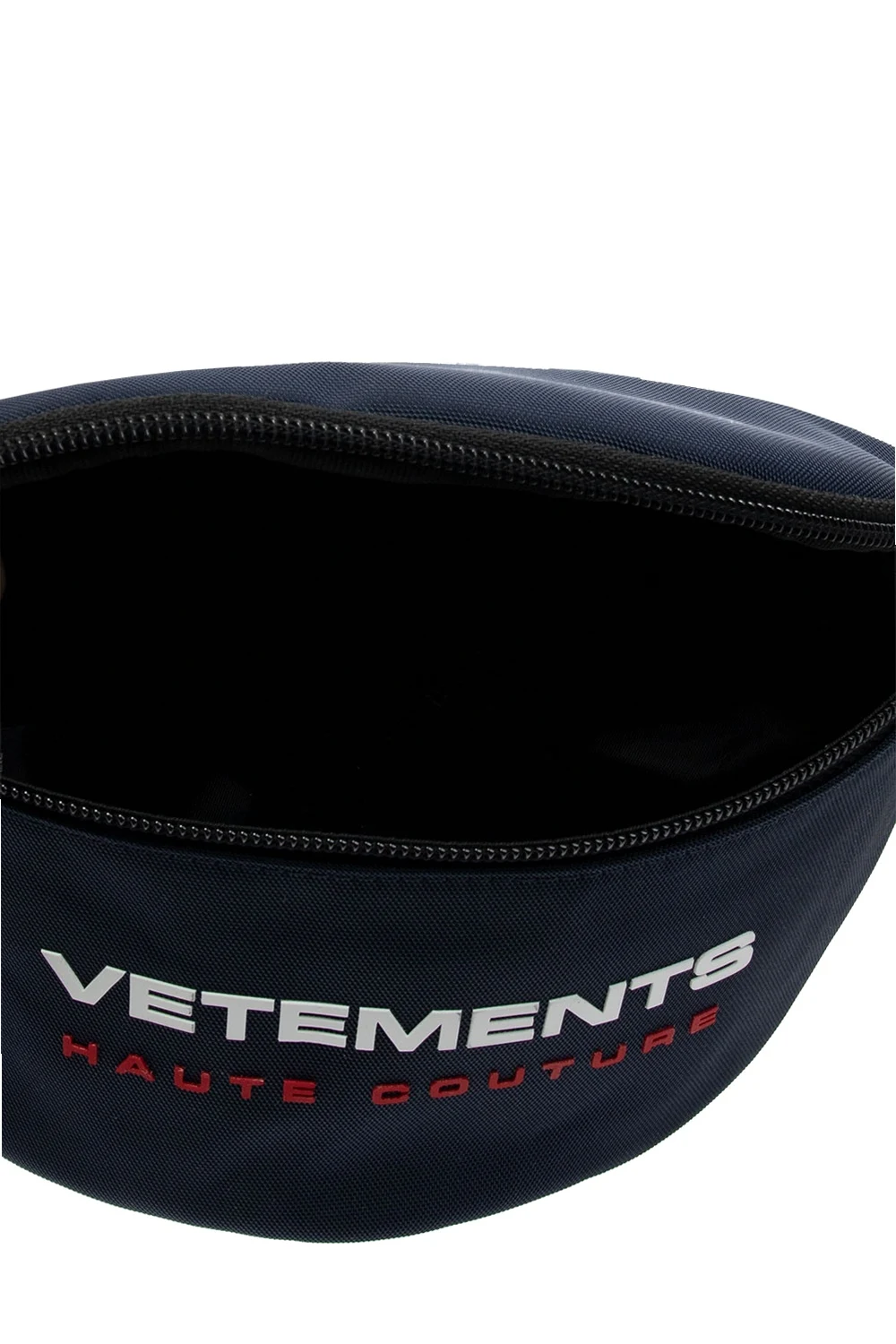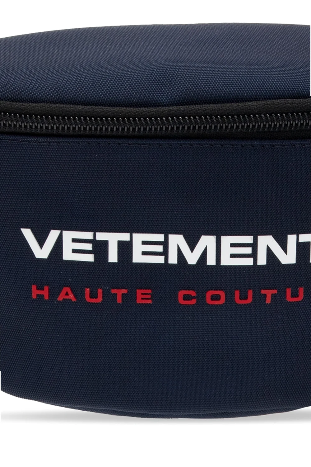 Granatowa torba na pas VETEMENTS. Zapinana na zamek. Gumowa aplikacja z logo w kolorze biało-czerwonym. Z tyłu kieszeń zapinana na zamek. Regulowany pasek z klamrą. Wewnątrz komora.
