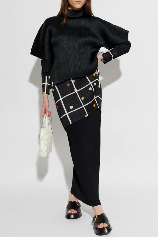 Artystyczne, głębokie pionowe plisy w połączeniu z przenikającymi je geometrycznymi prążkami tworzą niezwykle efektowny, nieoczywisty wzór, przyciągający wzrok i podkreślający nietuzinkowy charakter projektu. Wysokiej jakości lekka tkanina – będąca mieszanką poliestru oraz bawełny – zachowuje sprężystość i zjawiskowo układa się w ruchu, będąc kwintesencją innowacyjności Issey Miyake.
