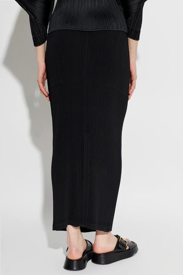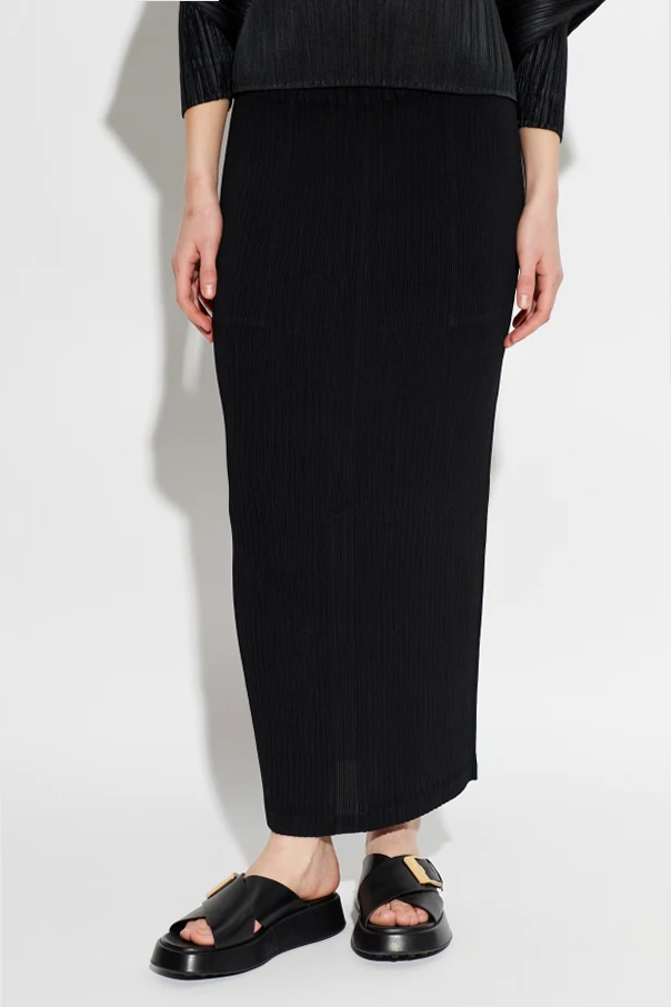 Plisowana spódnica Issey Miyake to ukłon w stronę wyrafinowanej elegancji oraz nowoczesnego rzemiosła. O zachwycającej, czarnej barwie w subtelnie półprzezroczystej tkaninie, spódnica sięga do połowy łydki, podkreślając kobiecą sylwetkę i wdzięk. Klasyczny fason ołówkowy został urozmaicony szerokim, elastycznym pasem w talii, zapewniającym komfort i doskonałe dopasowanie.