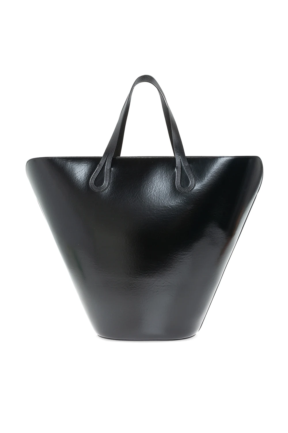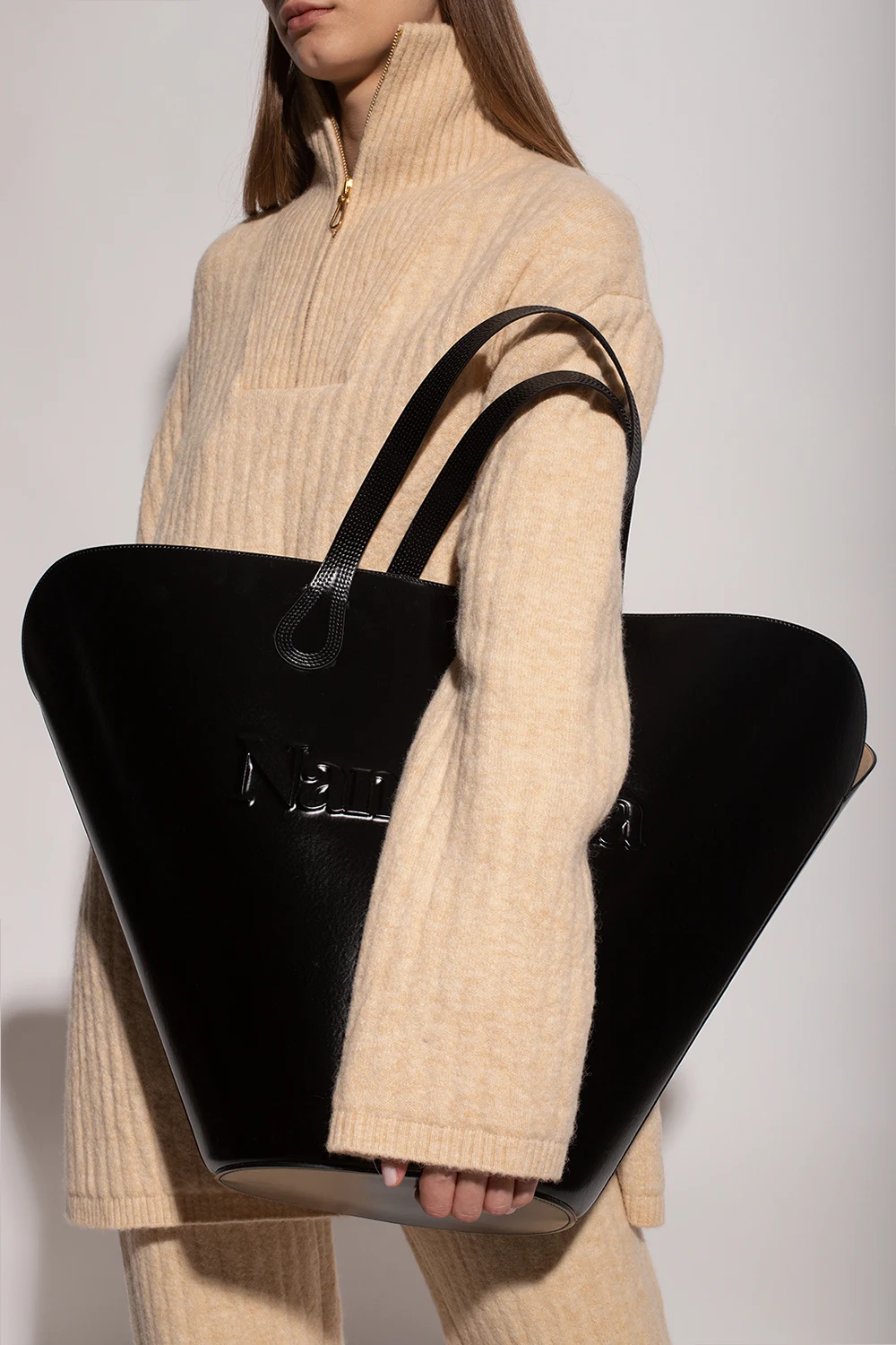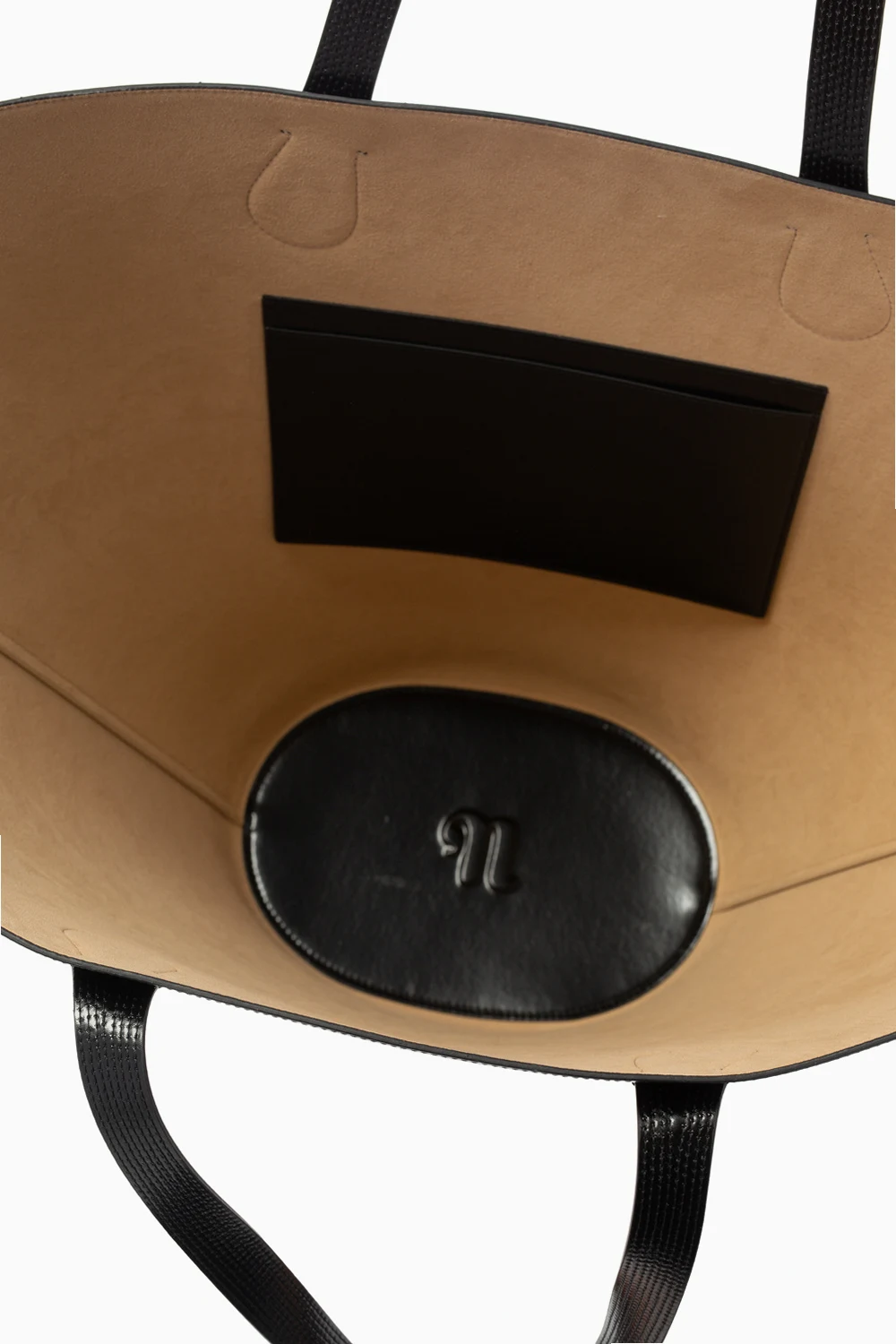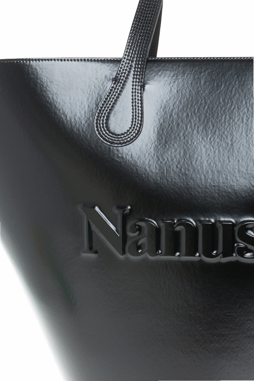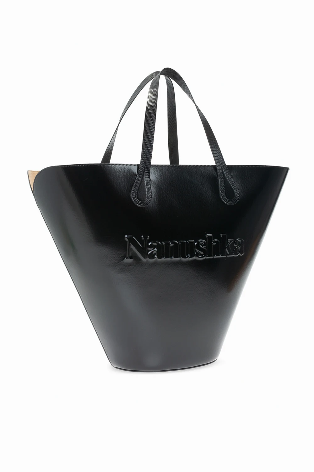 Czarna torba typu 'shopper', model 'Juno Large’ Nanushka. Wykonana z wegańskiej skóry. Z przodu wypukłe logo. Dwa półokrągłe paski. Wewnątrz komora i wsuwana kieszeń.
