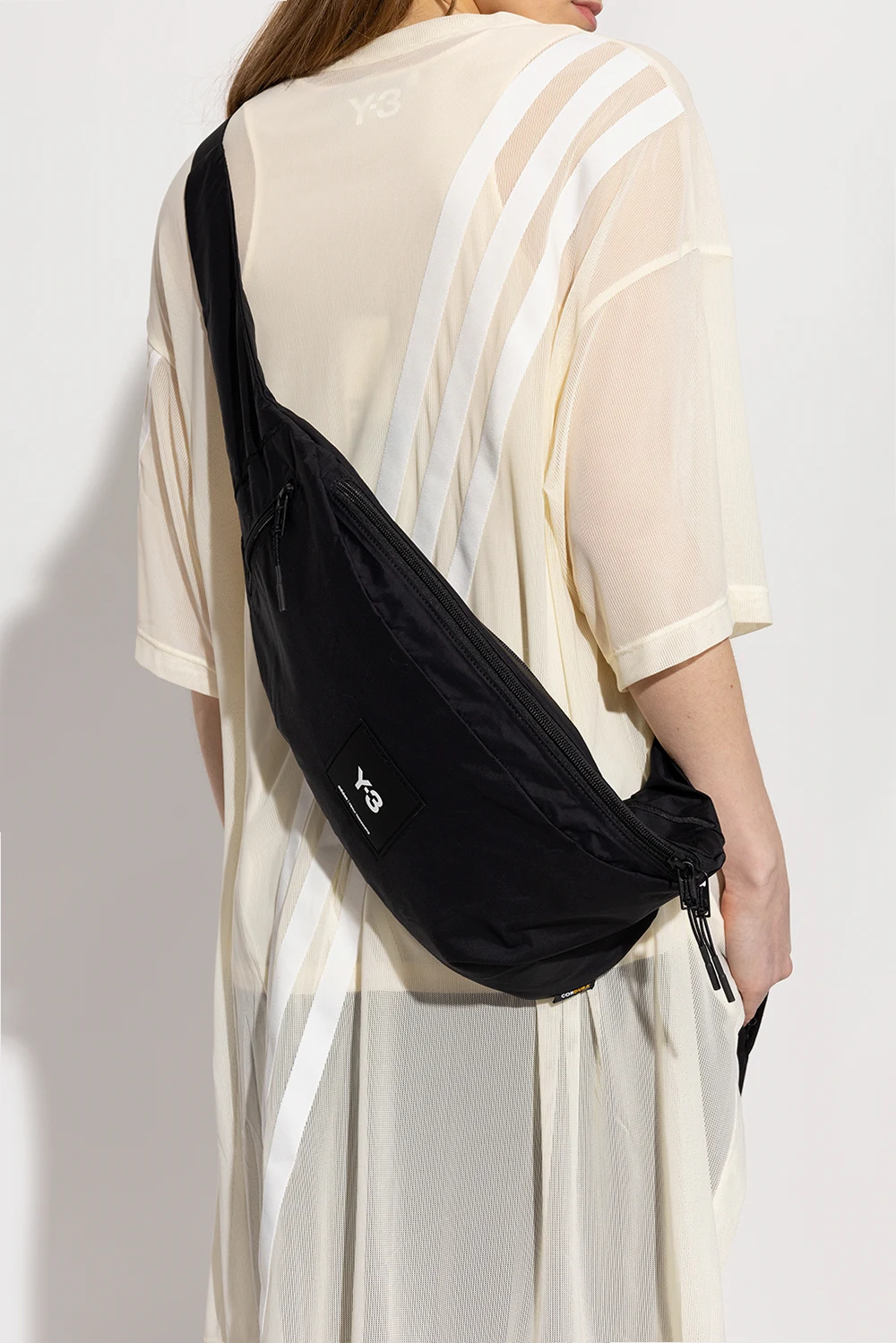 Czarna torba na ramię Y-3 Yohji Yamamoto. Wykonana z wytrzymałego nylonu CORDURA®. Zamykana na dwubiegunowy zamek. Z przodu ozdobiona silikonową naszywką z logo. Pas z możliwością regulacji długości zamykany na klamrę z logo typu ‘fidlock’. Dwie zewnętrzne kieszenie na zamek. Wewnątrz komora z kieszenią.