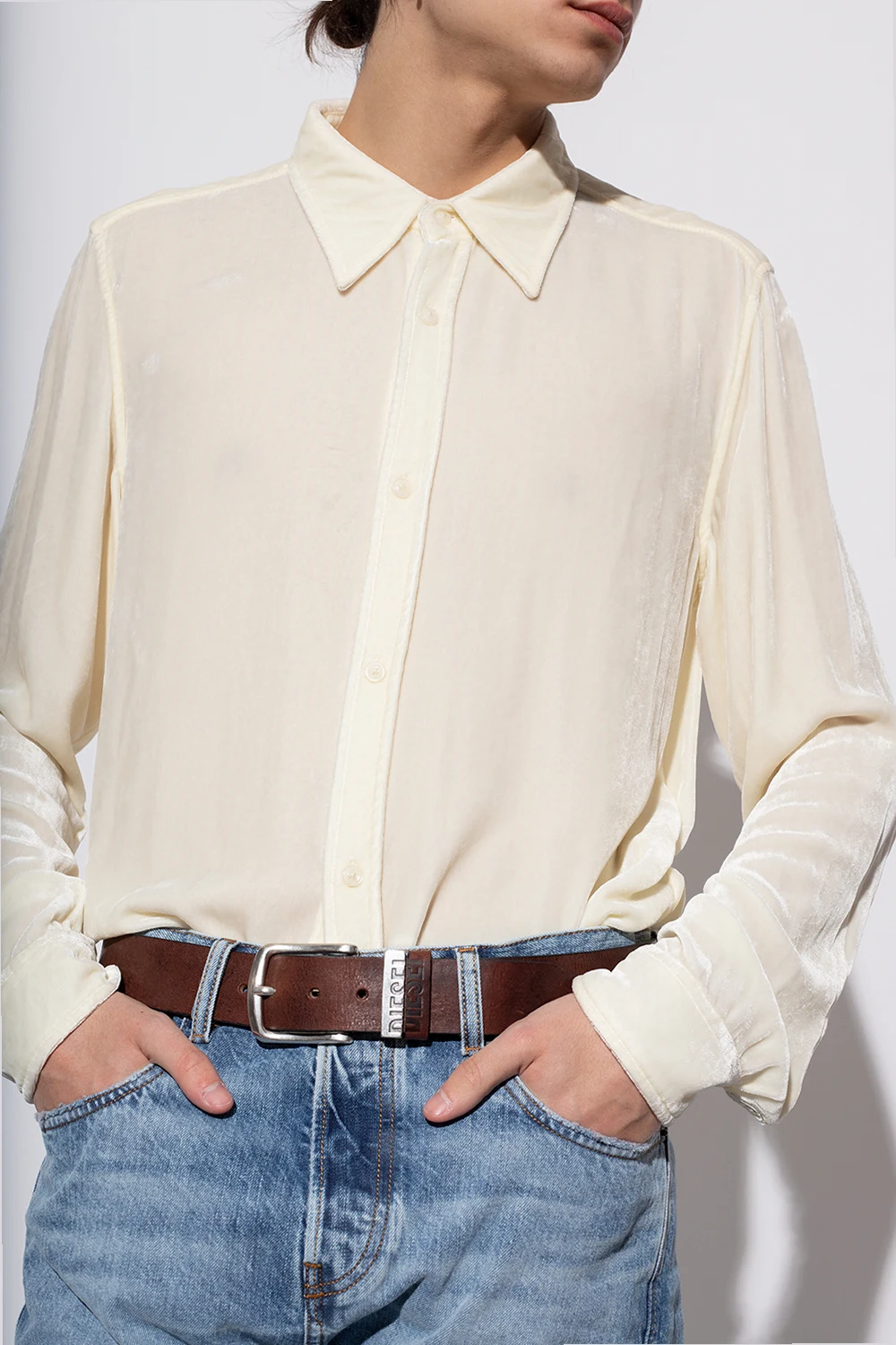– Kremowy skórzany pasek do jeansów z klamrą do noszenia w talii lub na biodrach