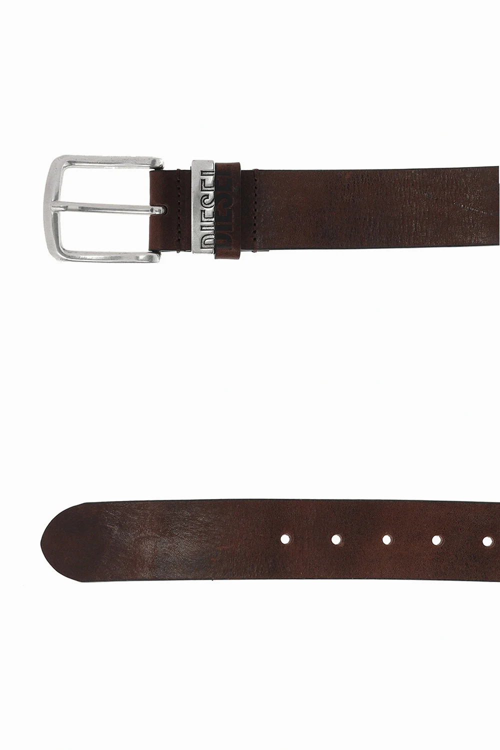 Brązowy, skórzany pasek z logo, model 'B-Visible' Diesel. Ozdobna aplikacja z wytłoczonym logo wykonana z metalu oraz skóry. Klamra w kolorze srebrnym.
