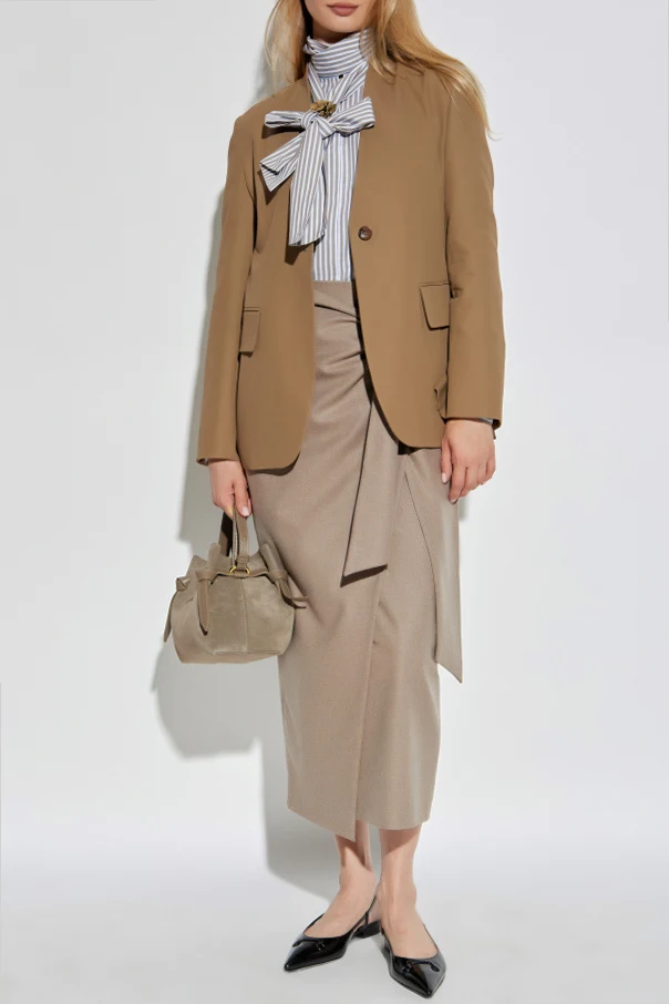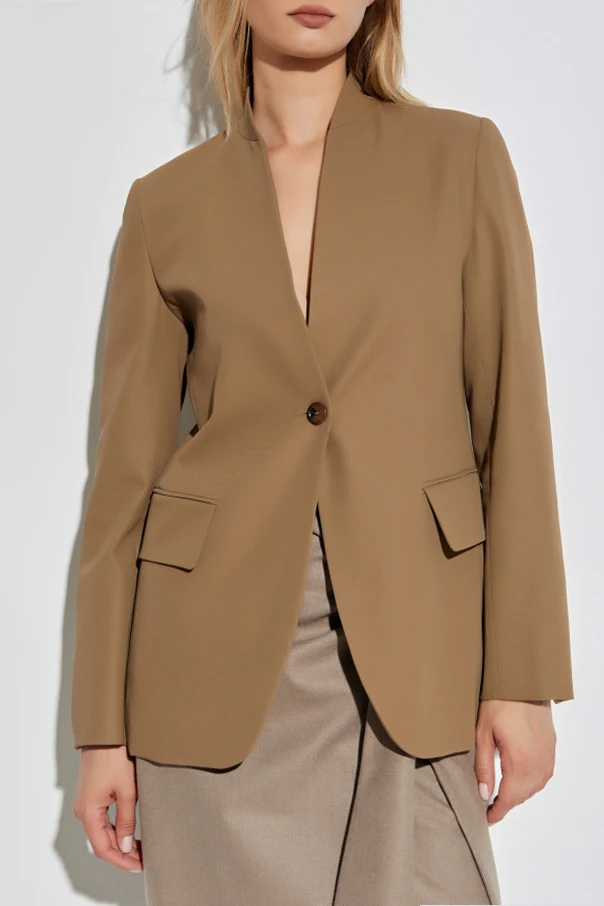 Marynarka „Segnale” marki Max Mara stanowi kwintesencję współczesnej elegancji, kreowanej z myślą o kobietach ceniących klasykę w nowatorskim wydaniu. Prosta, lekko taliowana forma harmonijnie dopasowuje się do sylwetki, podkreślając jej naturalne linie. Minimalistyczny, lekko podwyższony kołnierzyk typu stójka, pozbawiony klap, subtelnie odróżnia ten model od tradycyjnych fasonów.