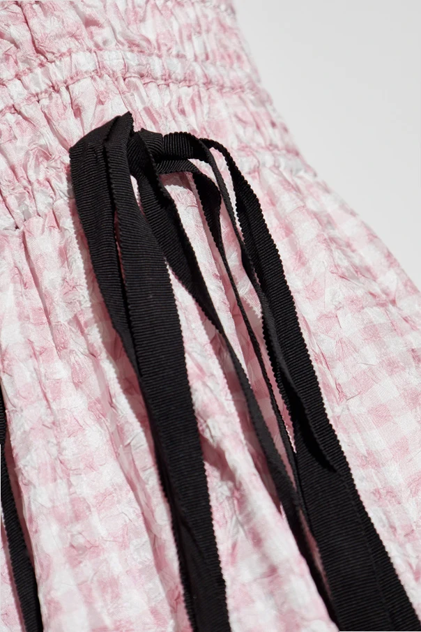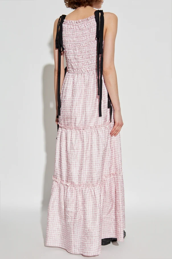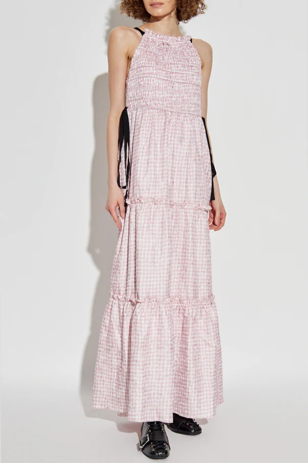 Sukienka ze wzorem w kratę od Ganni to wyrafinowana propozycja dla miłośniczek elegancji i świeżego spojrzenia na klasykę. Model maxi przykuwa wzrok lekką formą, z dopasowaną, finezyjnie marszczoną górą oraz zwiewnym, rozkloszowanym dołem, tworząc wyjątkowo kobiecy, wysublimowany efekt.