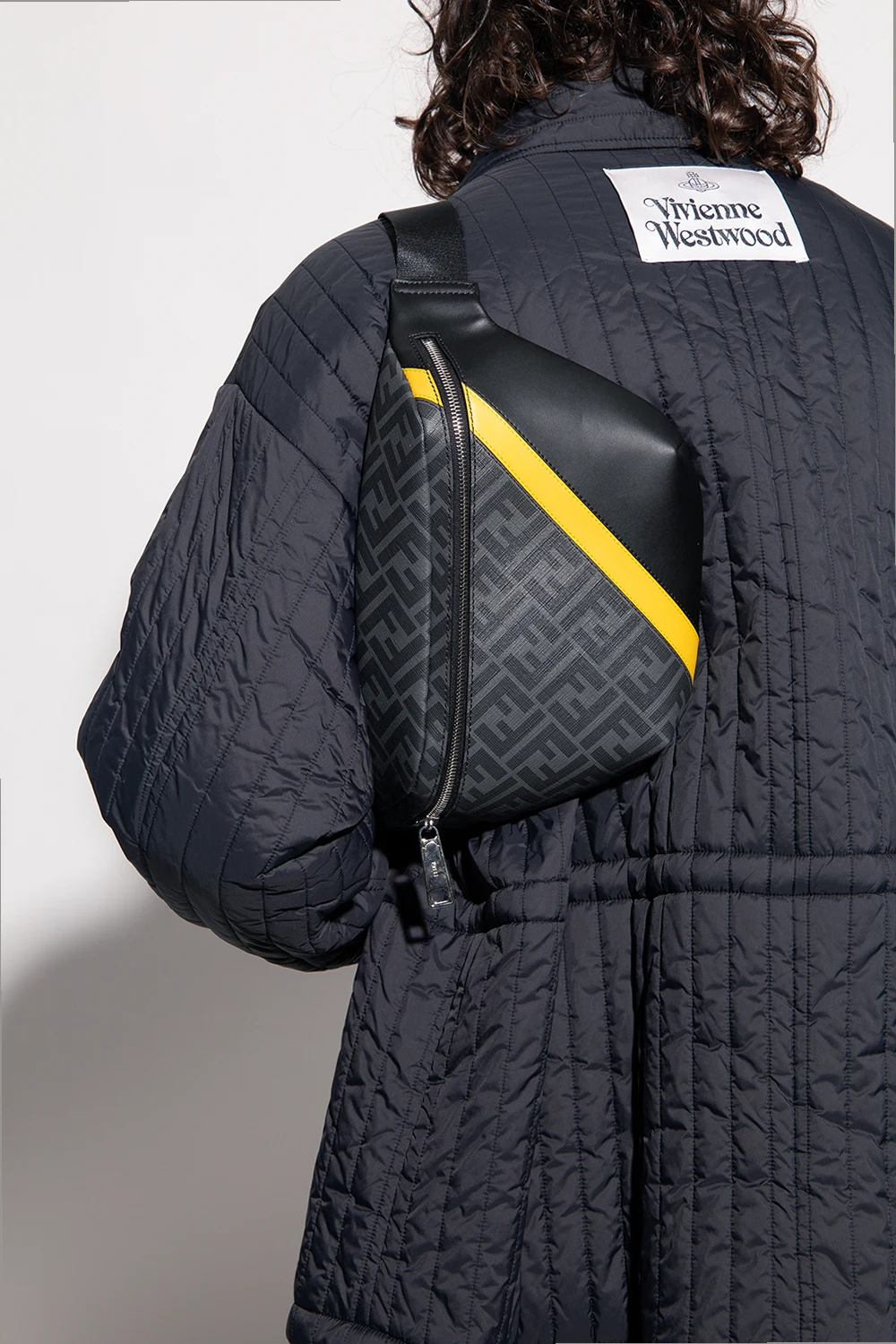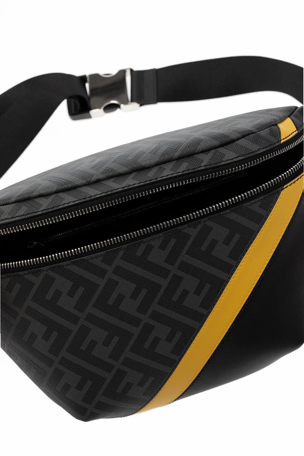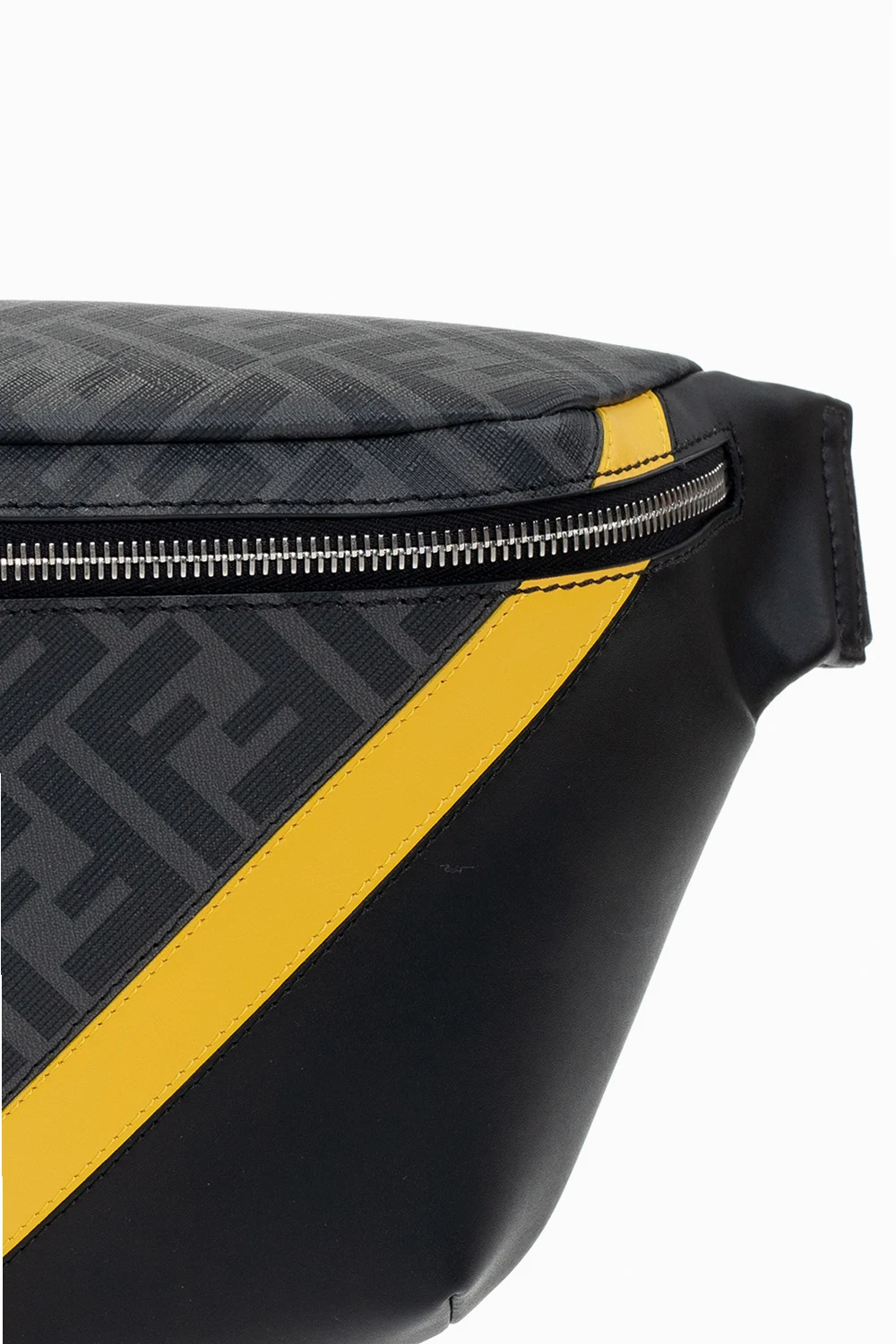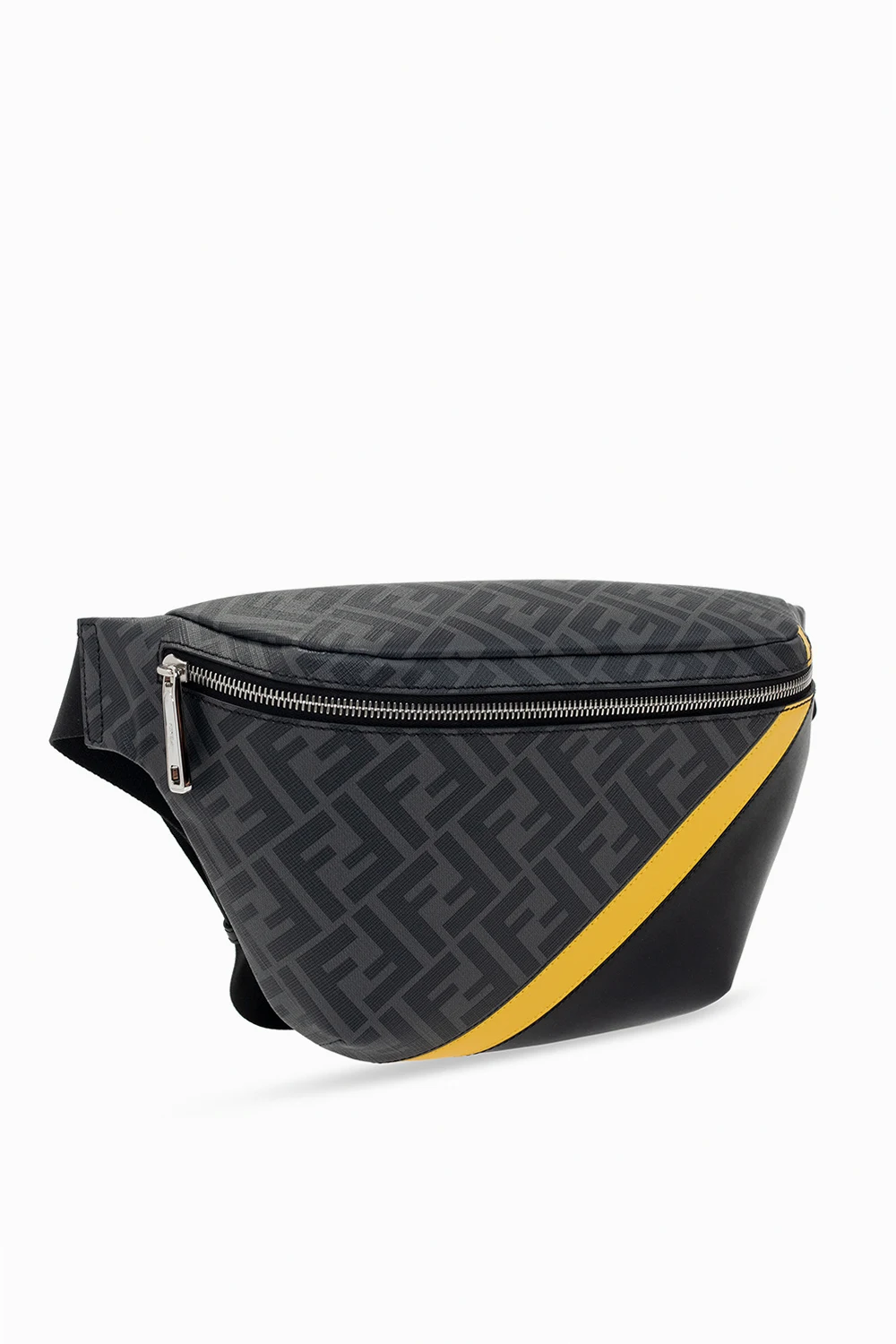 Czarno-szaro-żółta torba na pas Fendi. Wykonana z płótna. Wykończona skórą cielęcą. Zamykana na zamek. Ozdobiona wzorem z logo. Regulowany pas. Wewnątrz komora i kieszeń zamykana na zamek. Metalowe elementy w kolorze srebrnym.