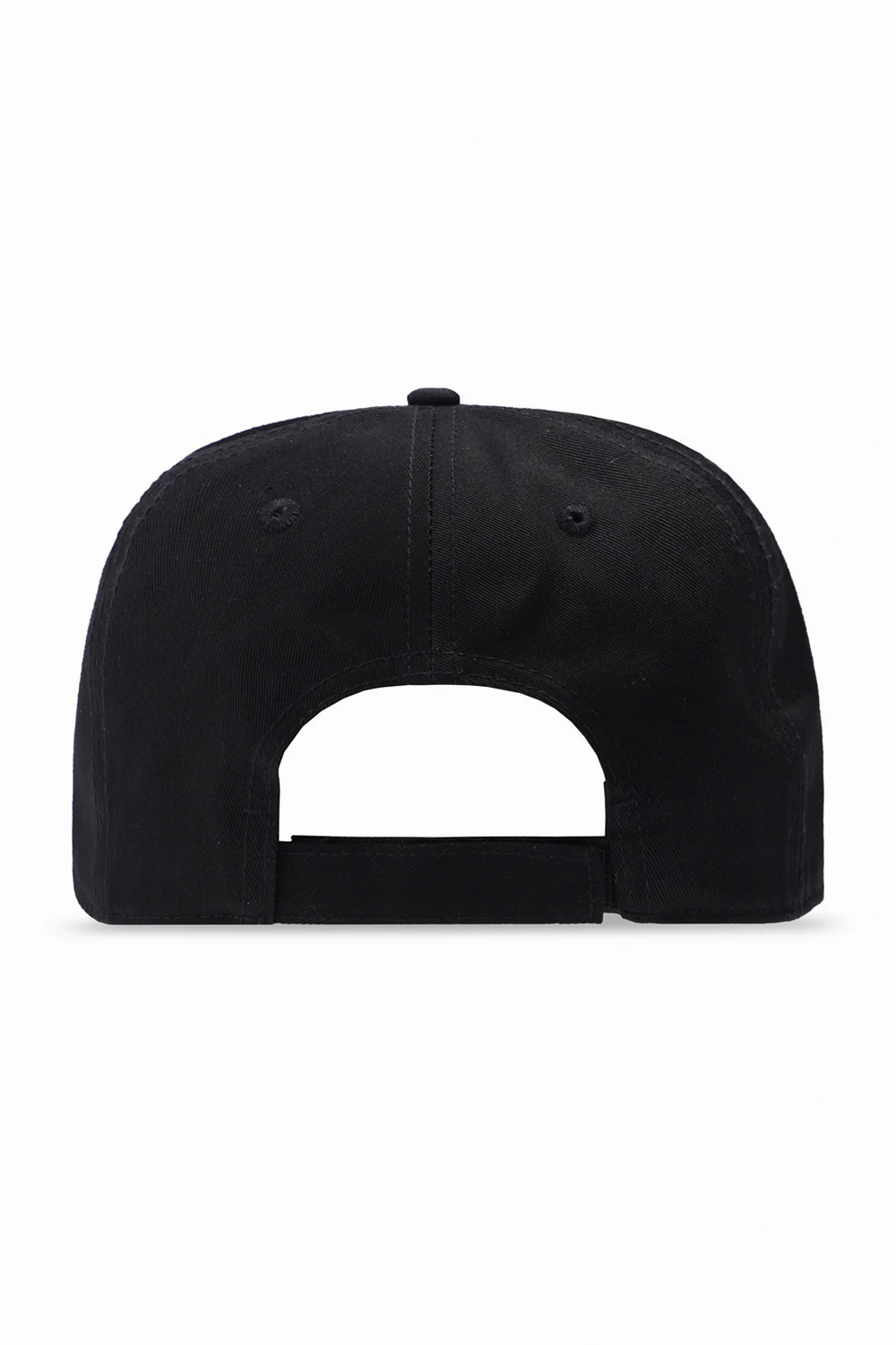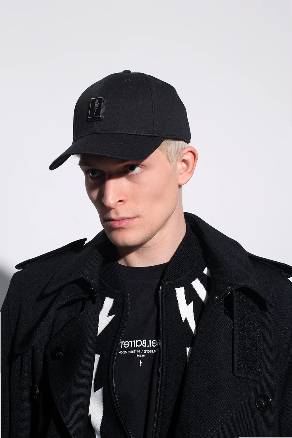 Czarna, bawełniana czapka z daszkiem Neil Barrett. Z przodu ozdobiona wypukłą aplikacją z logo w kolorze czarno-srebrnym. W tyłu pasek zapinany na rzep.