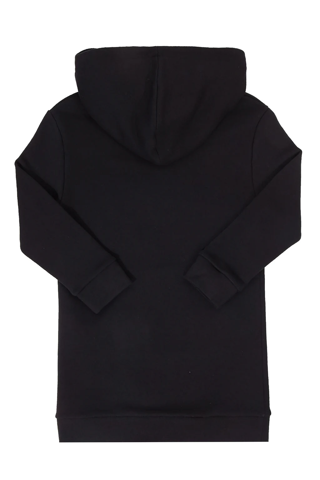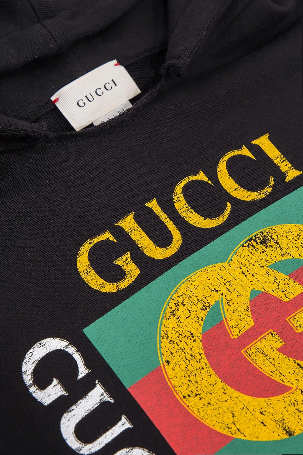 Czarna, bawełniana, dresowa sukienka z kapturem Gucci. Z przodu nadruk z żółto-białym logo oraz charakterystycznym dla marki zielono-czerwono-zielonym paskiem ‘Web’. Dwie wsuwane kieszenie. Dół i rękawy zakończone ściągaczami.