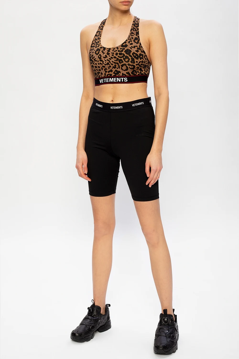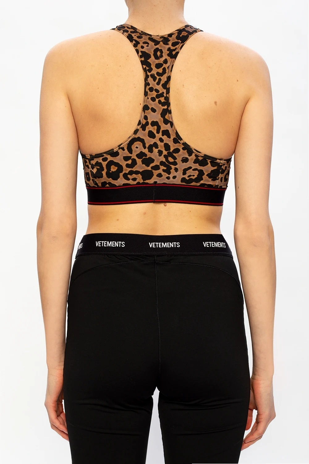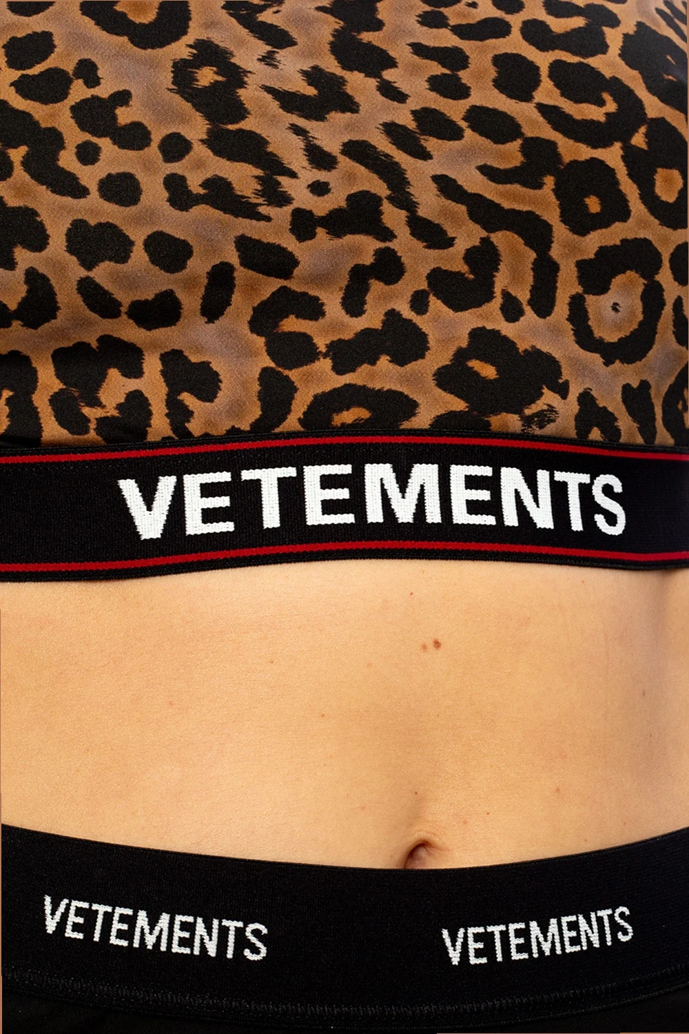 Brązowo-czarny biustonosz sportowy VETEMENTS. Na dole czarna guma z wyszytym logo w kolorze biało-czerwonym.