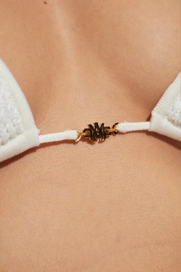 Dwustronny kostium kąpielowy marki Amiri to kwintesencja wyrafinowanego stylu, będącego esencją ekskluzywnej mody inspirowanej duchem wolności i wyrafinowanego buntu. Zjawiskowy, dwuczęściowy fason typu bikini podkreśla sylwetkę za sprawą trójkątnego stanika wiązanego na szyi i plecach oraz majtek z subtelnymi troczkami, kunsztownie wykończonymi dekoracyjnymi, złotymi końcówkami.