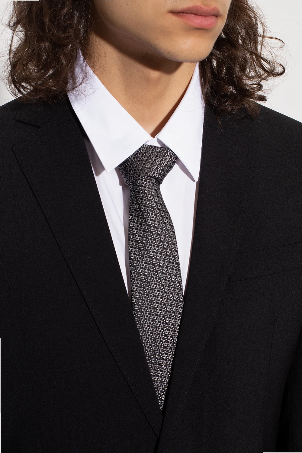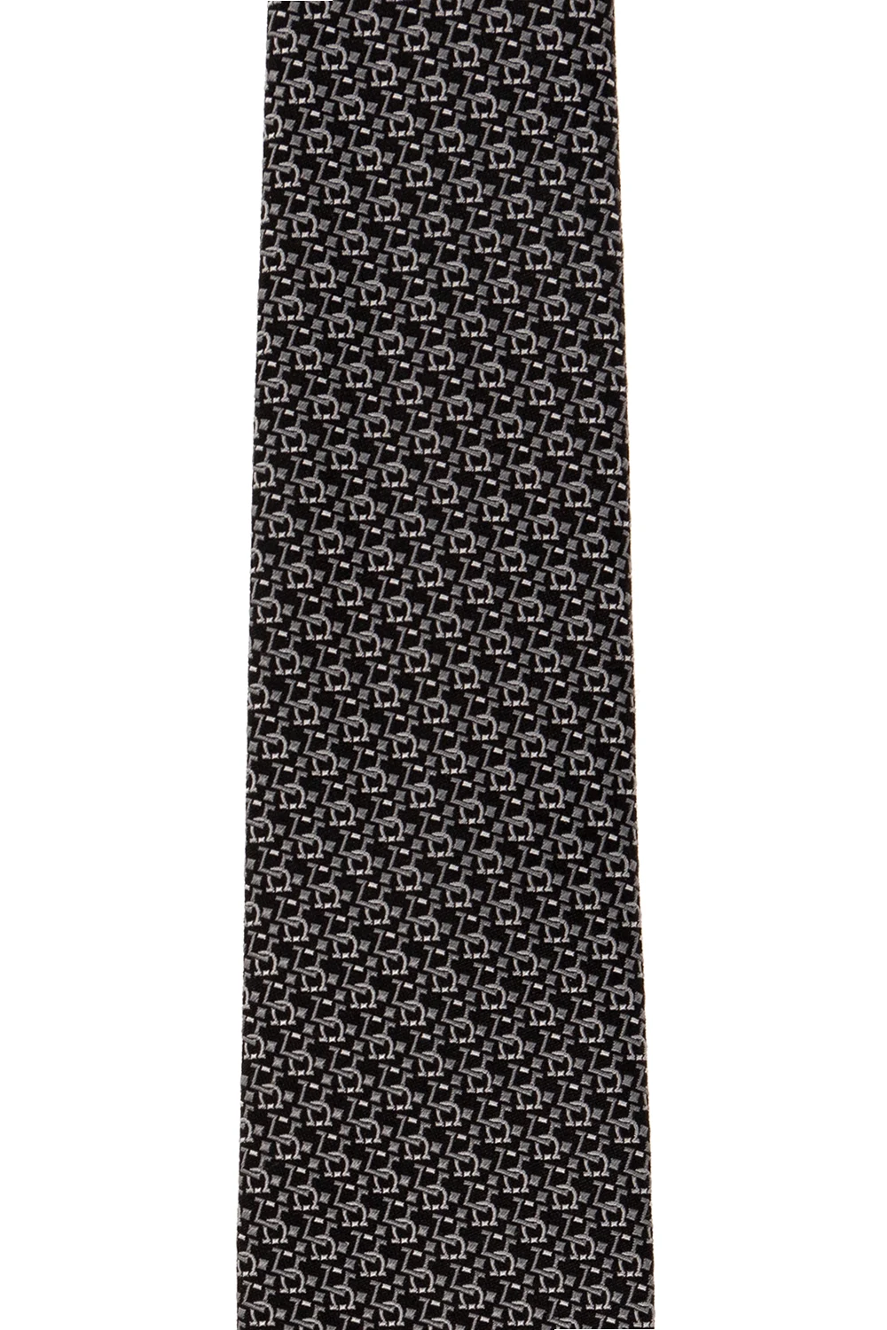 Czarny, jedwabny krawat Salvatore Ferragamo. Ozdobiony szarym, charakterystycznym wzorem ‘Gancini’.