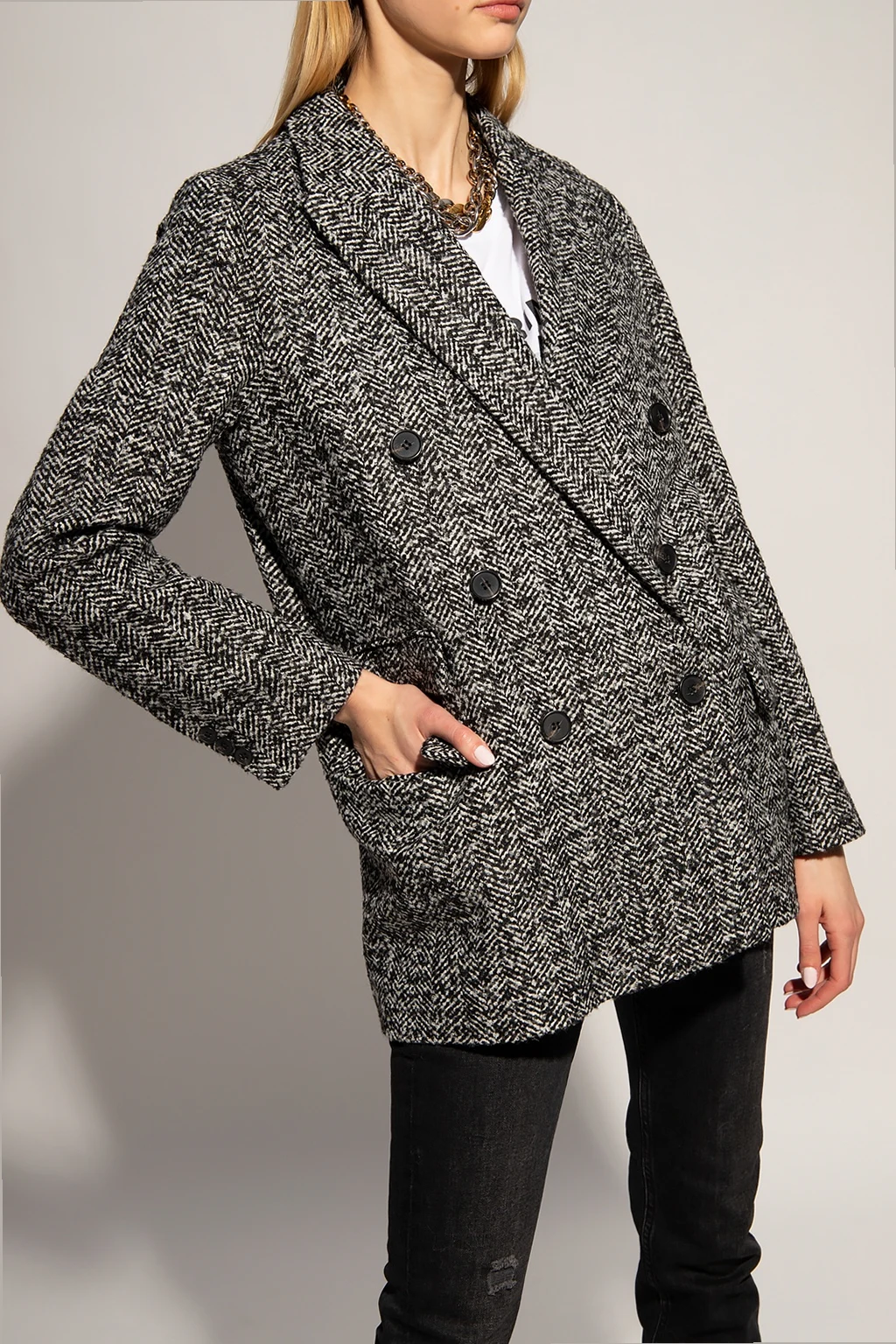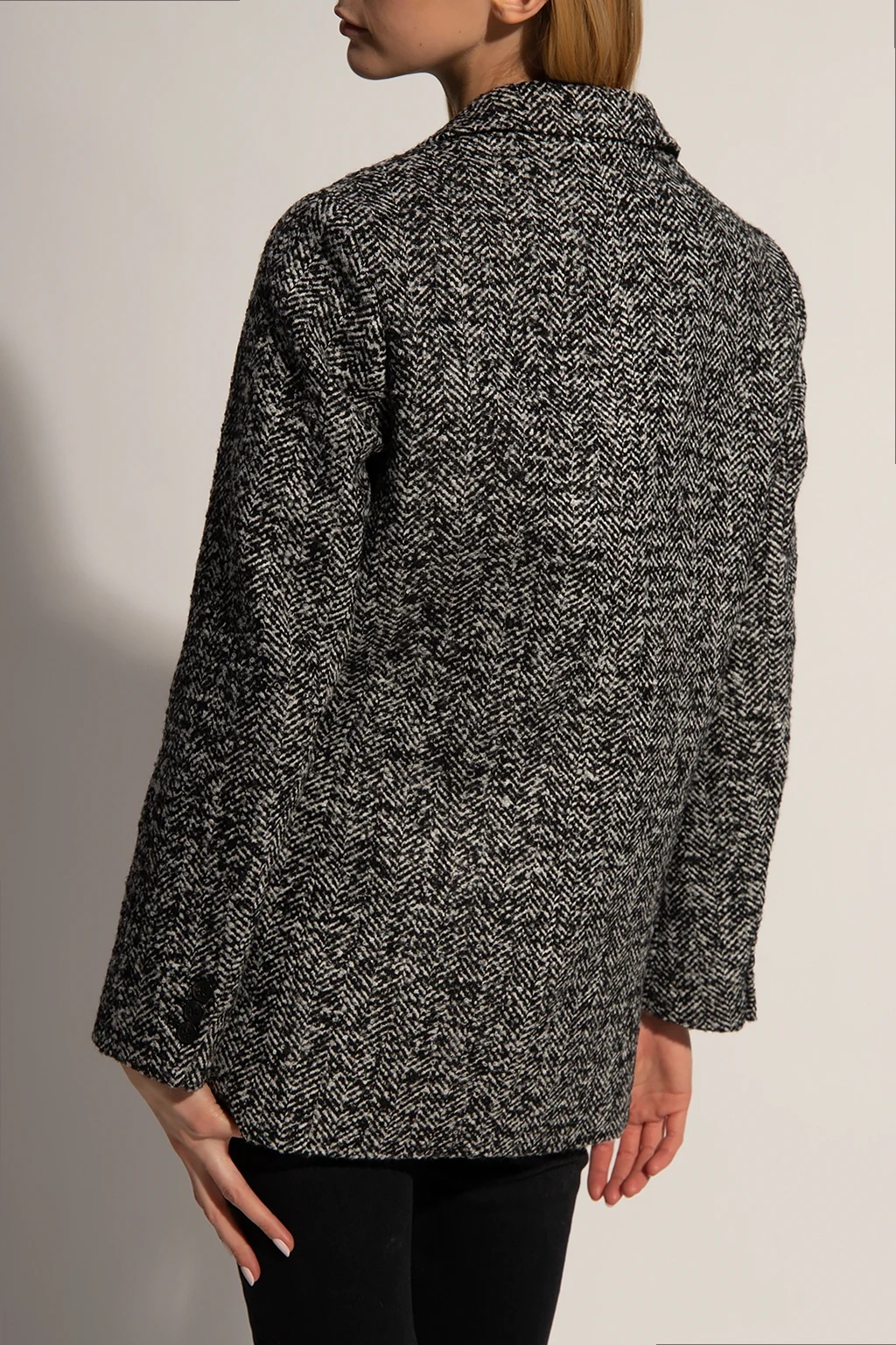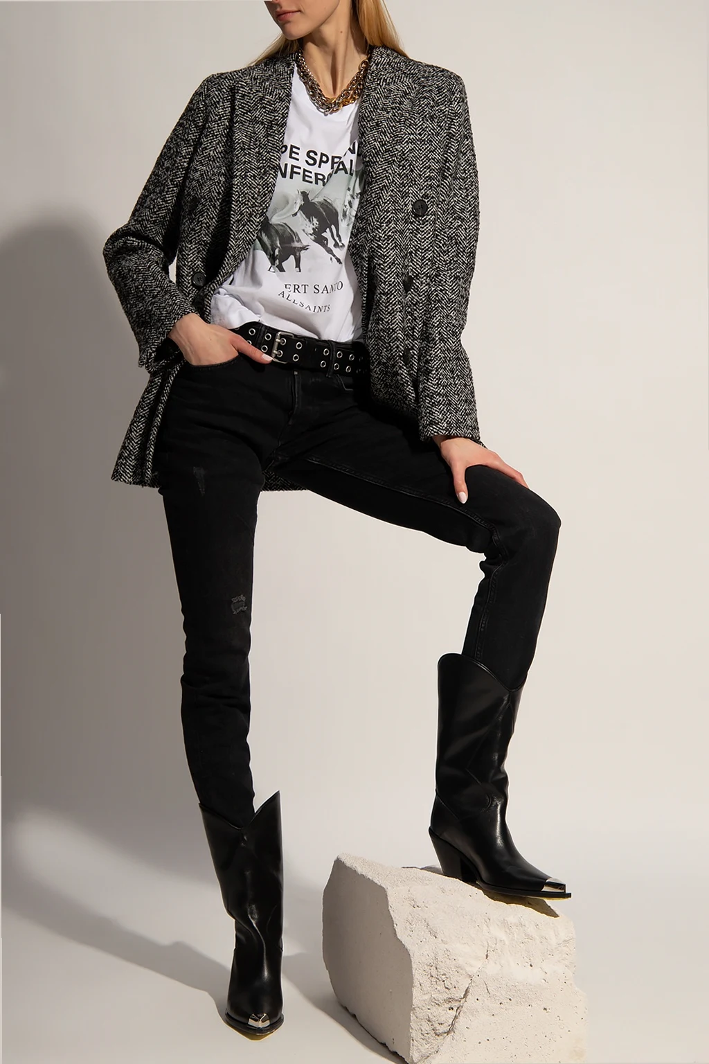 Czarno-biała kurtka z otwartymi klapami, model 'Parker' AllSaints. Zapinana na guziki. Ozdobiona wyszytym wzorem. Z przodu cztery kieszenie: jedna wsuwana oraz trzy wsuwane z patką. Z tyłu pojedyncze rozcięcie.