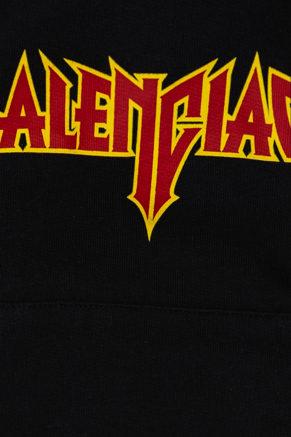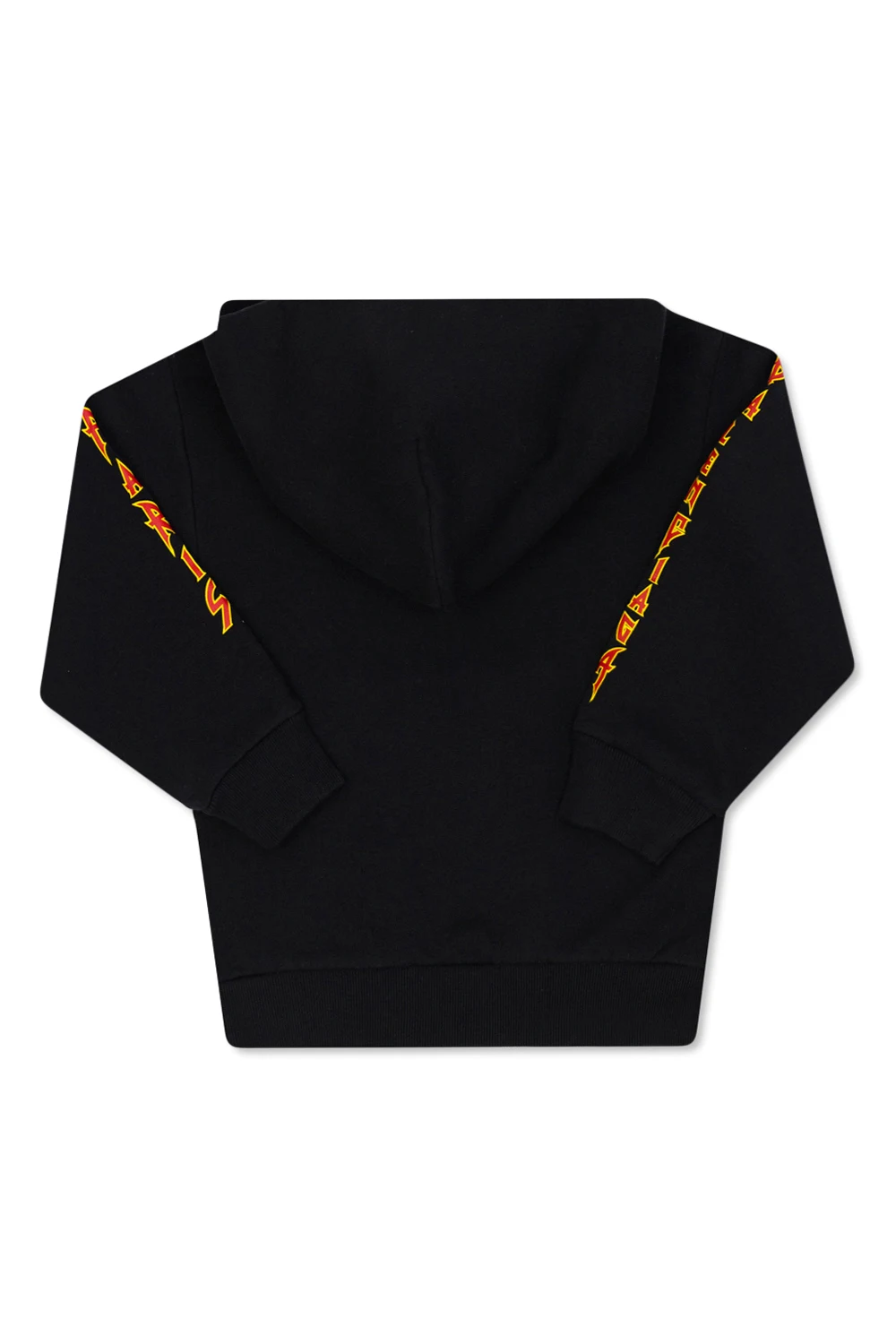 Czarna bluza z kapturem Balenciaga Kids. Wykonana z bawełny. Ozdobiona czerwono-żółtym wzorem. Dwie kieszenie wsuwane. Dół i długie rękawy wykończone ściągaczem.