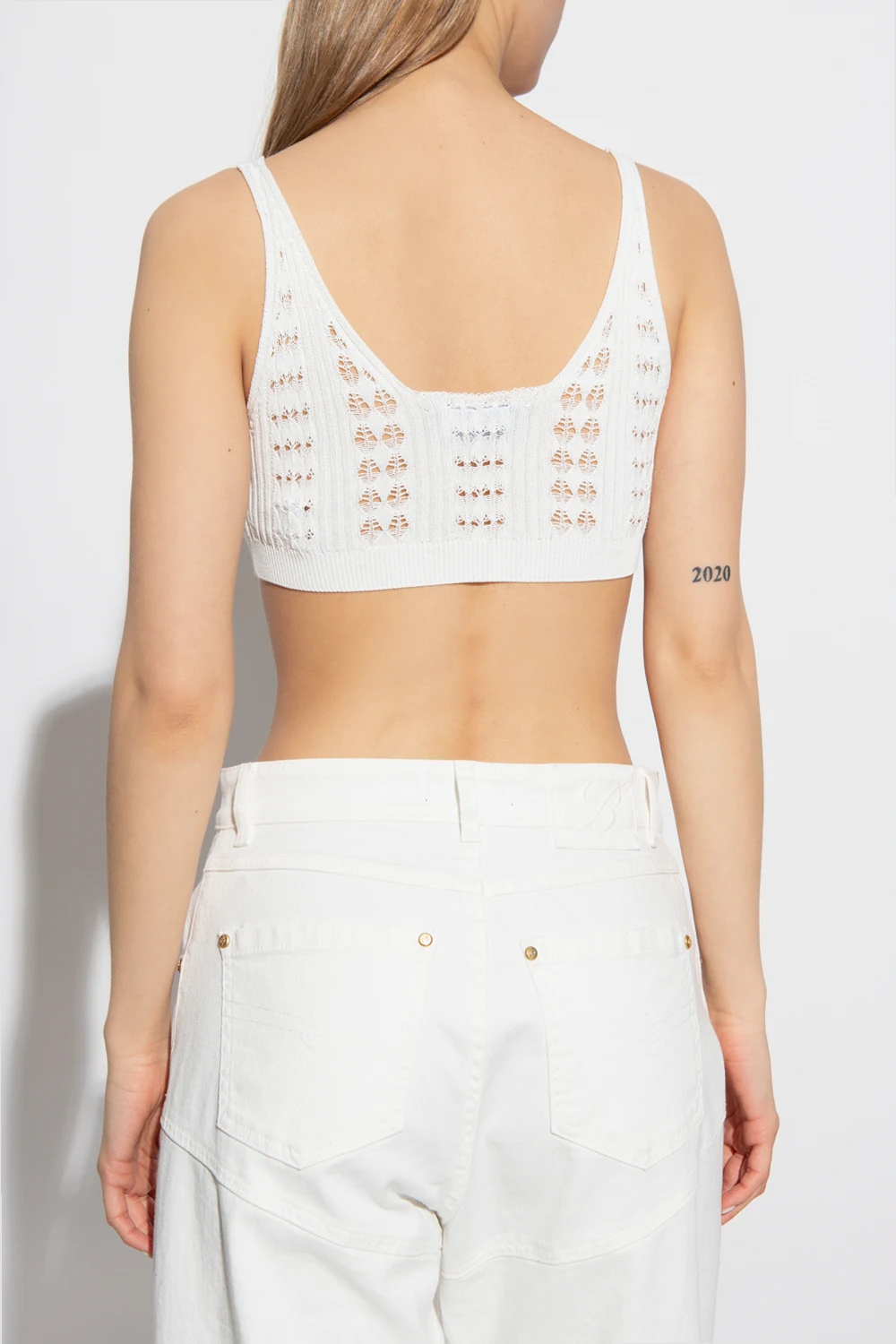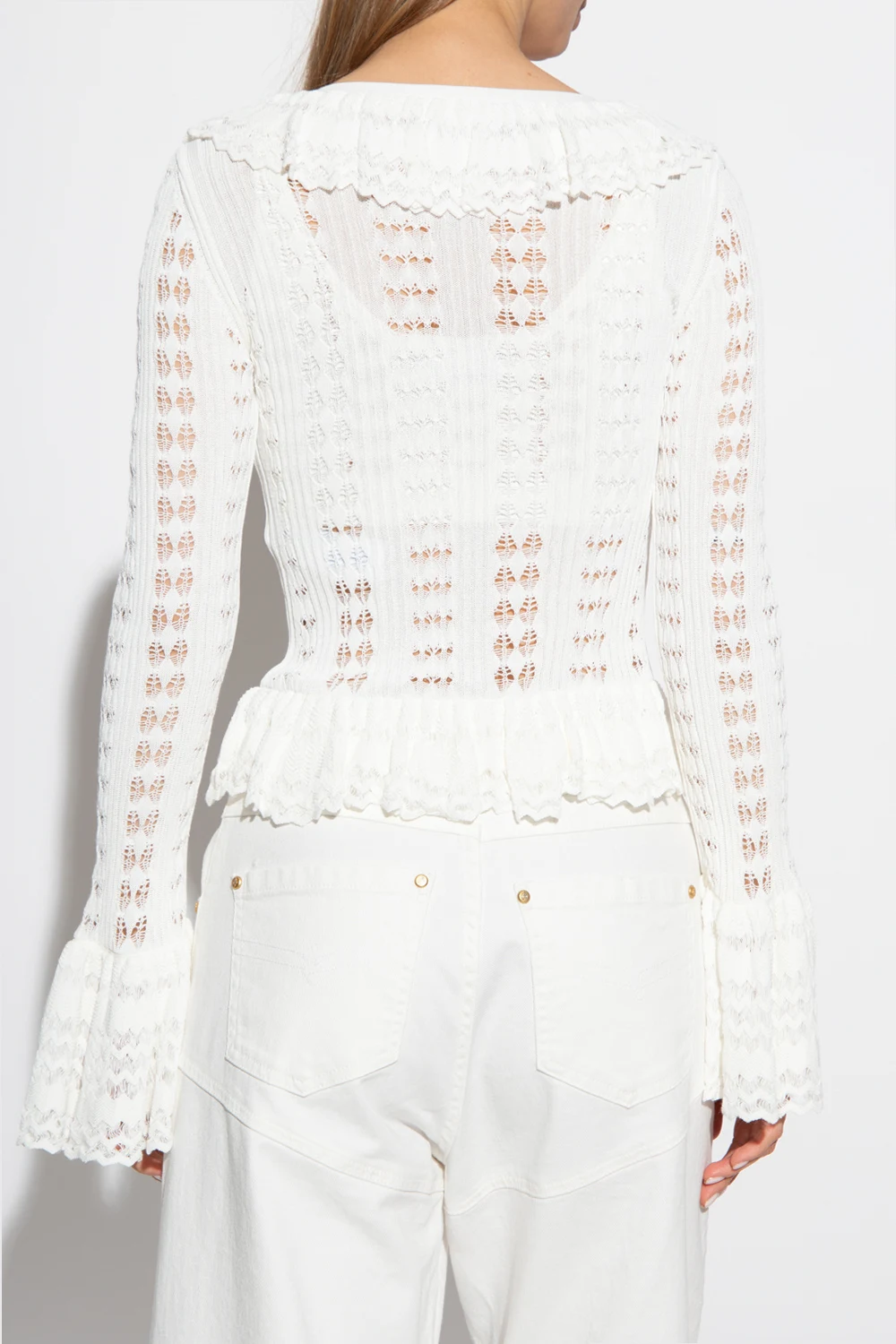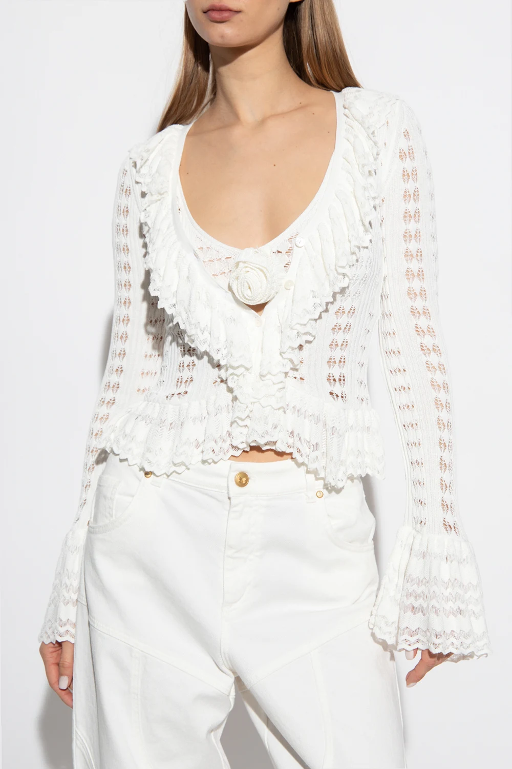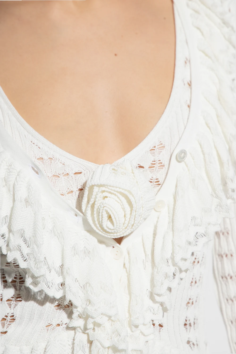 Biały zestaw: kardigan i top Blumarine. Wykonany z materiału ozdobionego ażurowym wzorem. Kardigan o dopasowanym kroju zapinany z przodu na guziki. Dekolt w serek, przód, długie rękawy i dół wykończone falbanami. Krótki top na ramiączkach wykończony ściągaczem i ozdobiony odpinaną broszką w kształcie kwiatu, zapinaną na szpilkę.