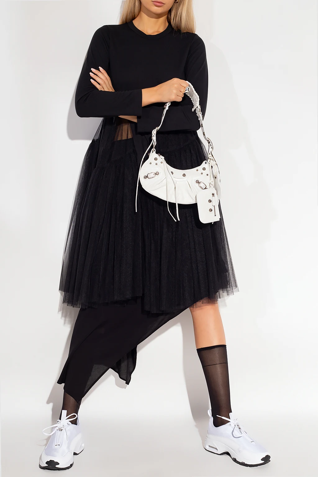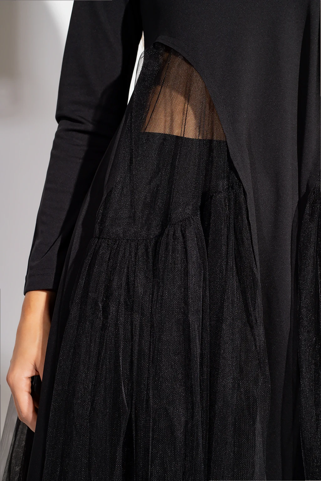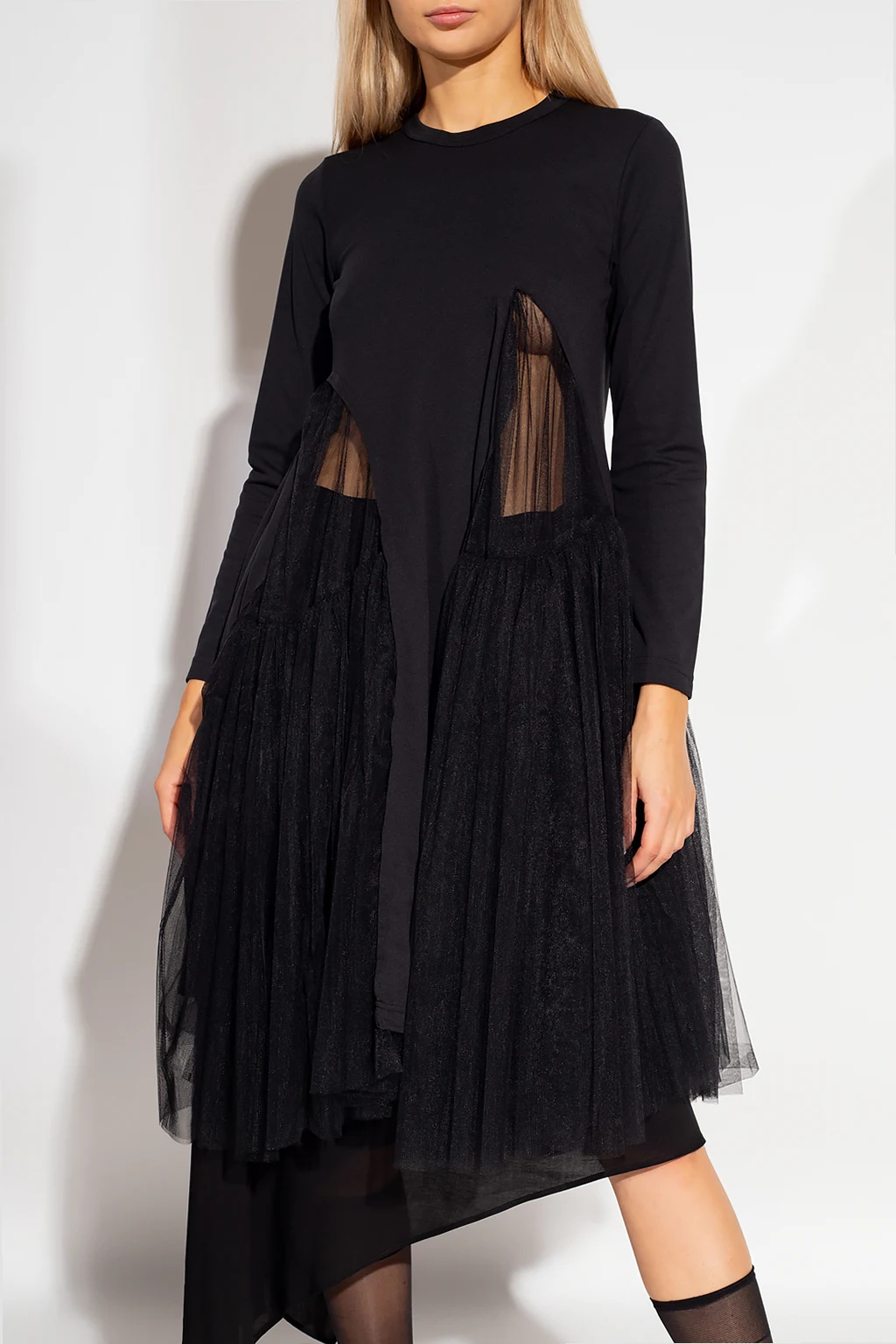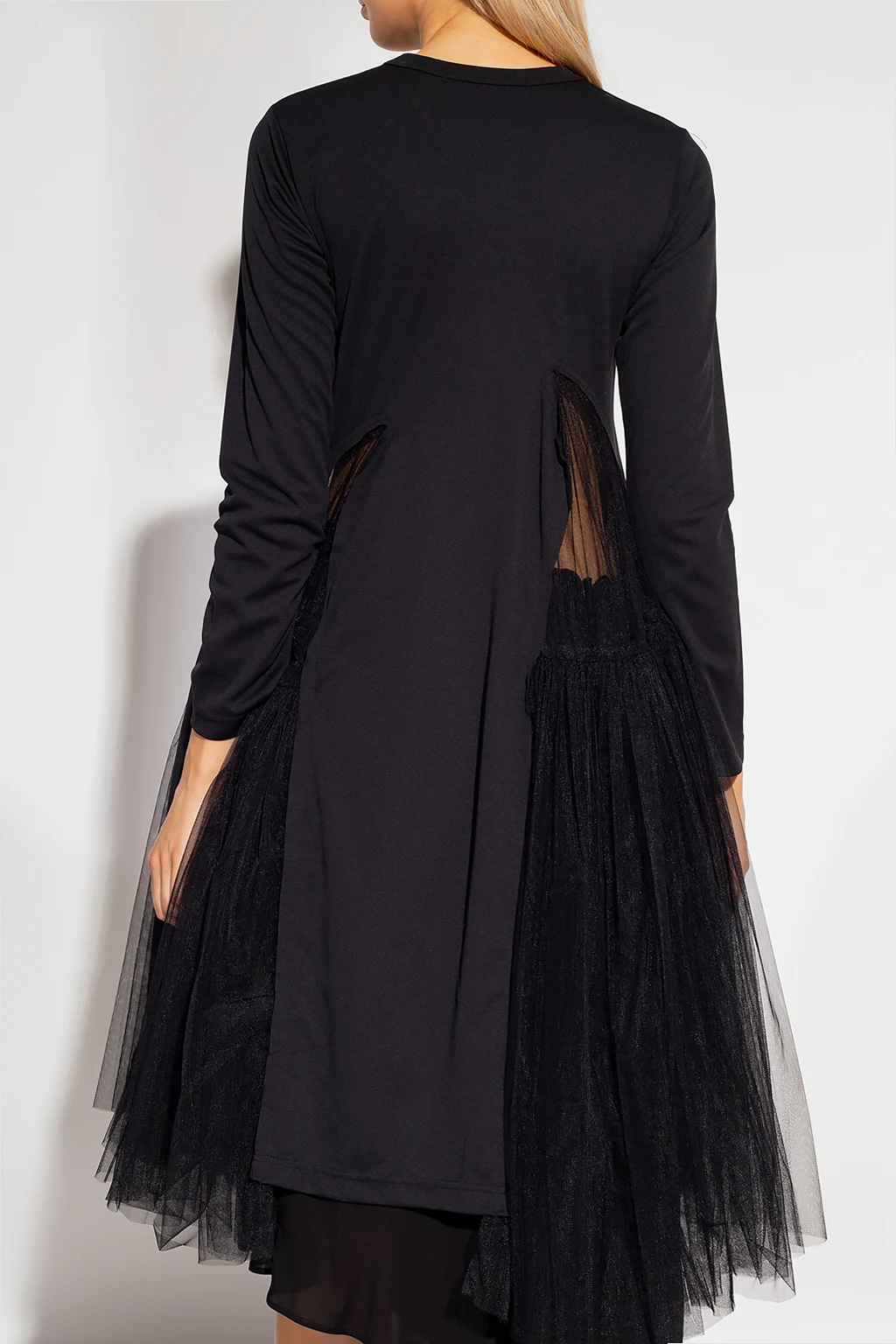 Czarna sukienka z tiulowym wykończeniem Comme des Garcons. Okrągły dekolt. Długie rękawy.