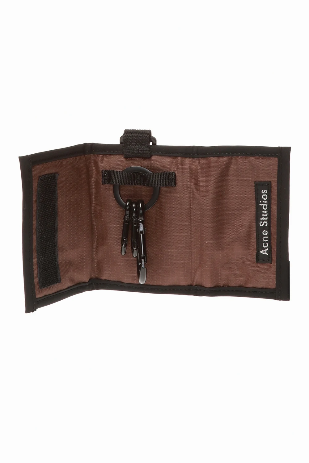 Czarne etui na klucze z paskiem na szyję Acne Studios. Zapinane na rzep. Ozdobione naszywką z charakterystycznym dla marki motywem emotikony. Z tyłu wsuwana kieszeń wykończona siatką. Wewnątrz metalowa obręcz z trzema karabińczykami.