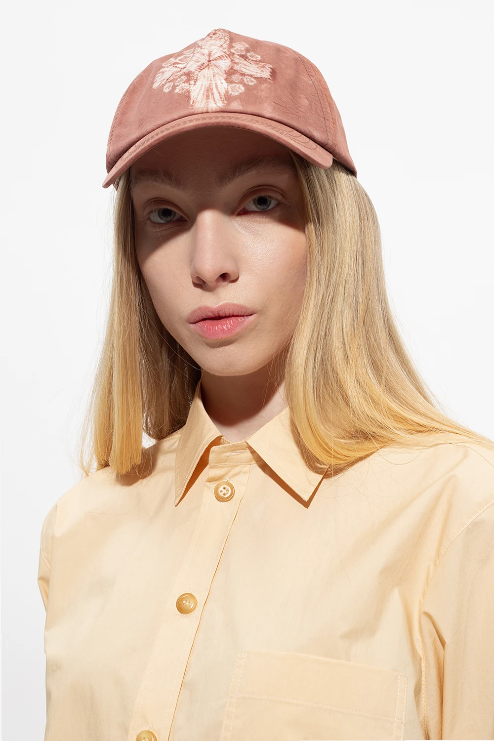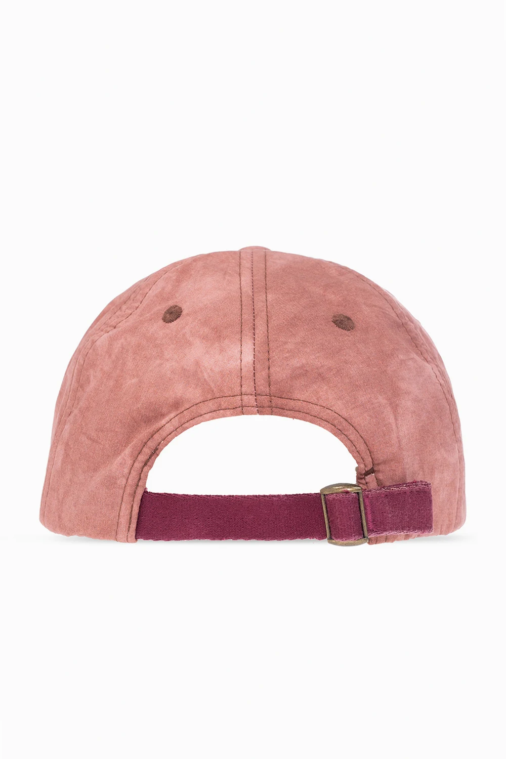 Pudroworóżowa czapka z daszkiem Acne Studios. Wykonana z bawełny. Z przodu ozdobiona białym nadrukiem. Z tyłu bordowy, regulowany pasek z klamrą.