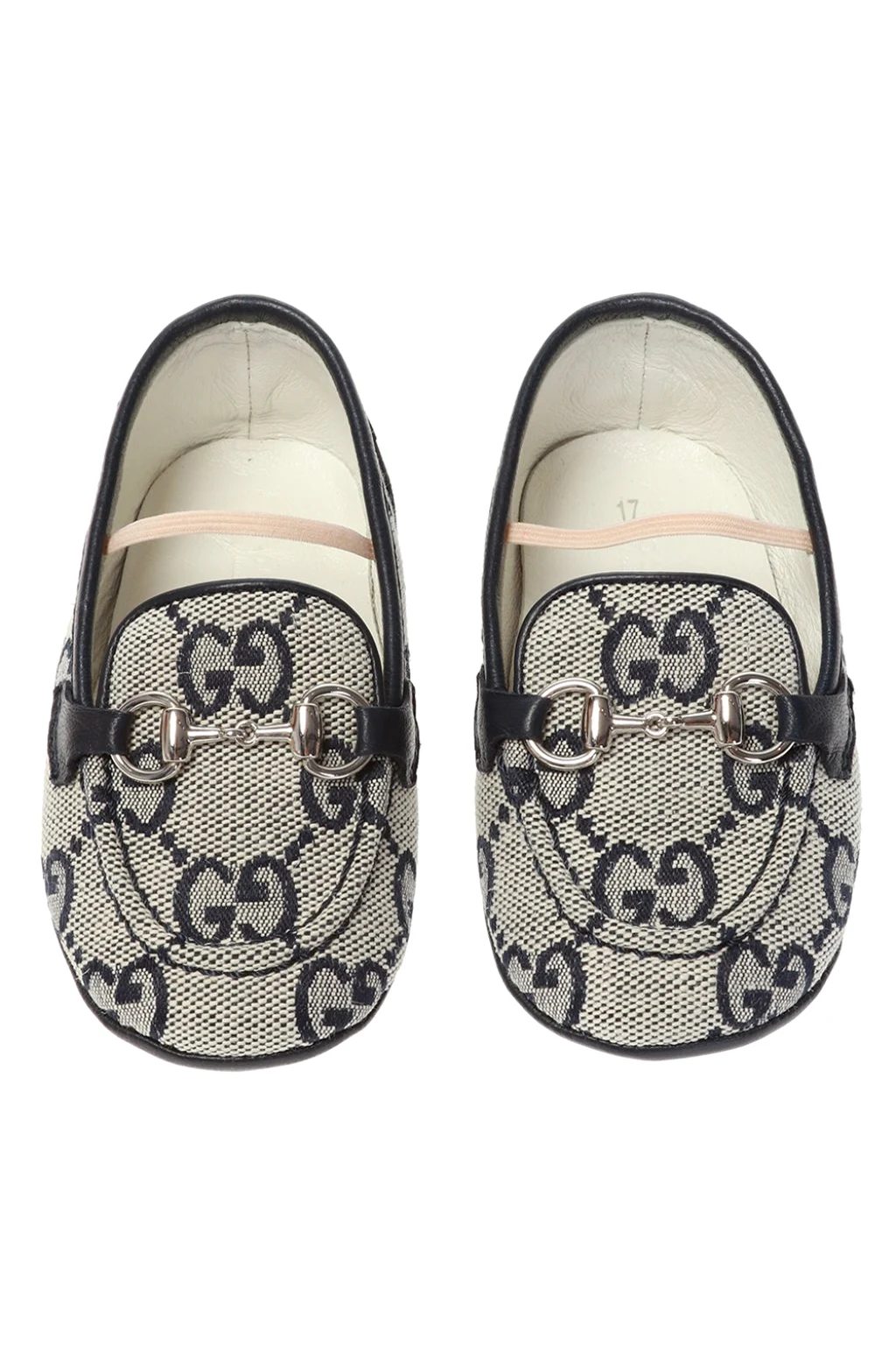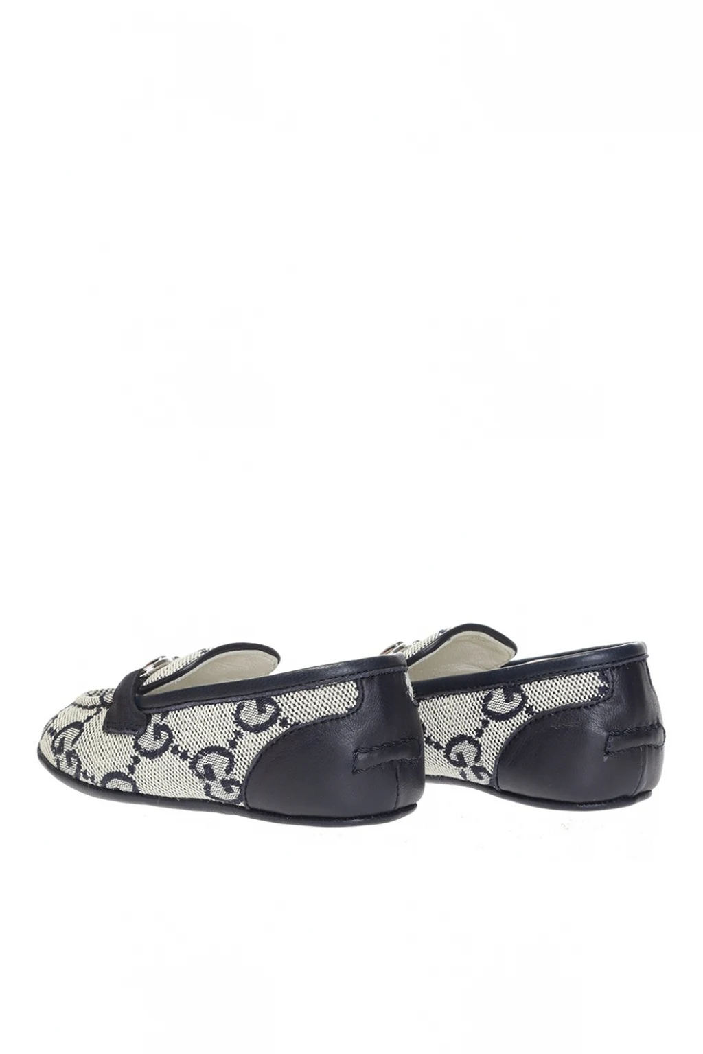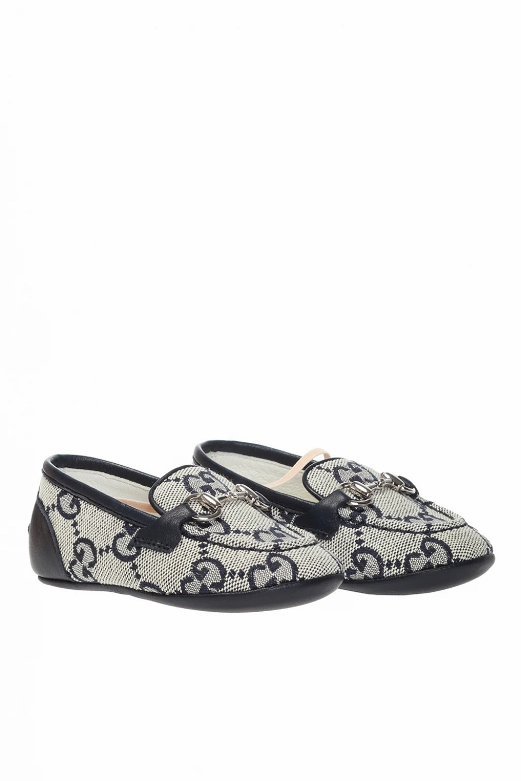 Niebiesko-szare buty typu ‘loafers’ Gucci Kids. Ozdobione wyszytym wzorem z logo. Ozdobione charakterystycznym dla marki wędzidłem w kolorze srebrnym. Granatowa, skórzana podeszwa.