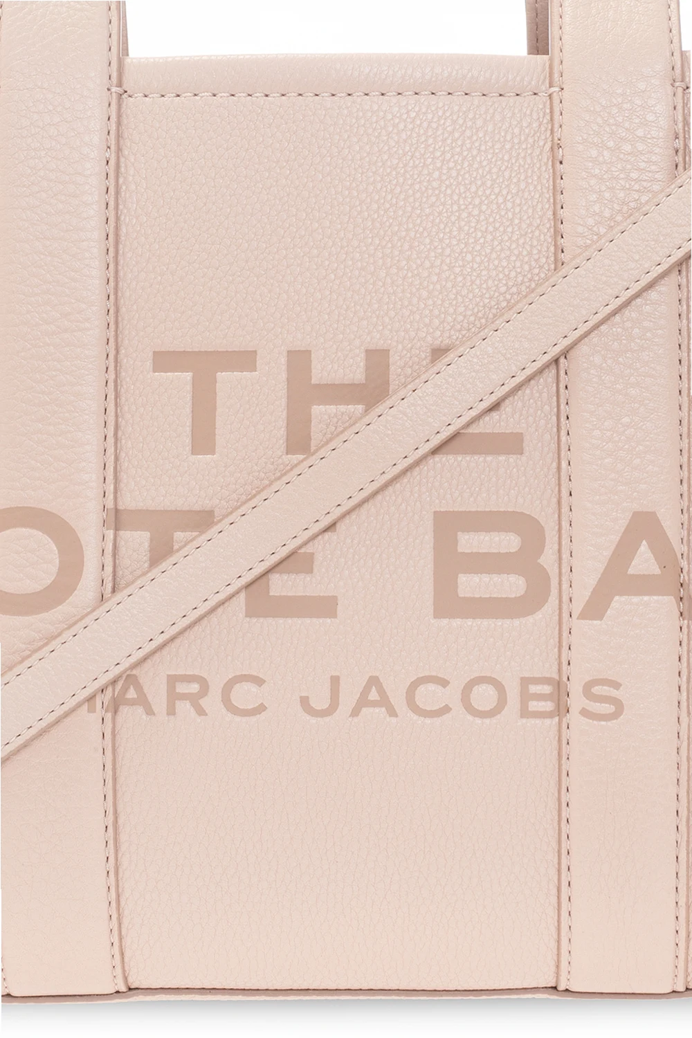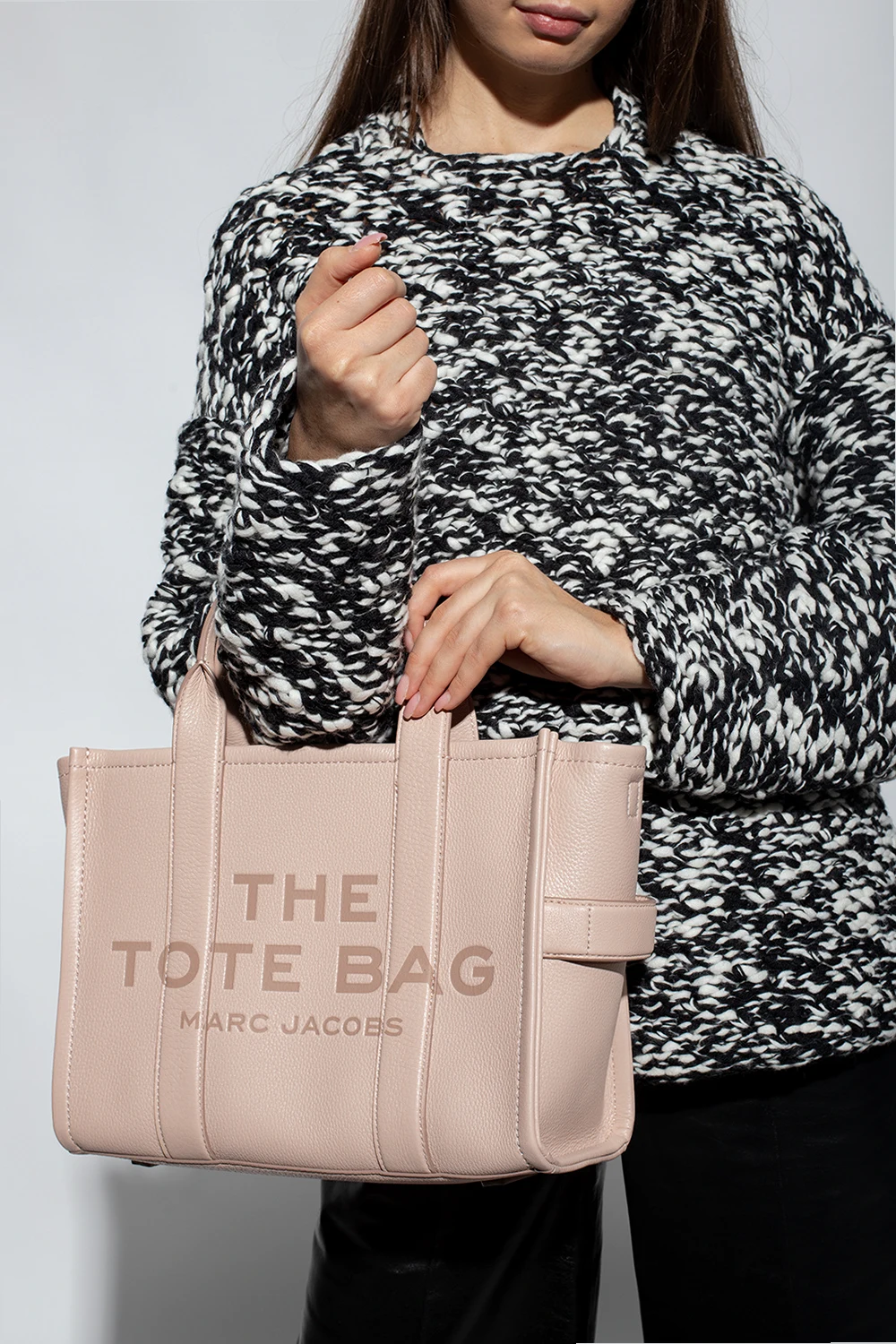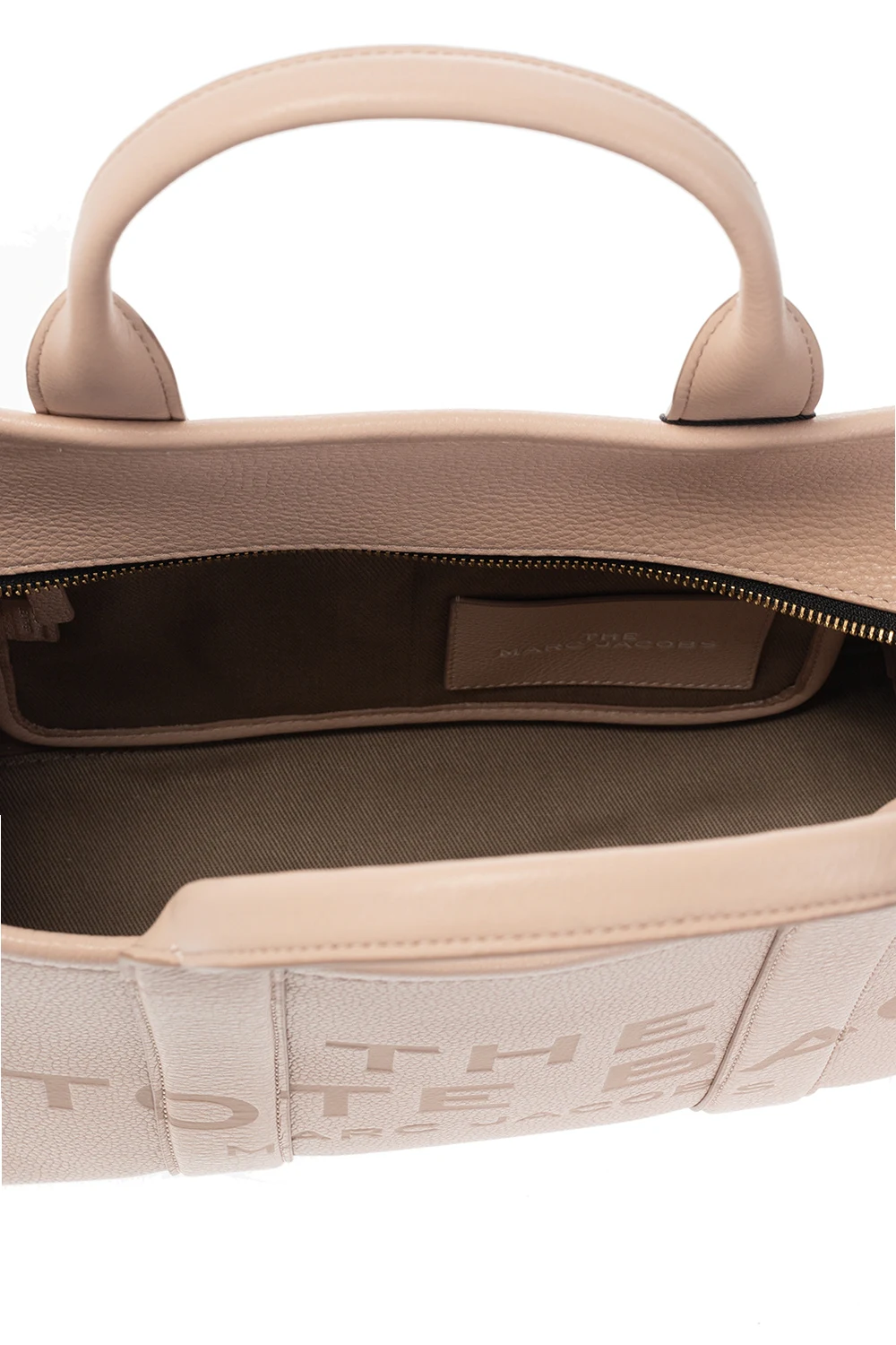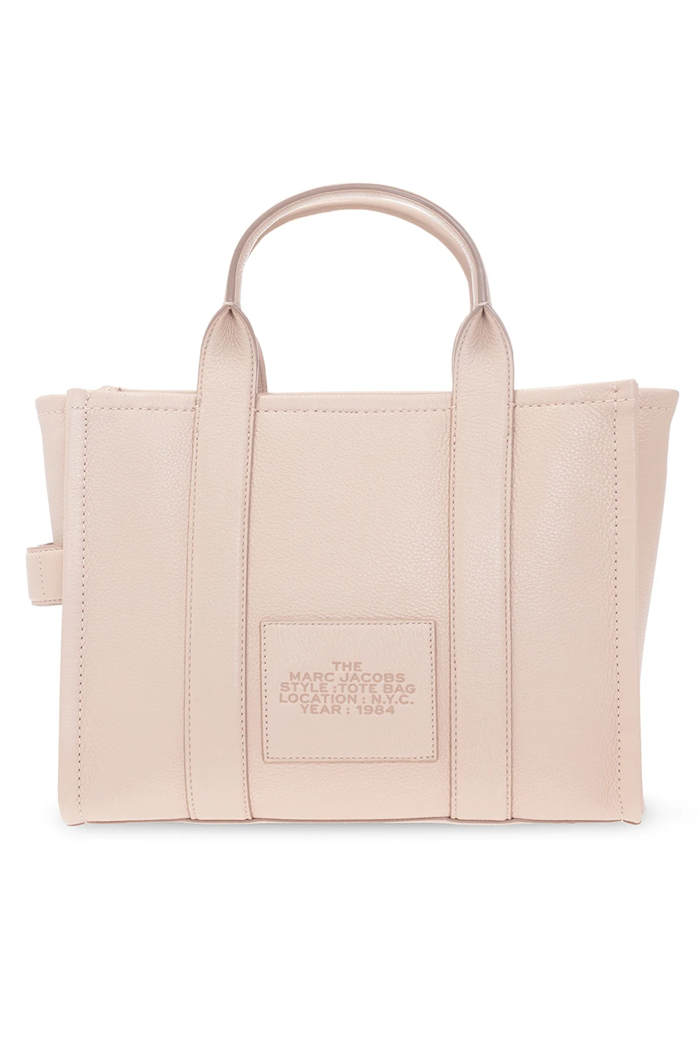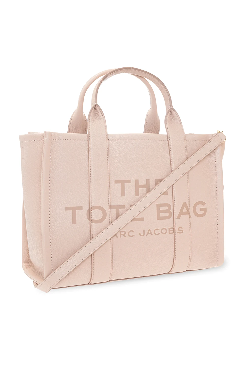 Jasnoróżowa torba typu ‘shopper’, model 'The Tote Medium' Marc Jacobs. Wykonana ze skóry bydlęcej. Ozdobiona wzorem z wytłoczonym logo. Dwie półokrągłe rączki. Pas na ramię. Wewnątrz komora oraz trzy kieszenie: dwie wsuwane oraz zamykana na zamek. Metalowe wykończenie w kolorze złotym.