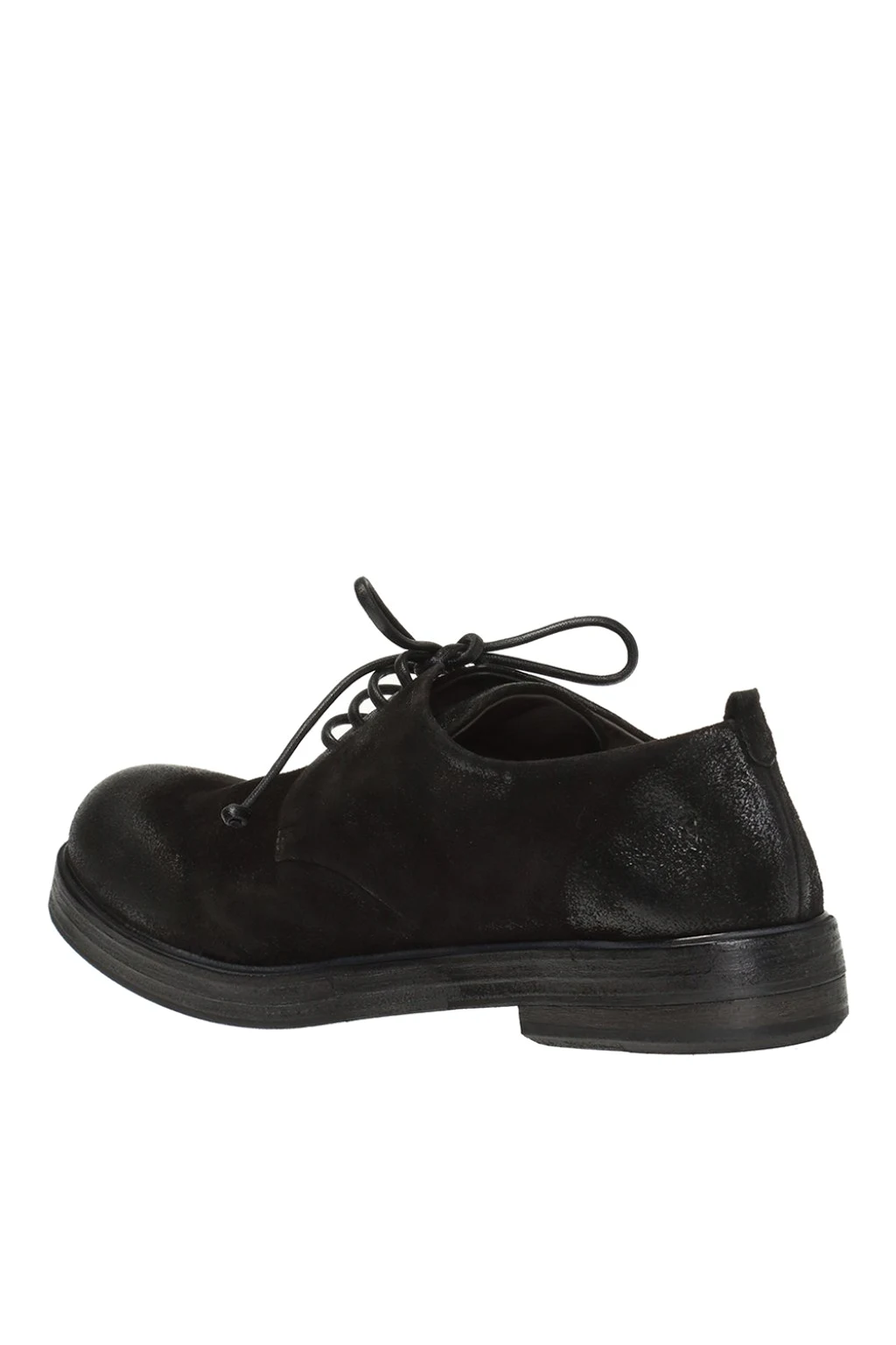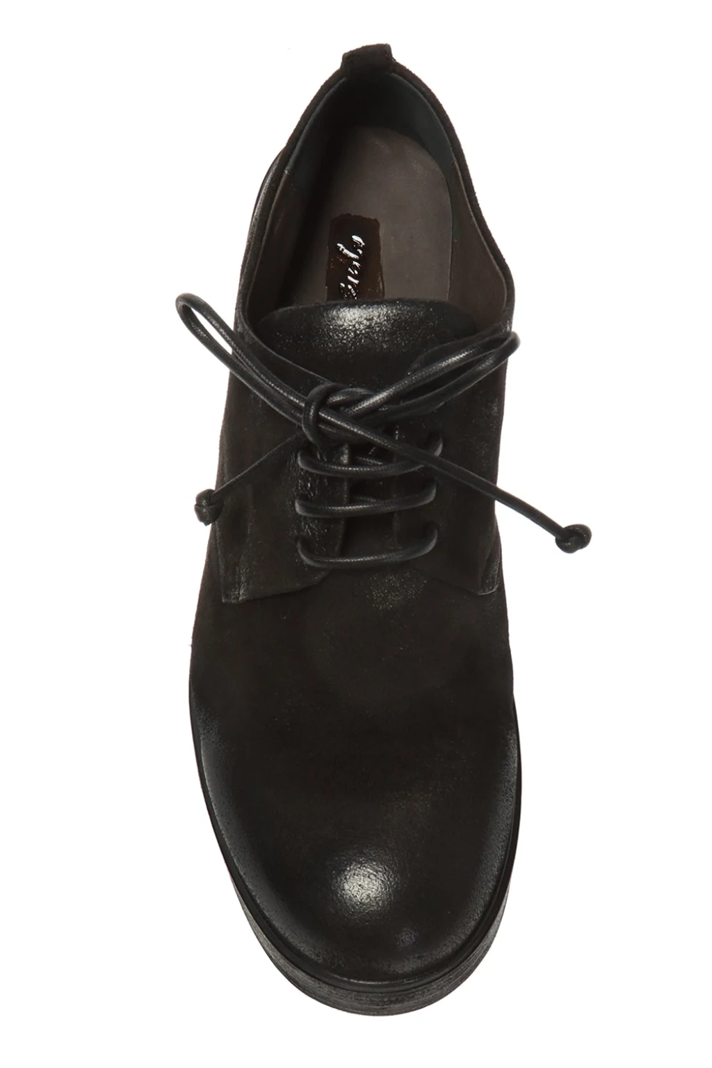 Czarne, zamszowe buty typu ‘derby’ z efektem znoszenia, model ‘Zucca Zeppa’ Marsll. Czarna, skórzana podeszwa z gumową wstawką.