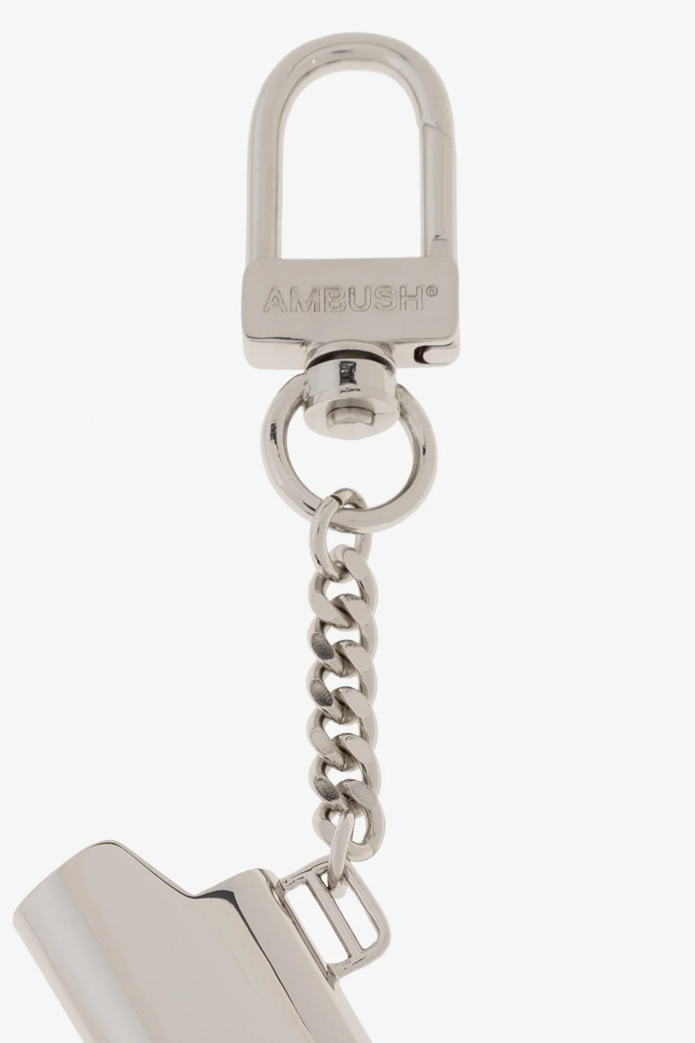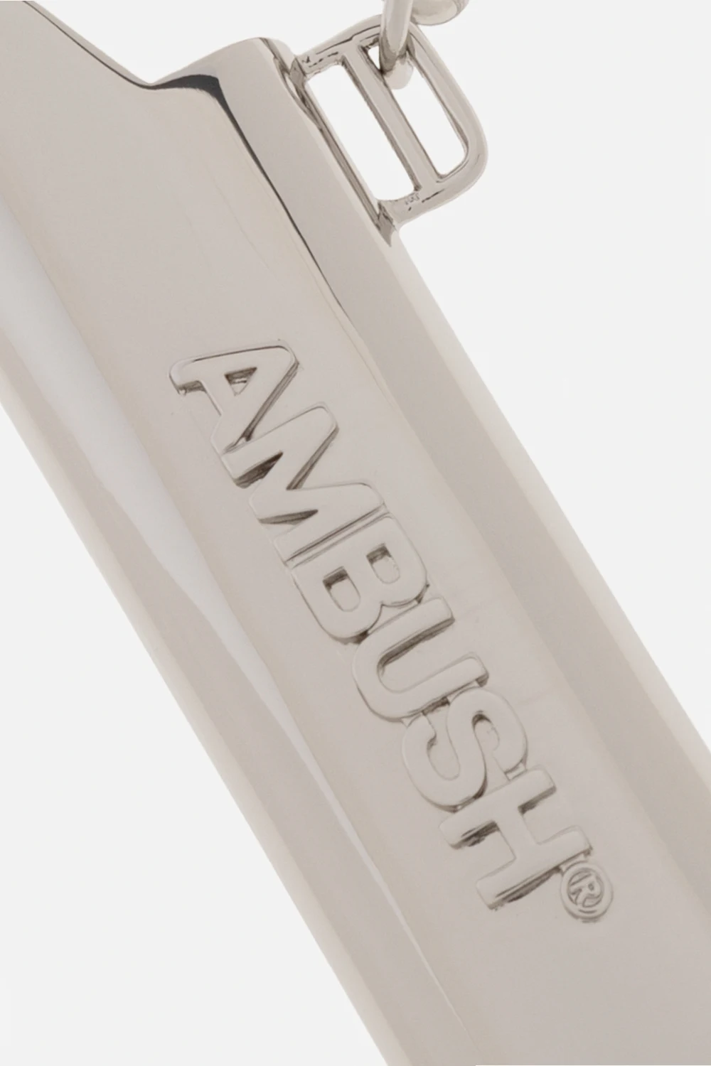 Mosiężny brelok w kolorze srebrnym Ambush. Zapinany na karabińczyk z wygrawerowanym logo. Zawieszka z etui na zapalniczkę z wypukłym logo.