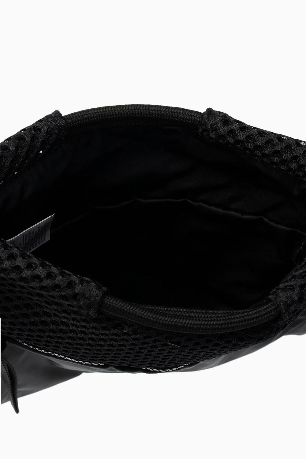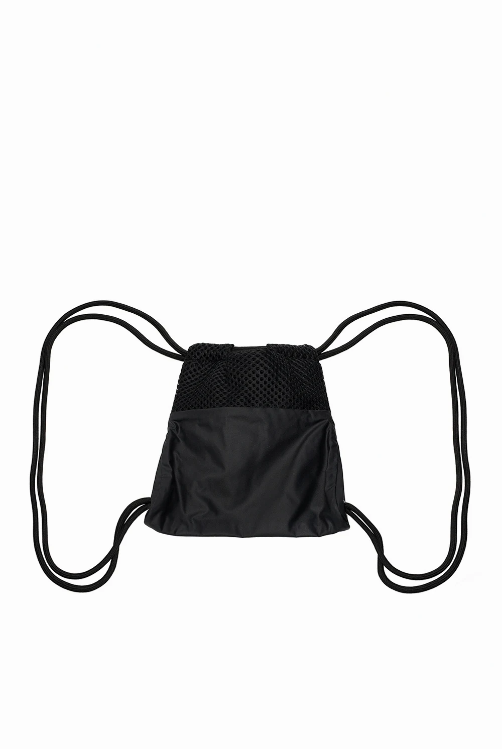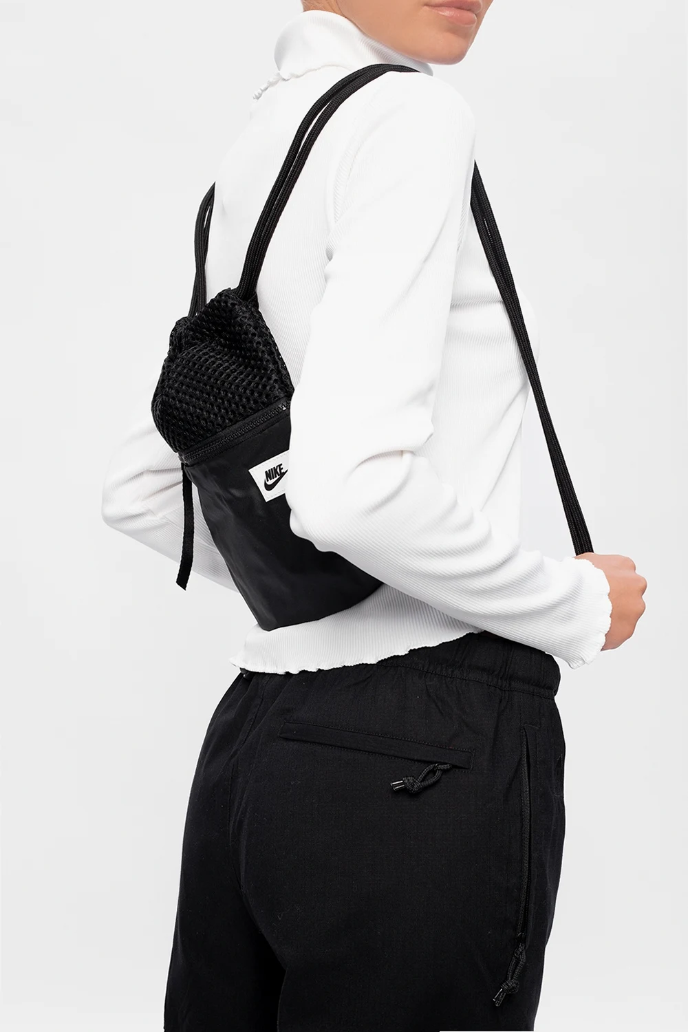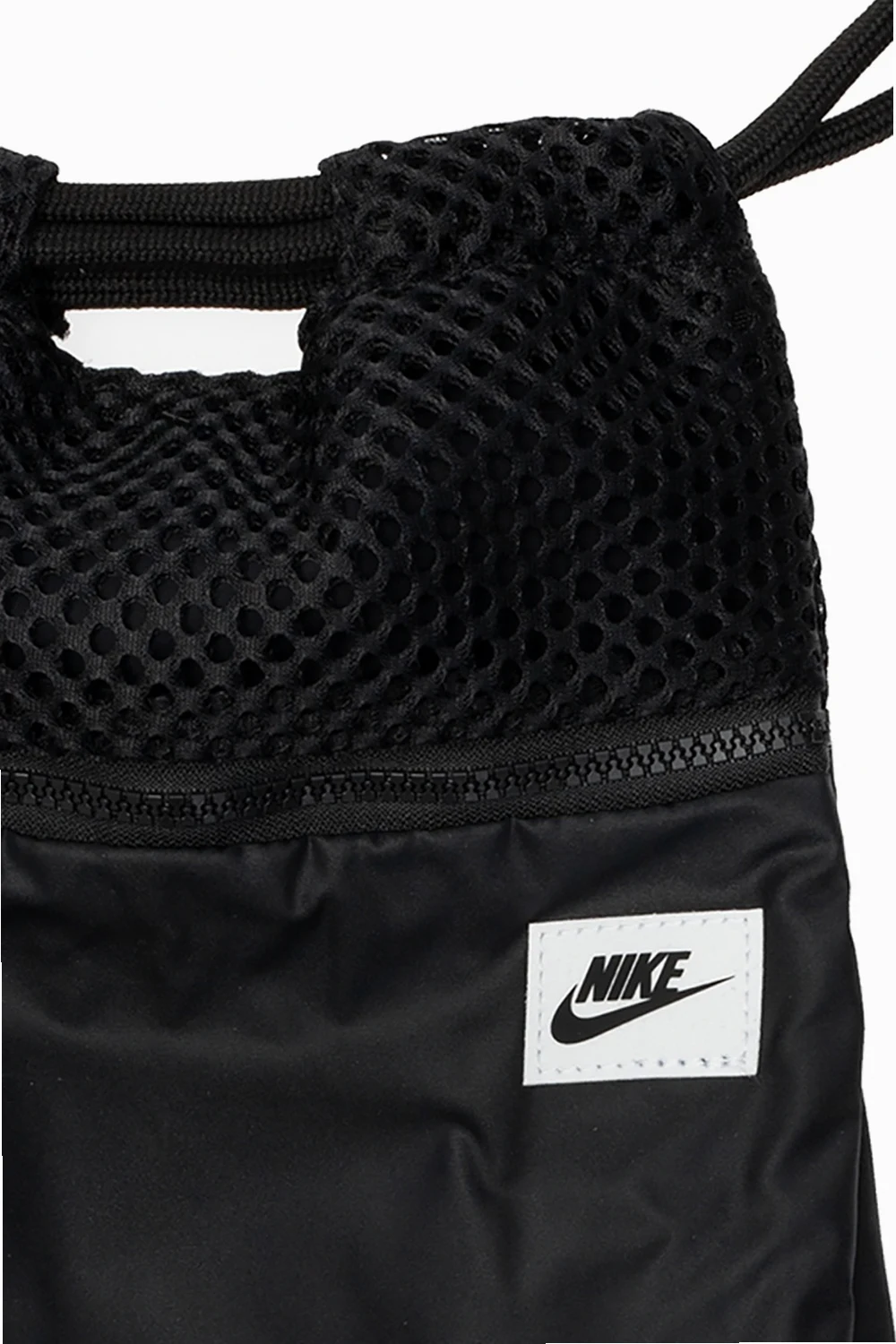 Czarny plecak typu ‘worek’ Nike. Wykończony siatką. Zapinany na magnetyczny zatrzask oraz ściągany trokami. Naszywka z gumową aplikacją z logo. Z przodu kieszeń zapinana na zamek. Podwójne szelki w formie sznurka. Wewnątrz komora.