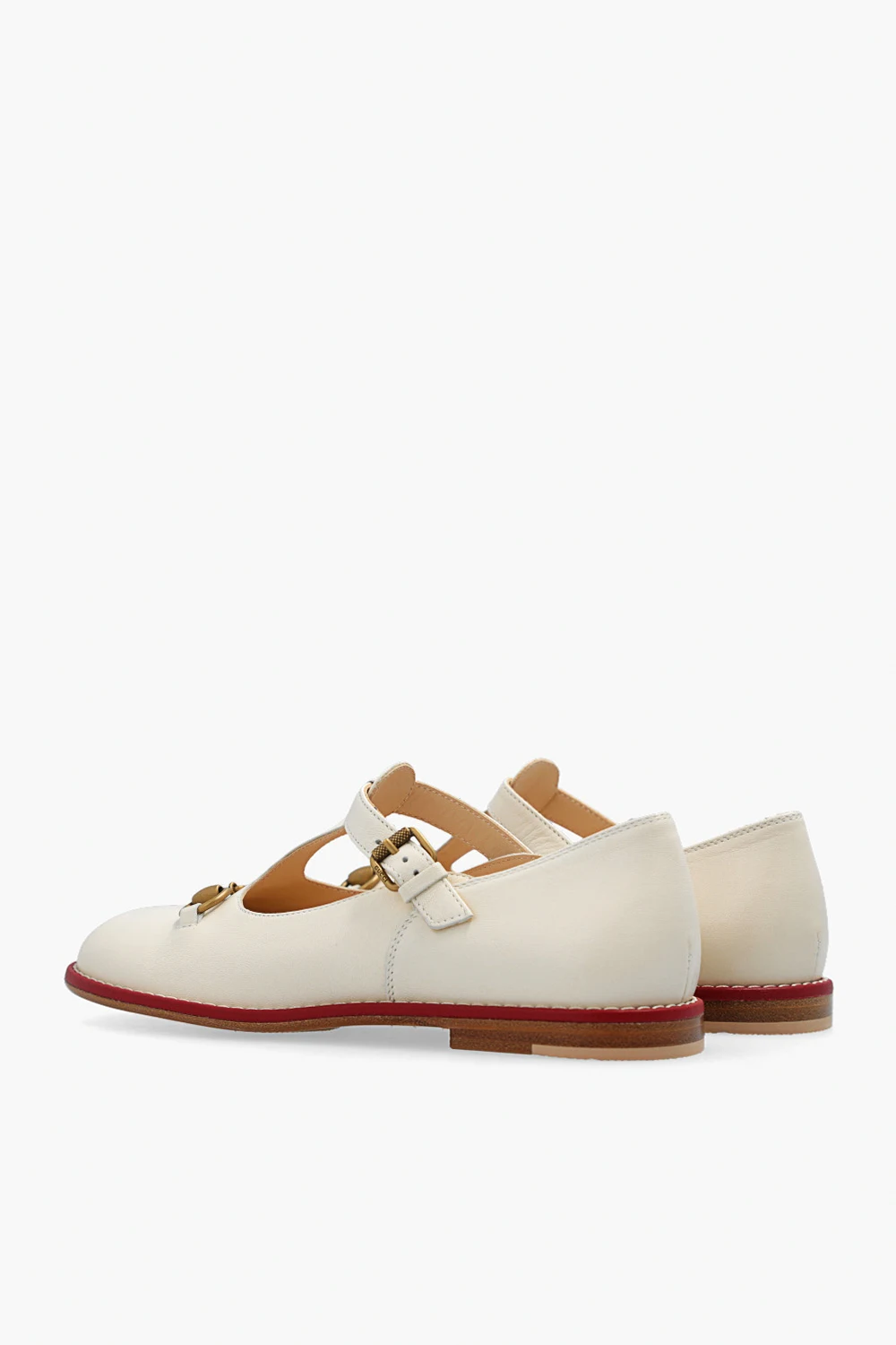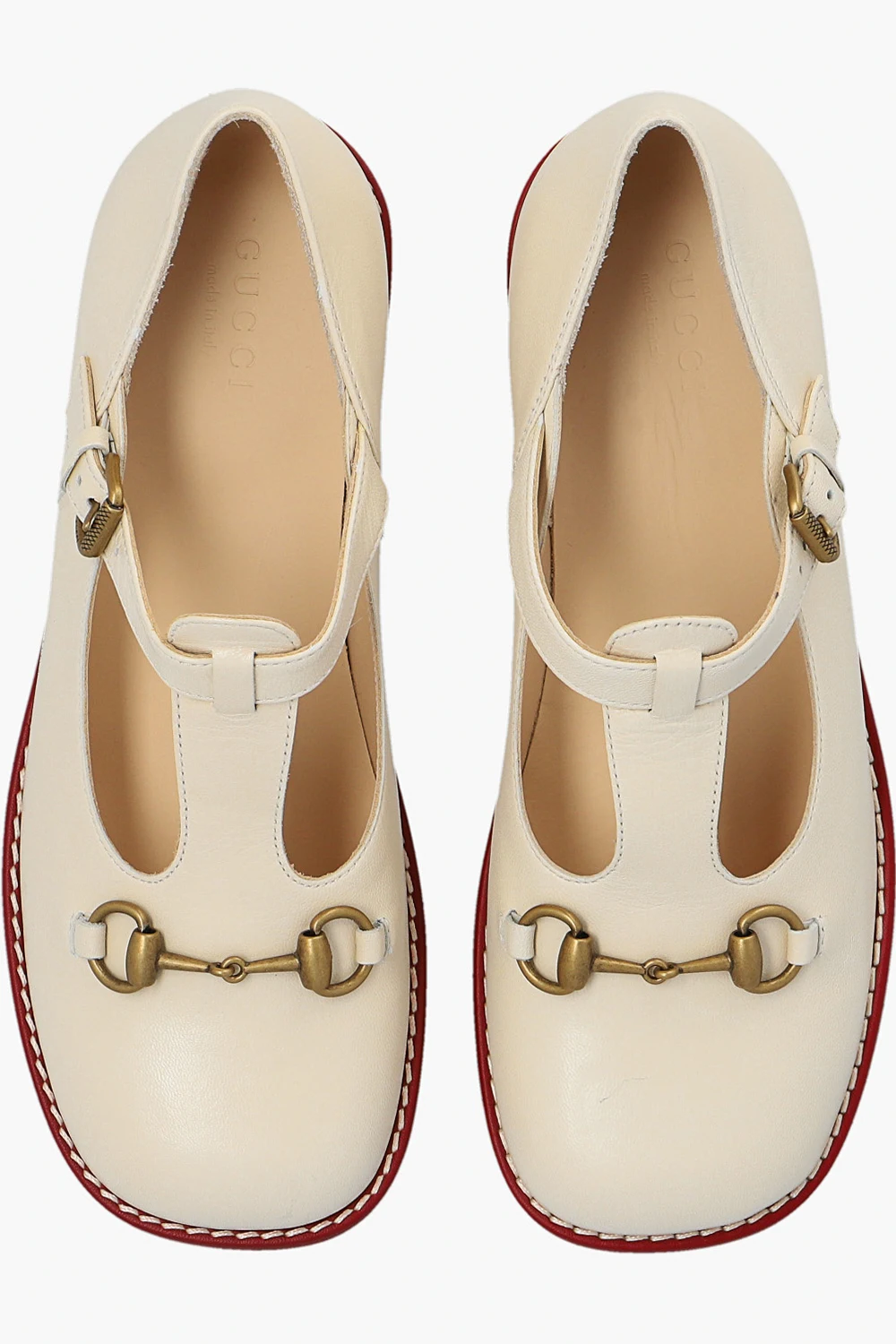 Kremowe buty Gucci Kids. Wykonane ze skóry. Z boku zapinane na regulowany pasek z klamrą. Z przodu ozdobione charakterystycznym wędzidłem w kolorze postarzanego złota. Beżowo-brązowo-czerwona, gumowa podeszwa.