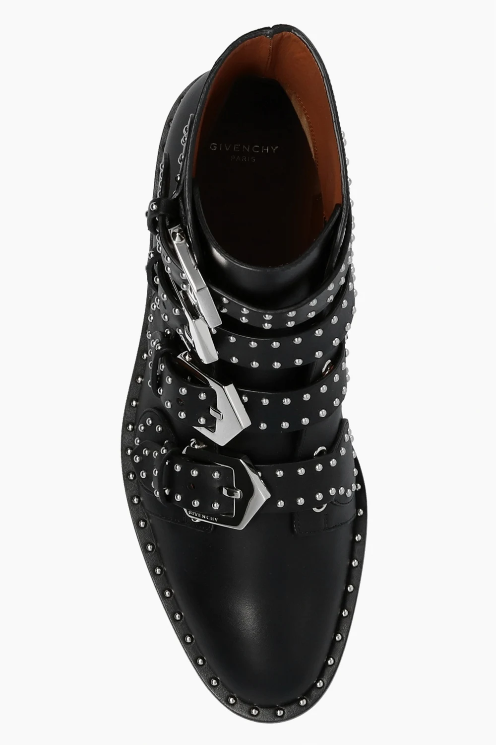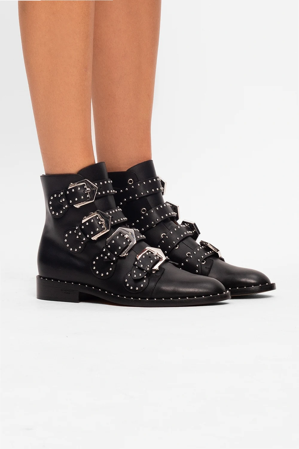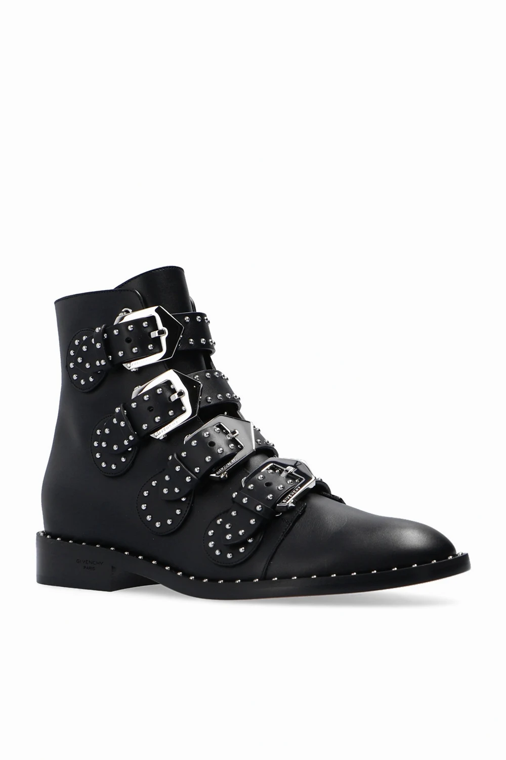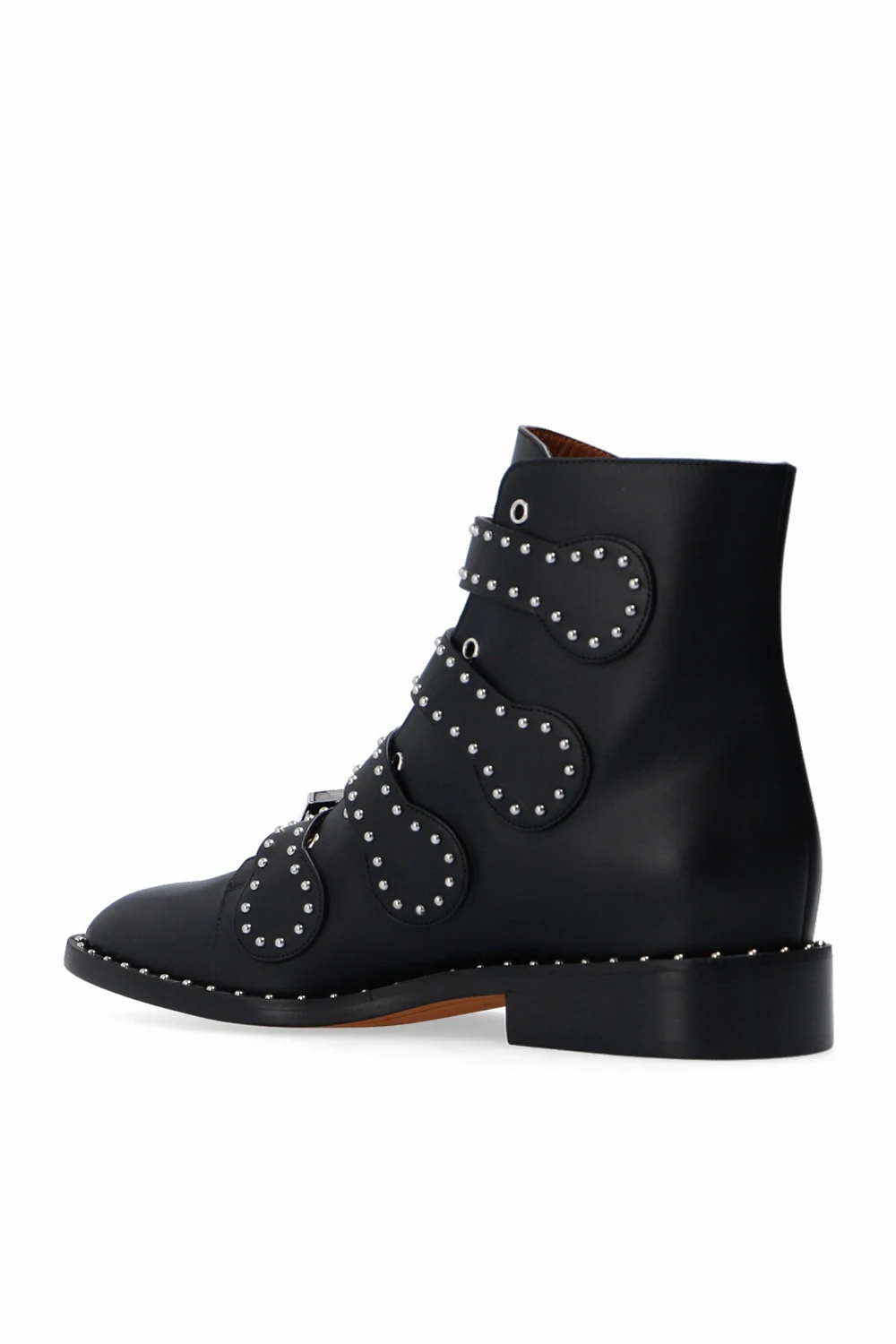 Czarne, skórzane botki Givenchy. Ozdobione ćwiekami oraz klamrami w kolorze srebrnym. Czarna, skórzana podeszwa.