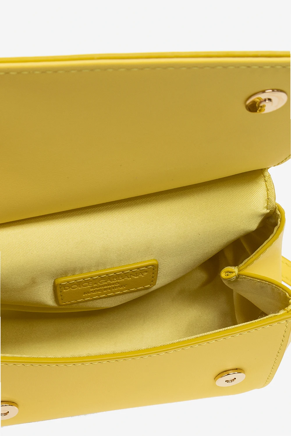 Żółta torba na ramię, model ‘Sicily Mini’ Dolce & Gabbana Kids. Wykonana z cielęcej skóry. Zamykana na klapę z magnetycznymi zatrzaskami. Ozdobiona kolorowym, nadrukowanym wzorem, inspirowanym kultowymi elementami włoskiej kultury kulinarnej. Krótka, półokrągła rączka oraz odpinany pas na ramię z możliwością regulacji długości. Wewnątrz satynowa komora. Metalowe wykończenie w kolorze jasnego złota.