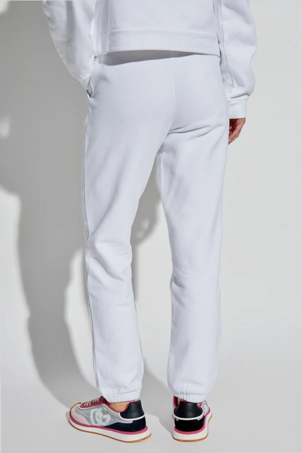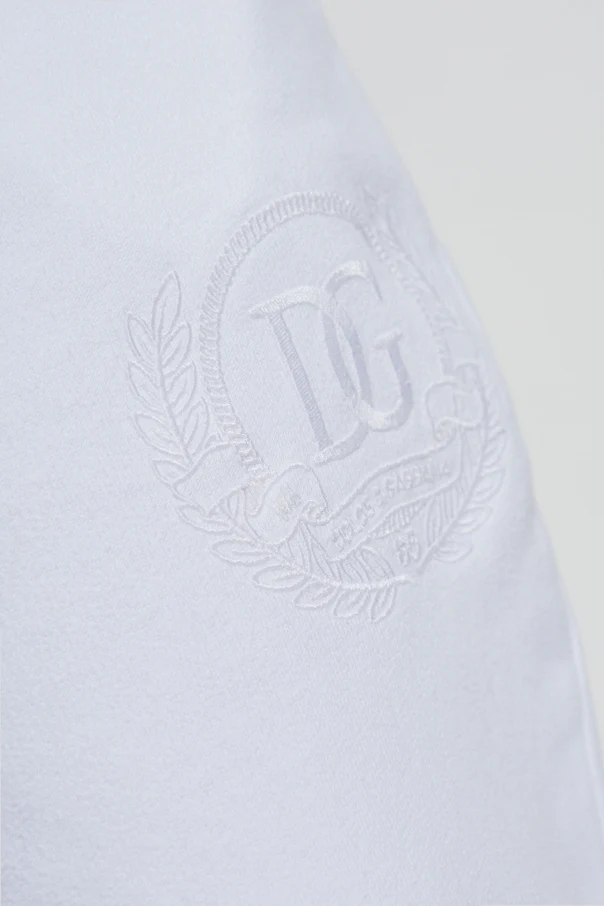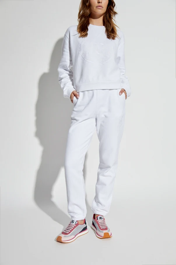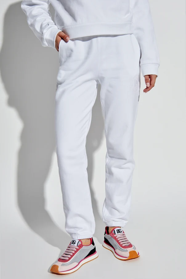 Przedstawiamy eleganckie spodnie dresowe z logo z ekskluzywnej kolekcji odzieży marki Dolce & Gabbana. Te białe spodnie, wykonane z najwyższej jakości bawełny, charakteryzują się klasycznym, prostym krojem z elastycznym ściągaczem w pasie i przy nogawkach, co zapewnia komfort i doskonałe dopasowanie.