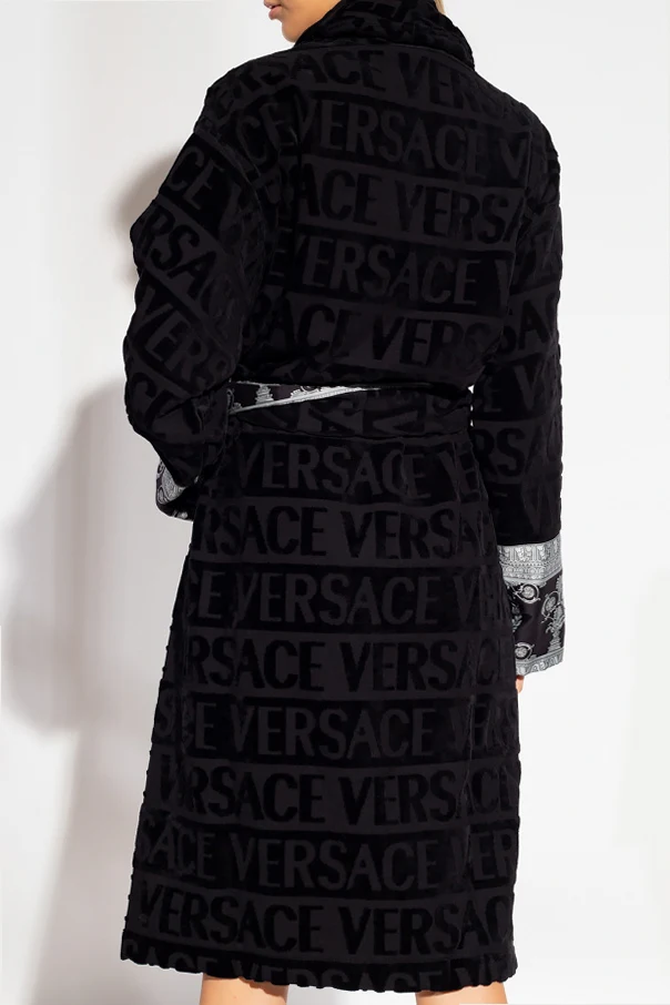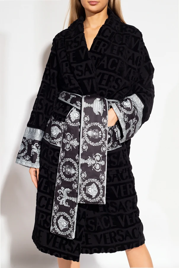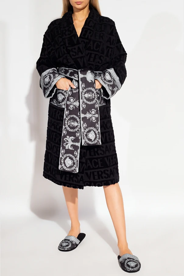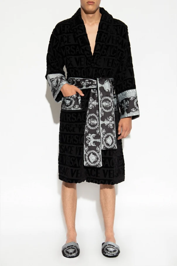 Czarny szlafrok Versace Home. Wykonany z bawełny. Ozdobiony wzorem z logo. Wykończony szarym wzorem ‘Barocco’. W pasie wiązany paskiem. Dwie wsuwane kieszenie. Długie rękawy.