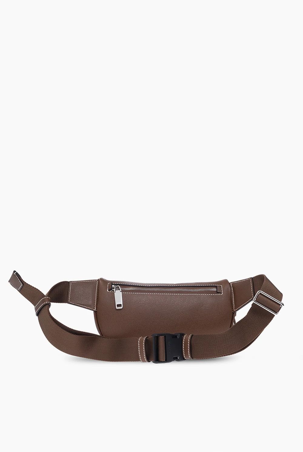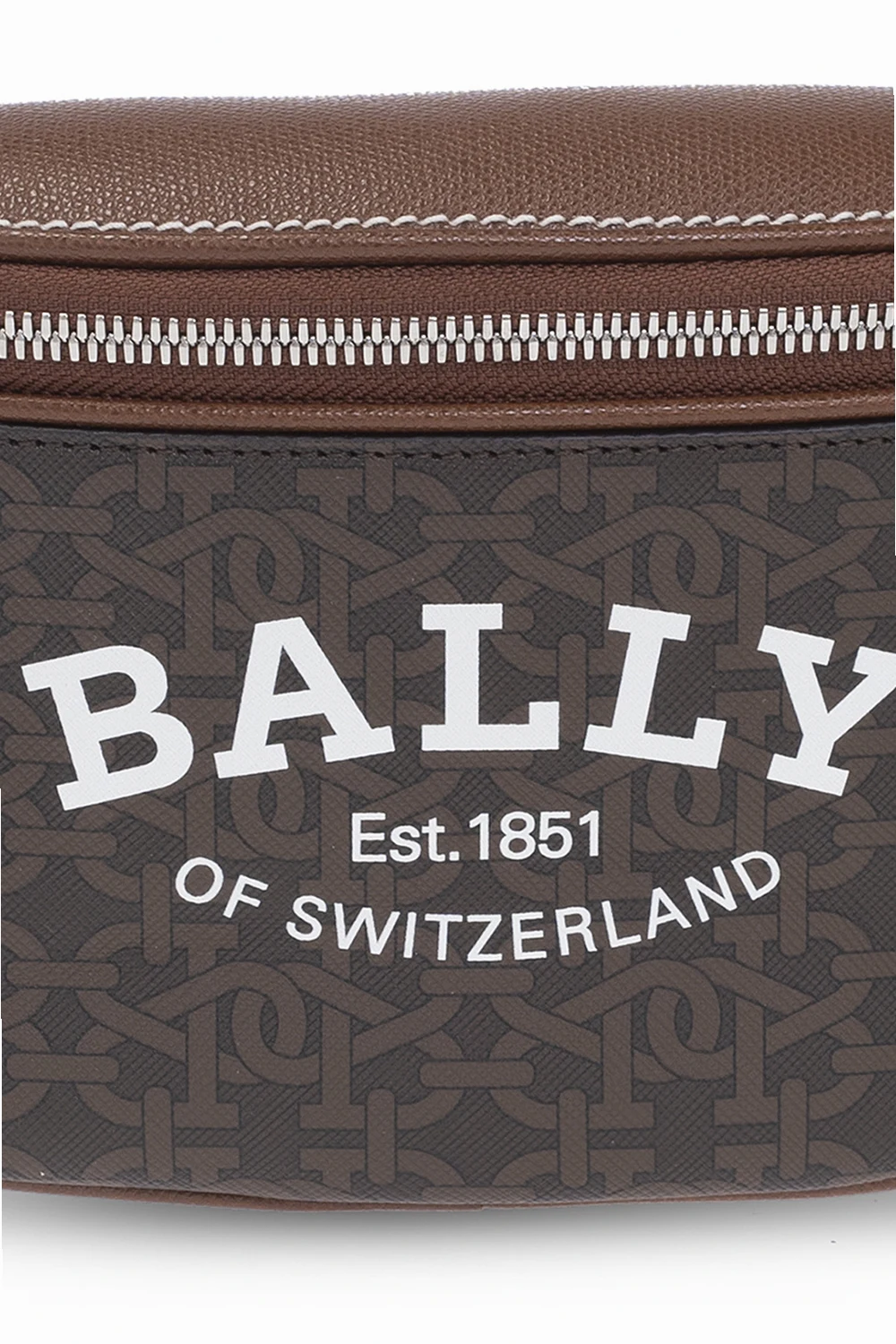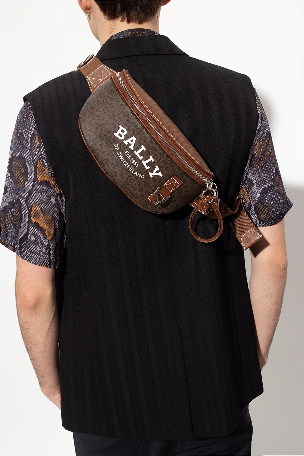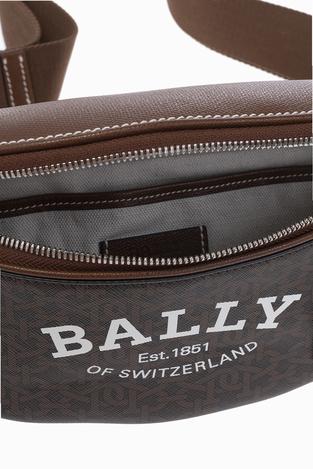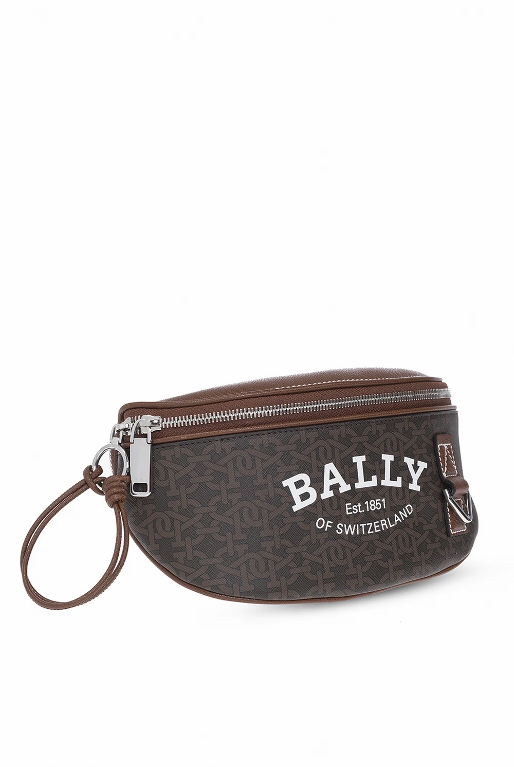 Brązowa torba na pas Bally. Zamykana na dwubiegunowy zamek. Ozdobiony białym nadrukiem z logo. Z tyłu kieszeń zamykana na zamek. Pas biodrowy z możliwością regulacji długości. Wewnątrz komora oraz wsuwana kieszeń.