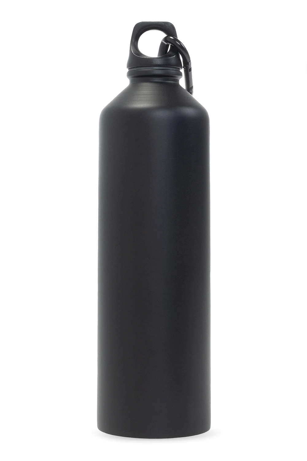 Czarny bidon Y-3 Yohji Yamamoto. Wykonany z formowanego wtryskowo metalu. Zakręcane zamknięcie z półokrągłym uchwytem i karabińczykiem. Nadrukowane logo w kolorze czarnym. Nie zawiera BPA.