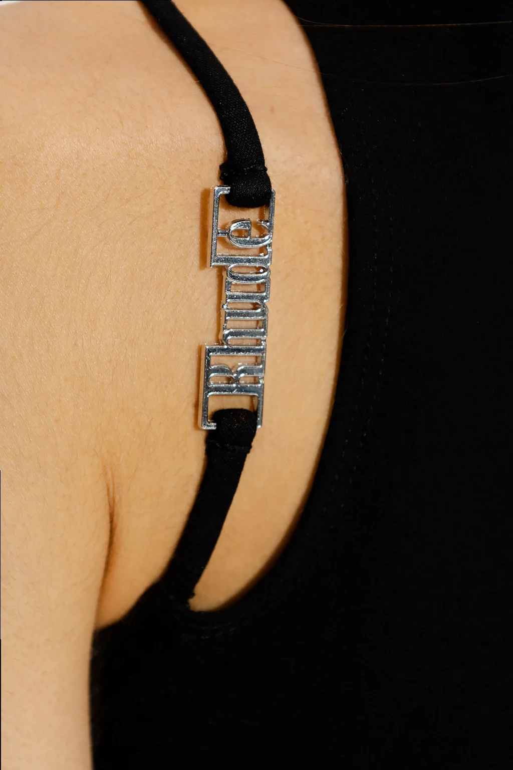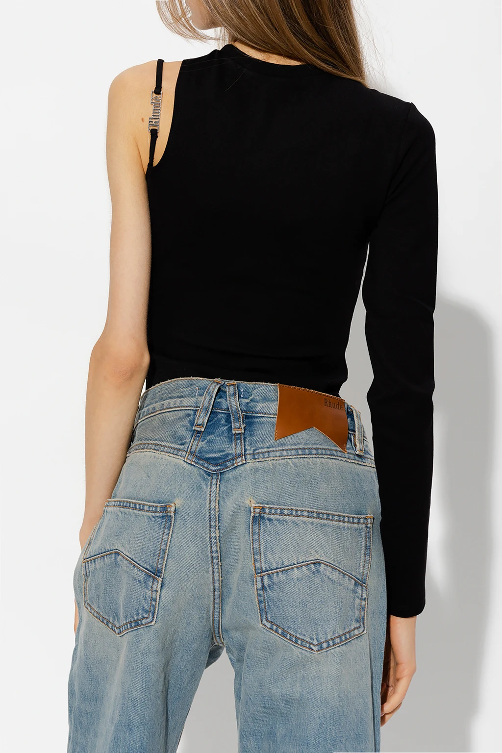 Czarny top o dopasowanym kroju Rhude. Odkryte ramię z dekoracyjnym ramiączkiem z aplikacją w kolorze srebrnym w kształcie logo. Okrągły dekolt. Jeden długi rękaw.