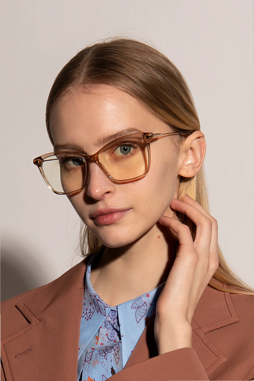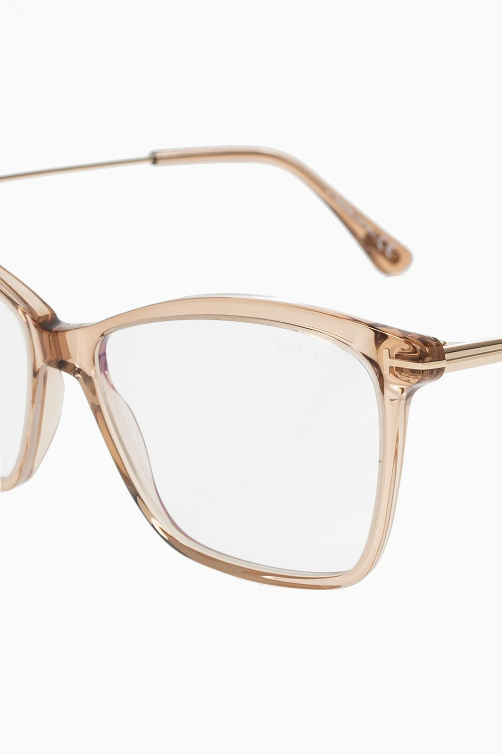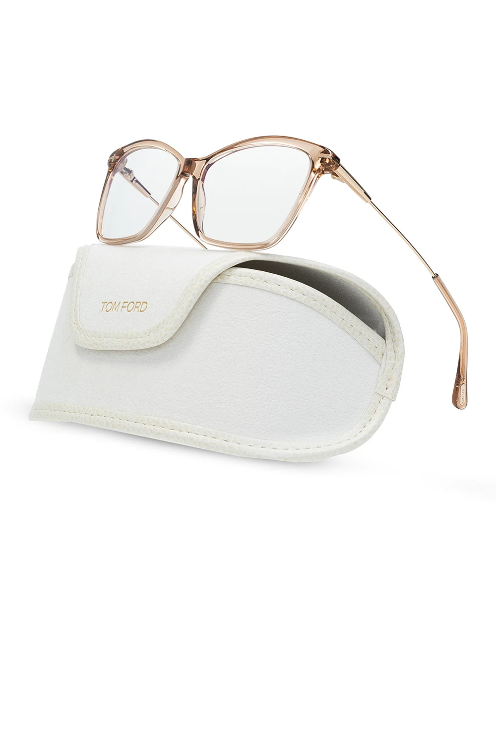 Beżowo-złote, transparentne okulary korekcyjne Tom Ford. Zauszniki z wytłoczonym logo. Dołączone etui.