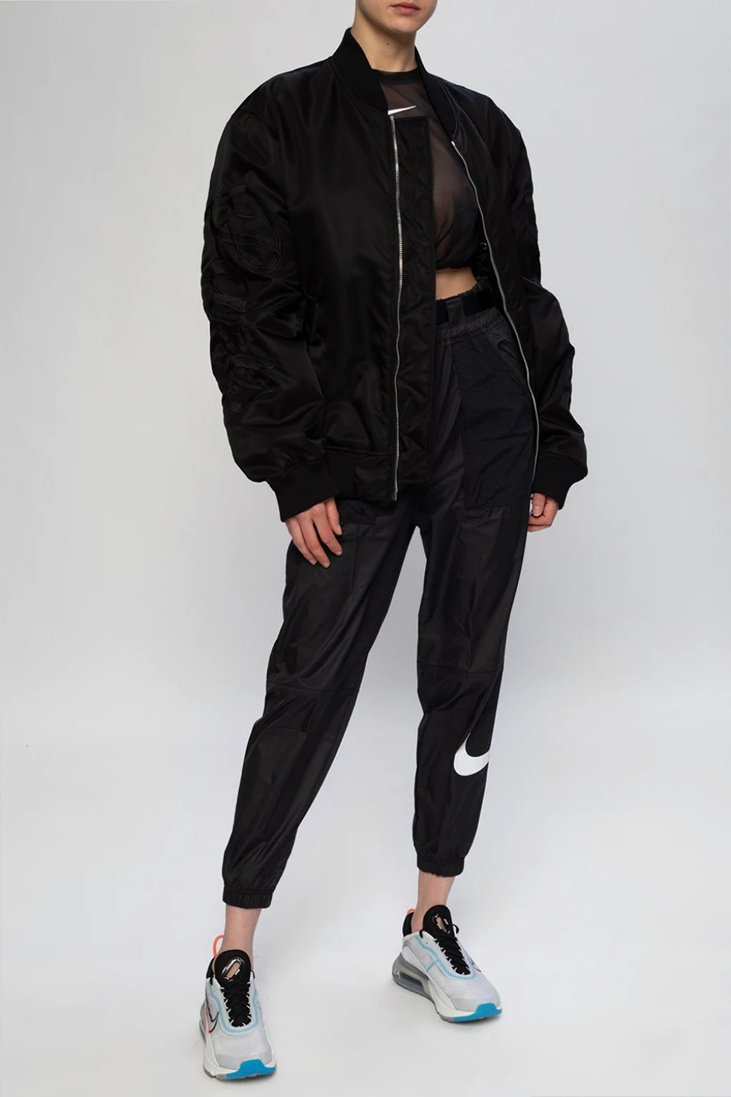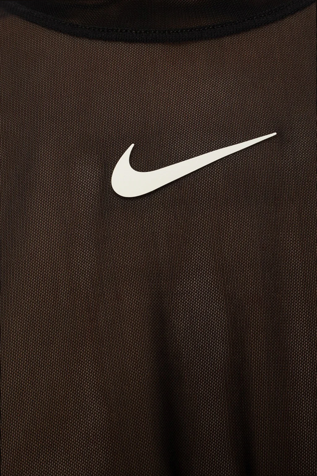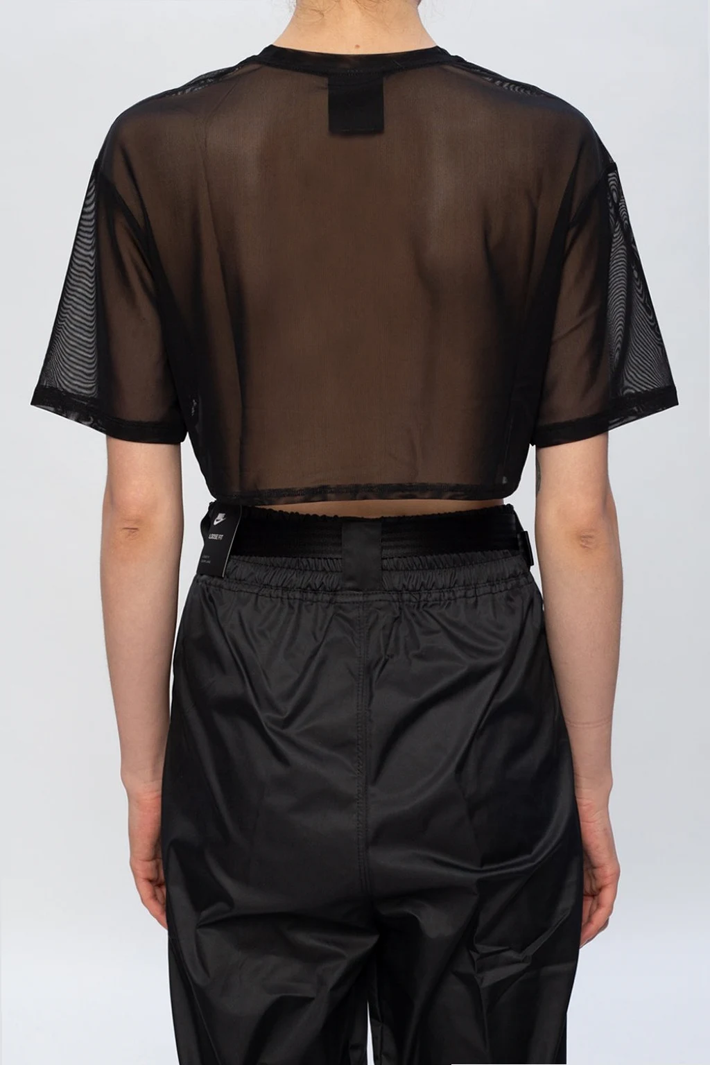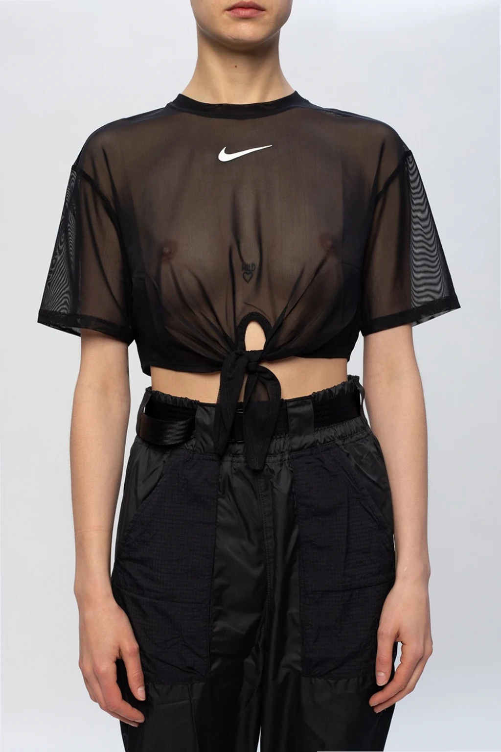 Czarny, transparentny top z krótkimi rękawami Nike. Ozdobiony nadrukowanym logo w kolorze białym oraz dekoracyjnym wiązaniem. Okrągły dekolt.