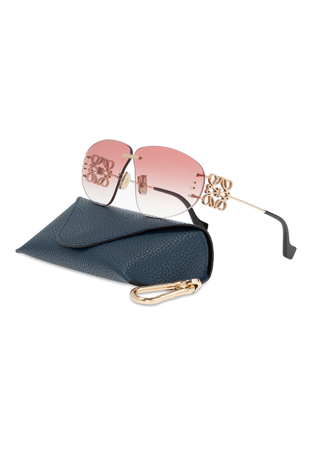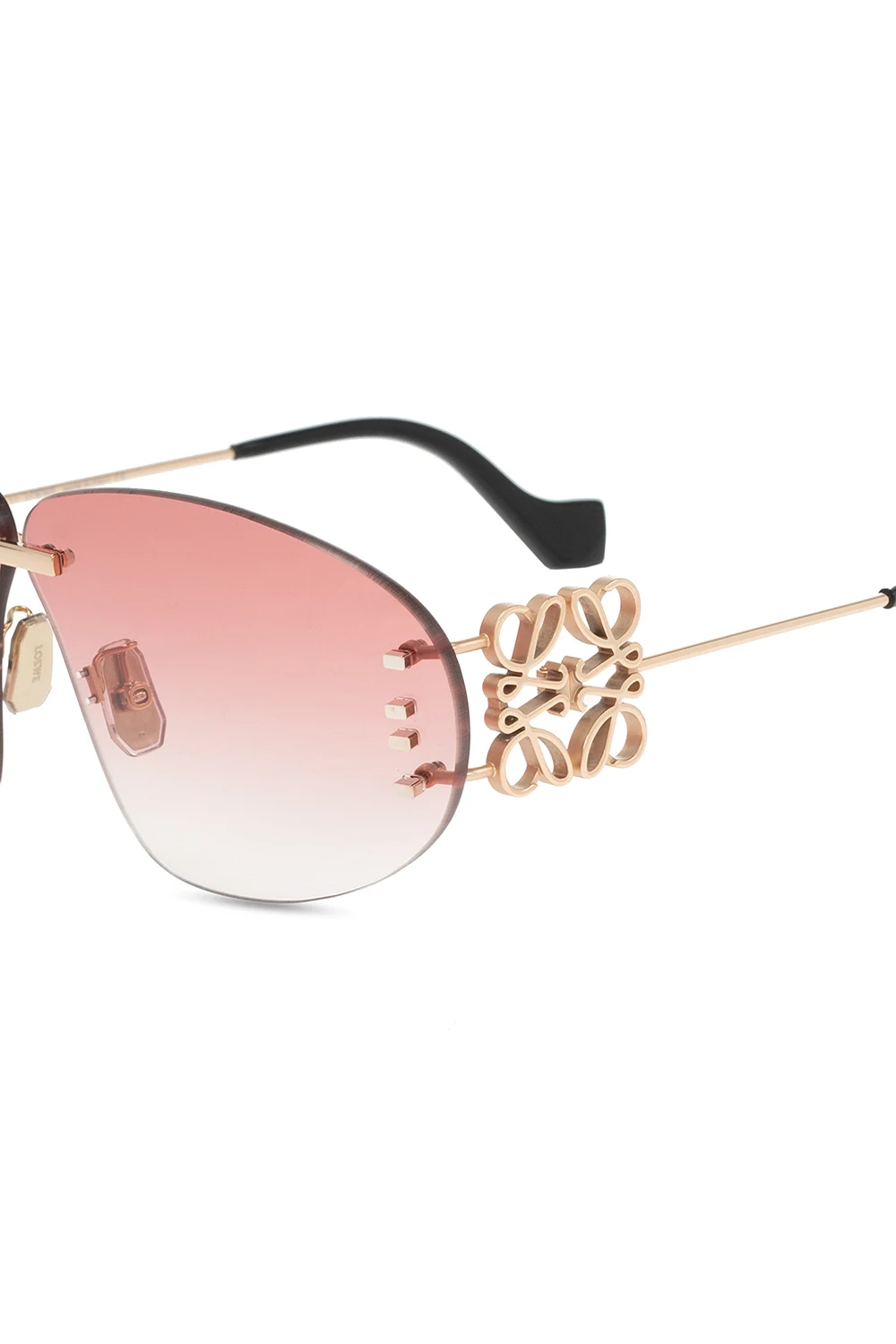 Okulary przeciwsłoneczne w kolorze złotym Loewe. Zauszniki z aplikacją w kształcie logo. Różowe, certyfikowane soczewki 100% UVA/UVB. Dołączone etui.