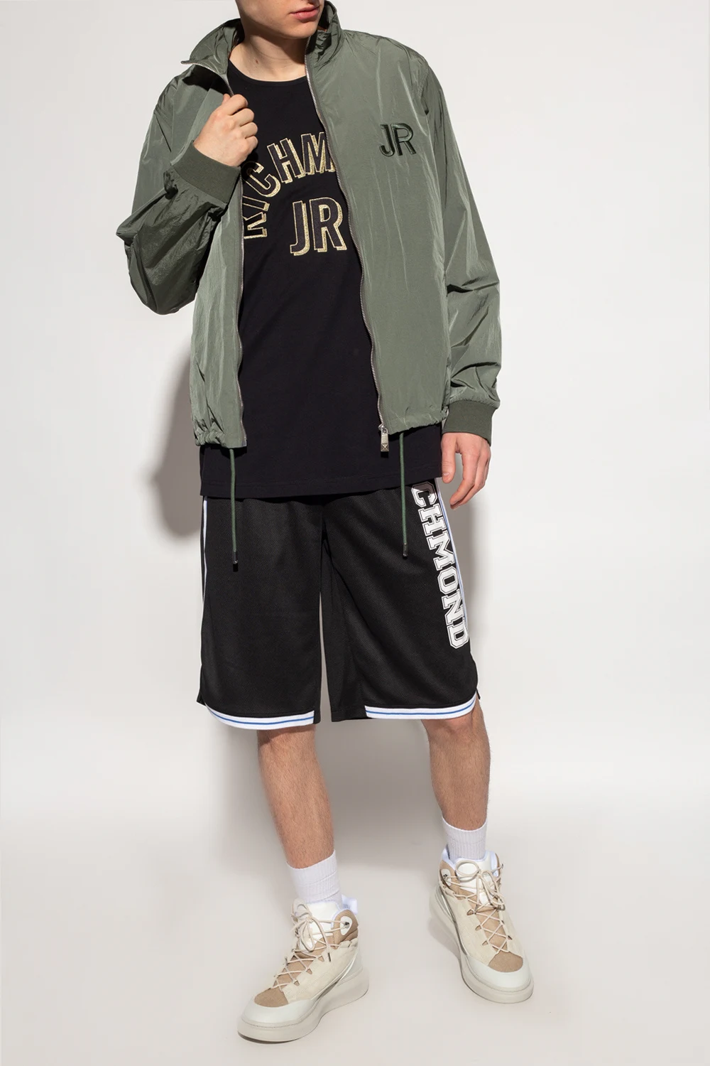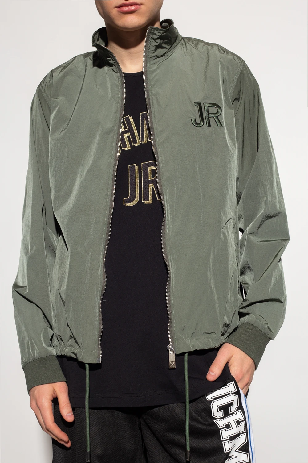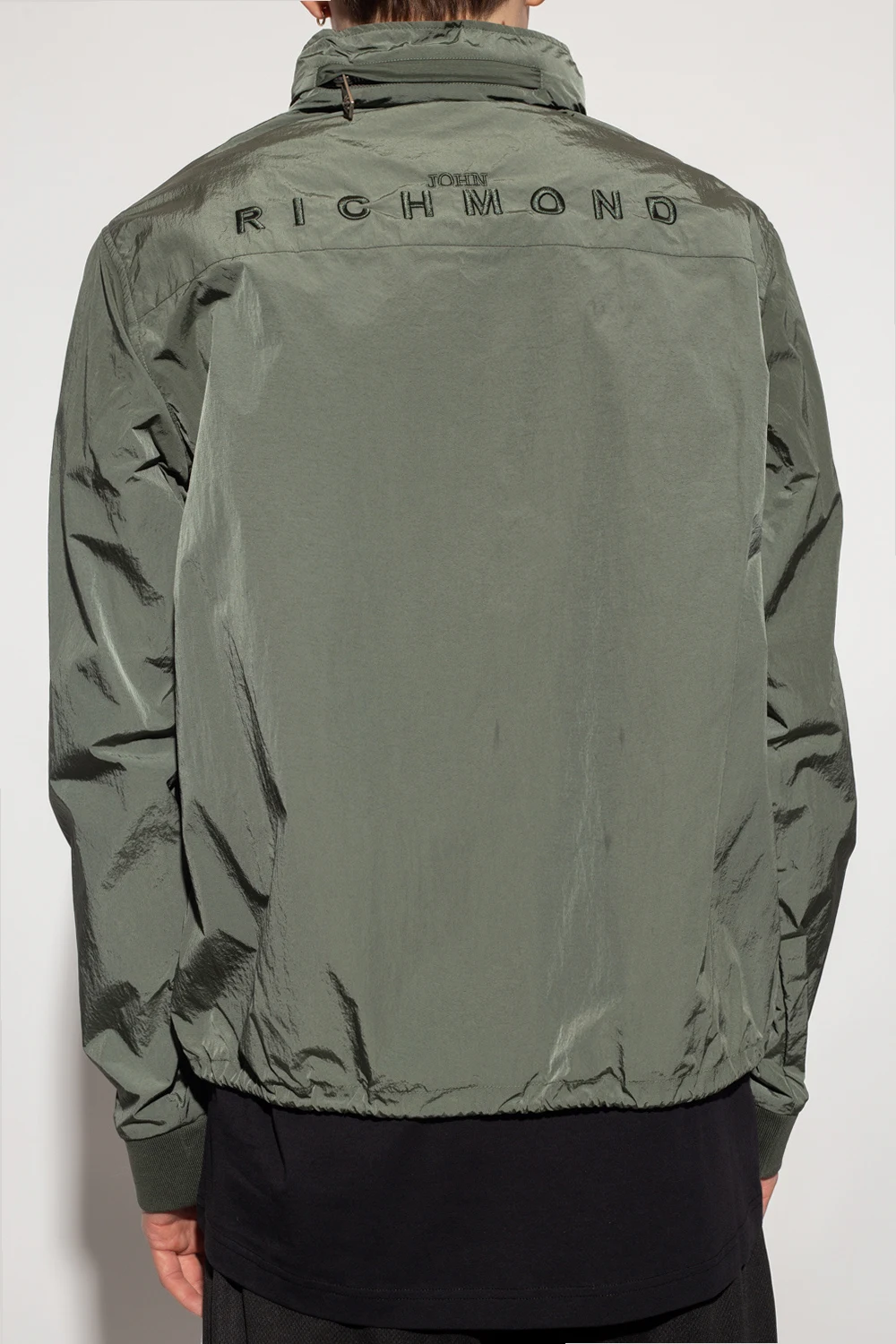 Zielona kurtka John Richmond. Zapinana na zamek. Ozdobiona wyszytym logo. Dwie wsuwane kieszenie. Chowany kaptur. Dół i długie rękawy wykończone ściągaczem.