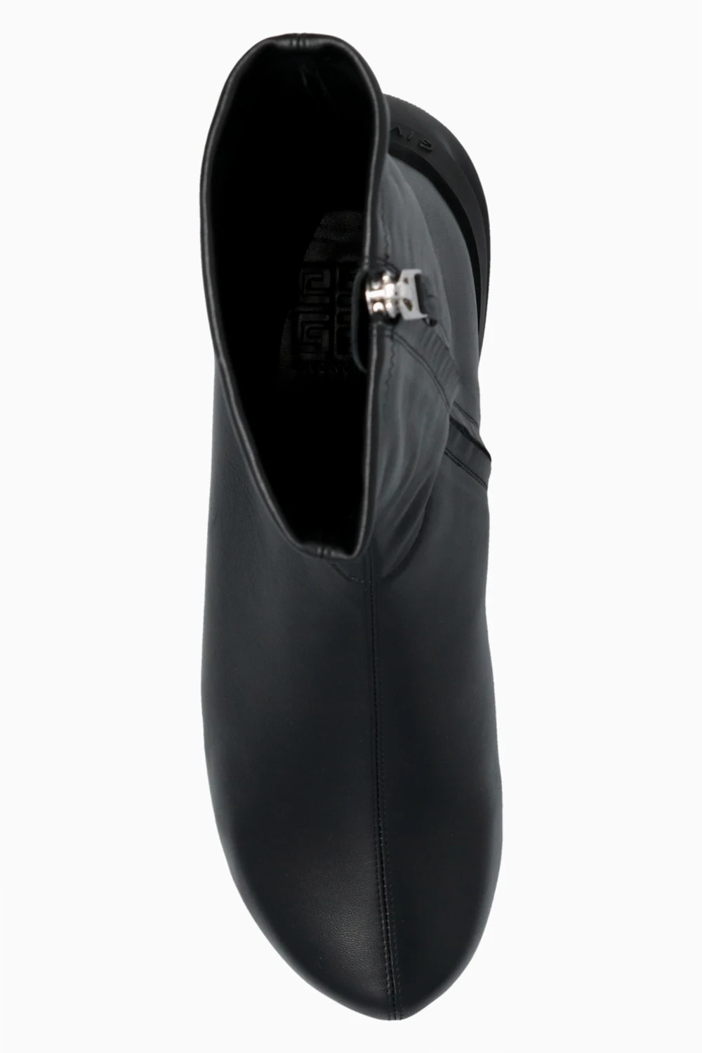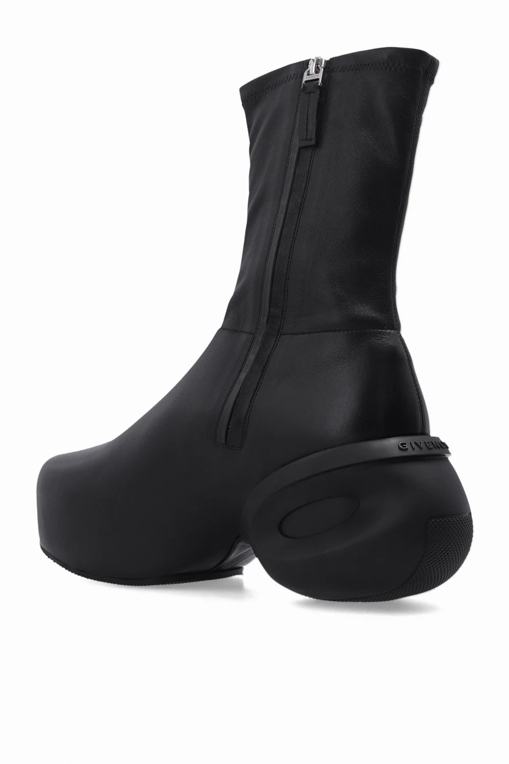 Czarne botki na platformie, model ‘G Clog’ Givenchy. Wykonane ze skóry jagnięcej. Zapinane po wewnętrznej stronie na zamek. Zaokrąglona podeszwa wykończona gumą.