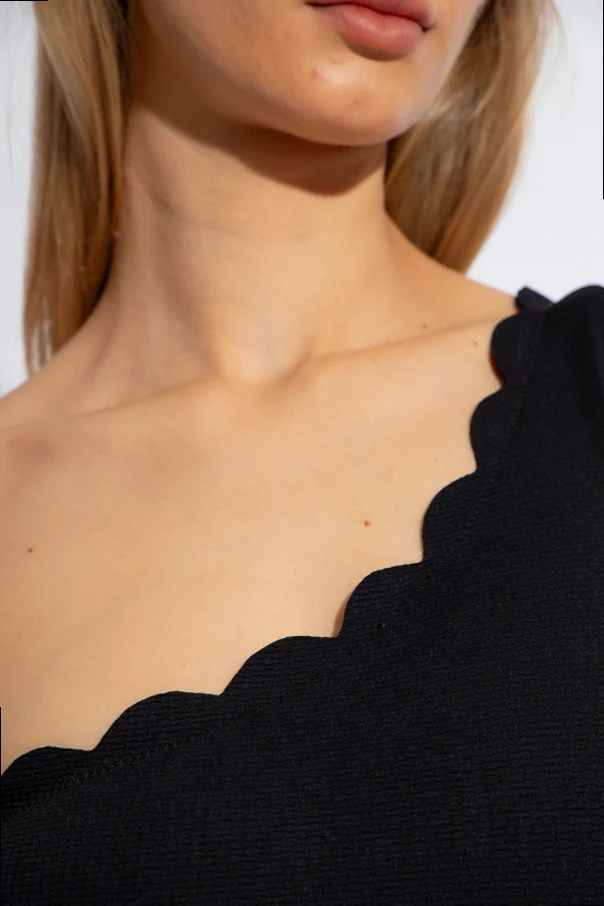Dwustronny, jednoczęściowy kostium kąpielowy na jedno ramię w kolorze czarnym i granatowym, model ‘Santa Barbara’ Marysia. Wykonany z elastycznej, teksturowanej tkaniny. Charakterystyczne, ręcznie wycinane brzegi.