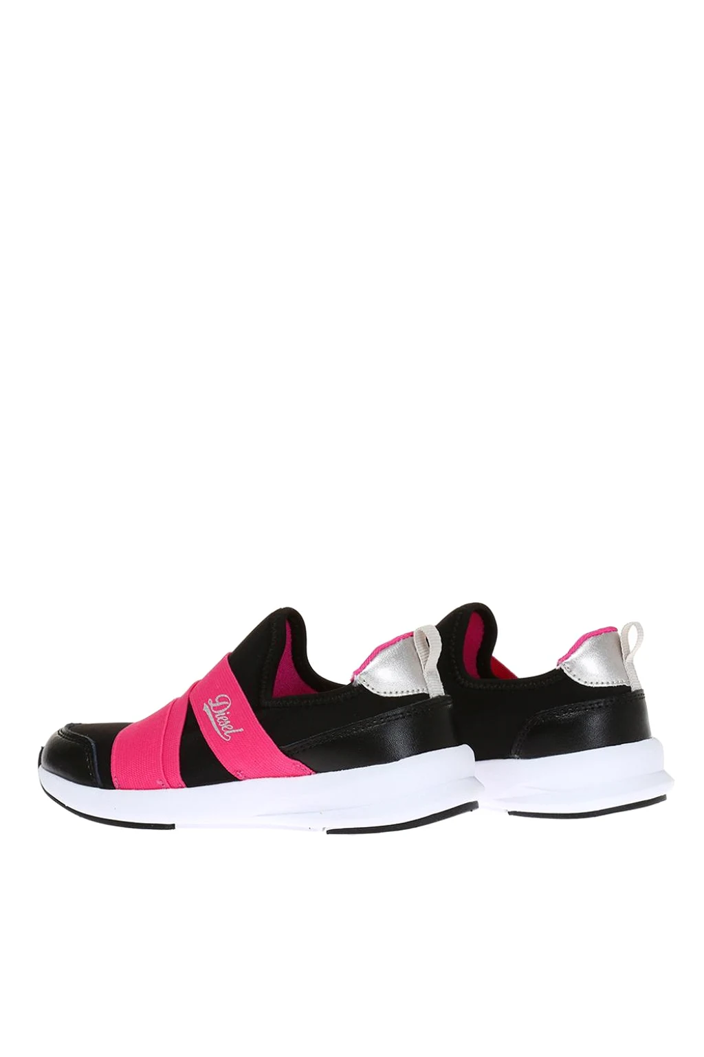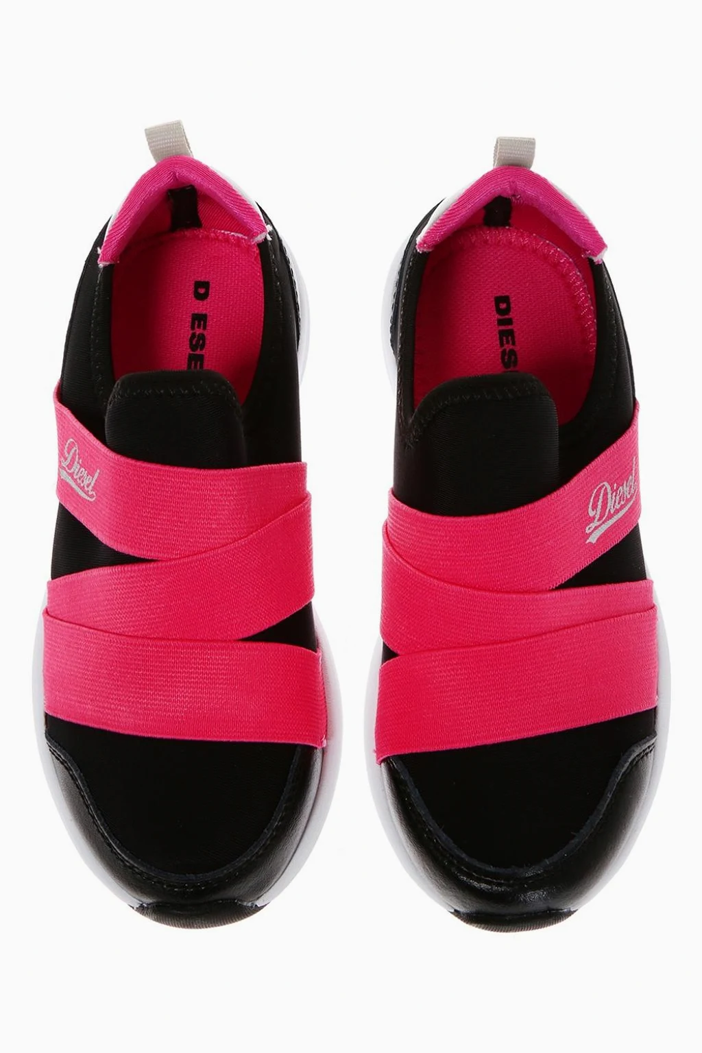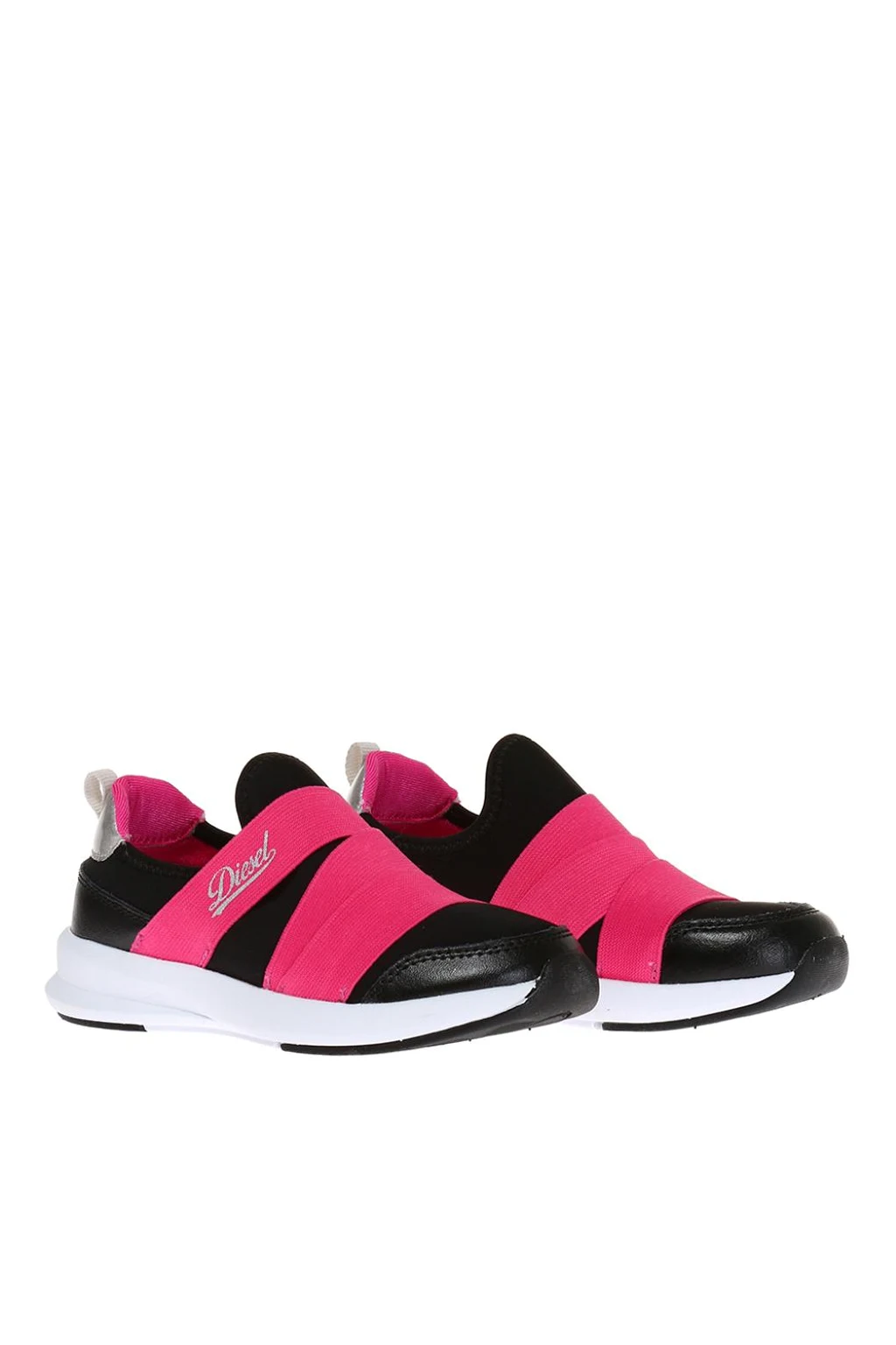 Czarne buty sportowe Diesel. Wykończone gładką skorą oraz różową taśma elastyczna z nadrukowanym logo. Czarno-biała, gumowa podeszwa.