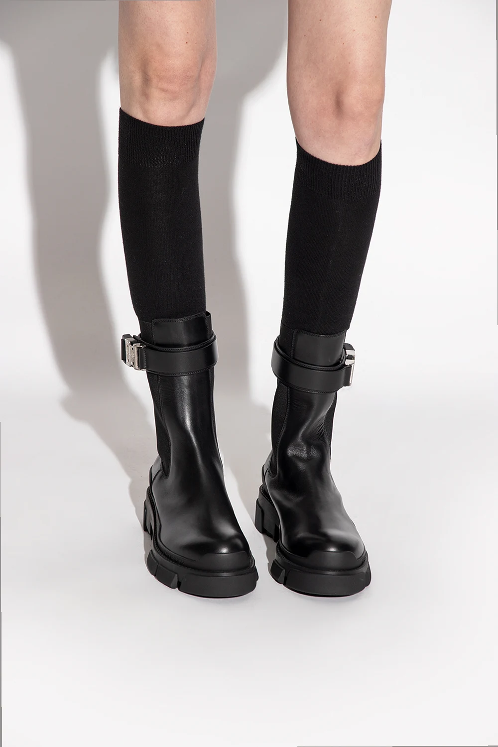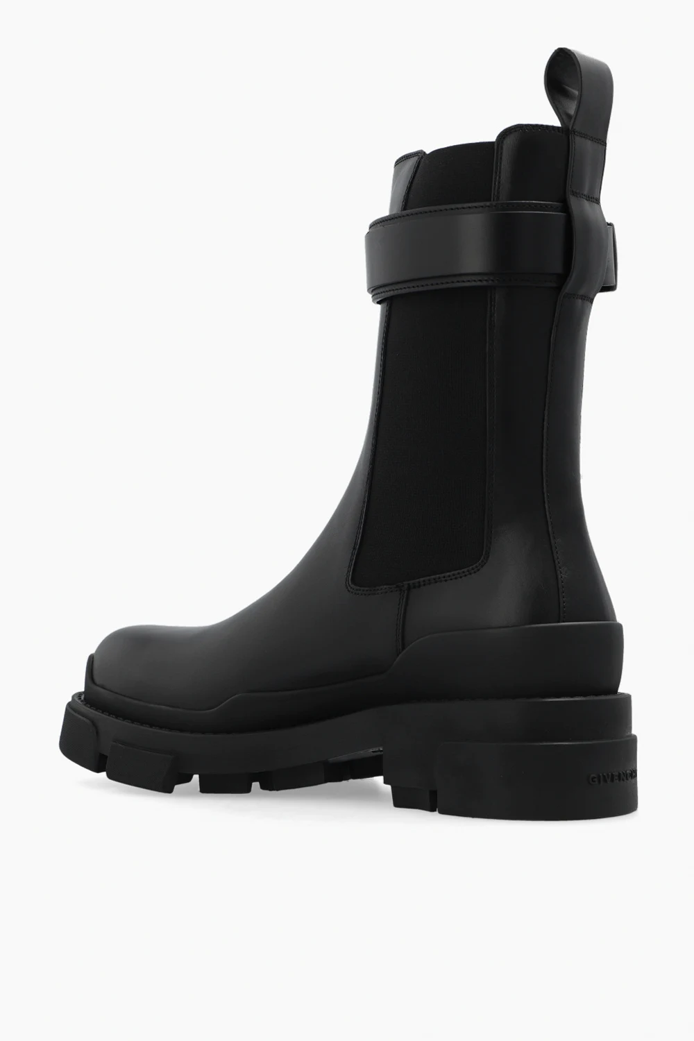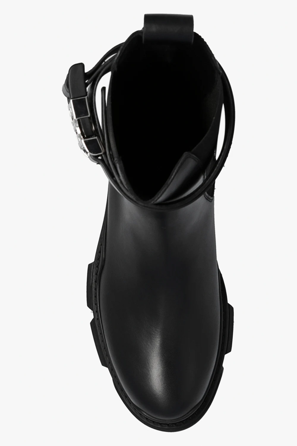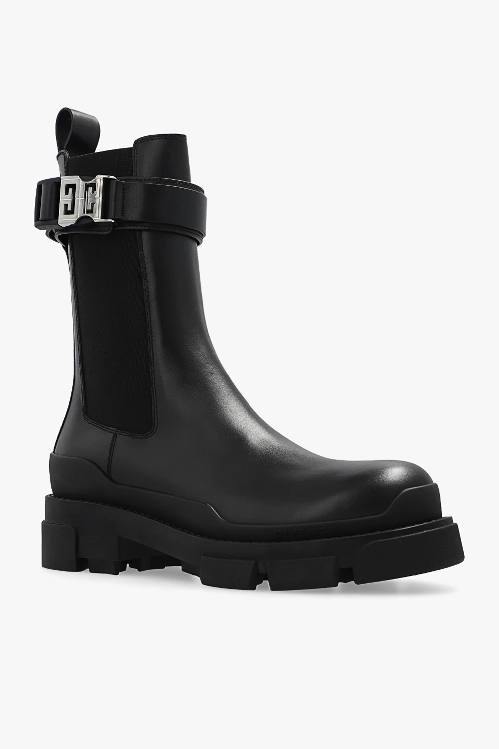 Czarne sztyblety, model ‘Terra’ Givenchy. Wykonane ze skóry cielęcej. Wokół cholewki pasek zapinany na dekoracyjną, zatrzaskową klamrę w kształcie ‘4G’ w kolorze srebrnym. Po bokach wszyta guma. Czarna, masywna podeszwa z logo wykonana z gumy.