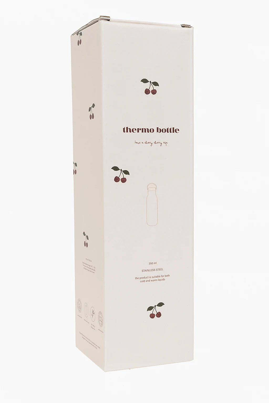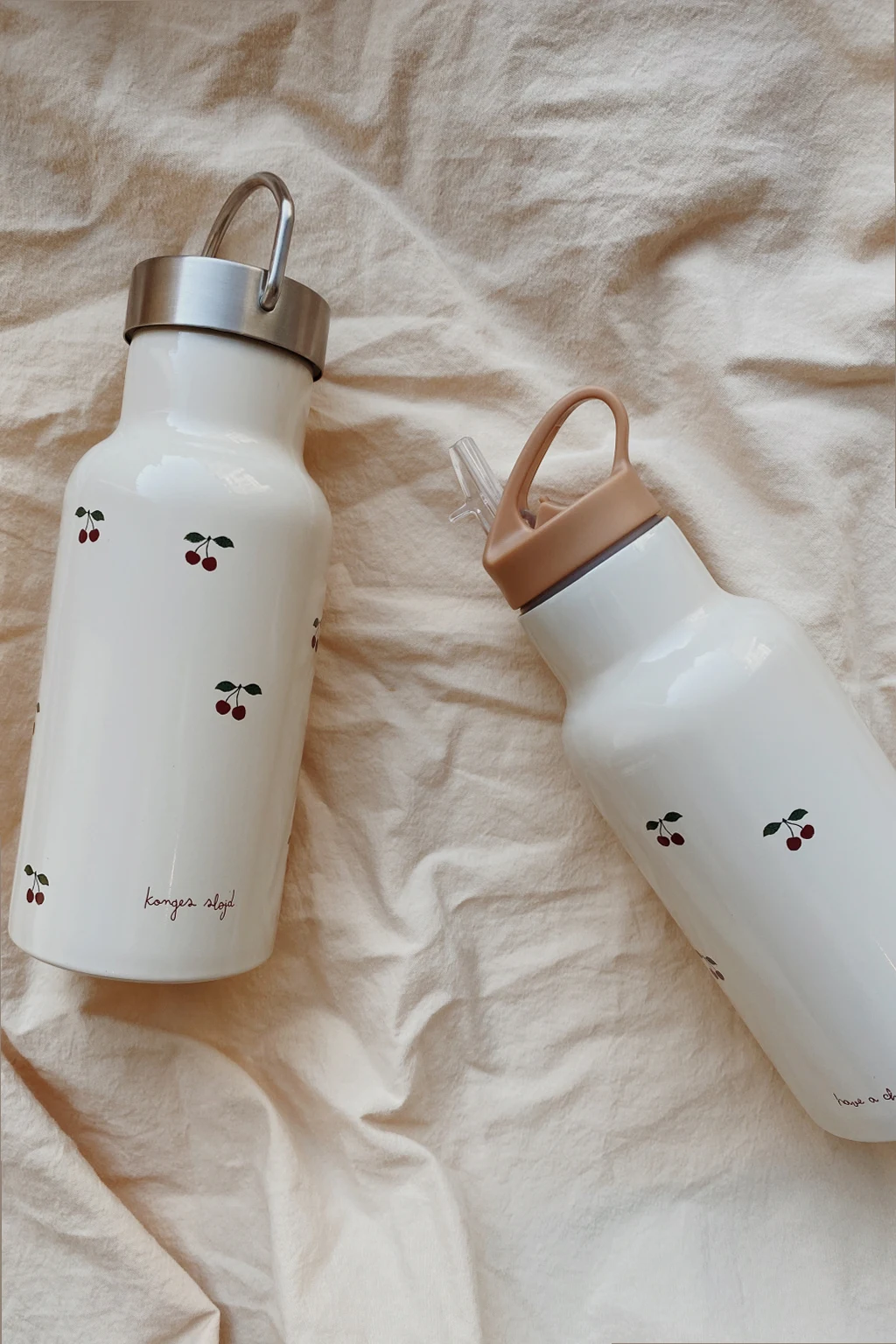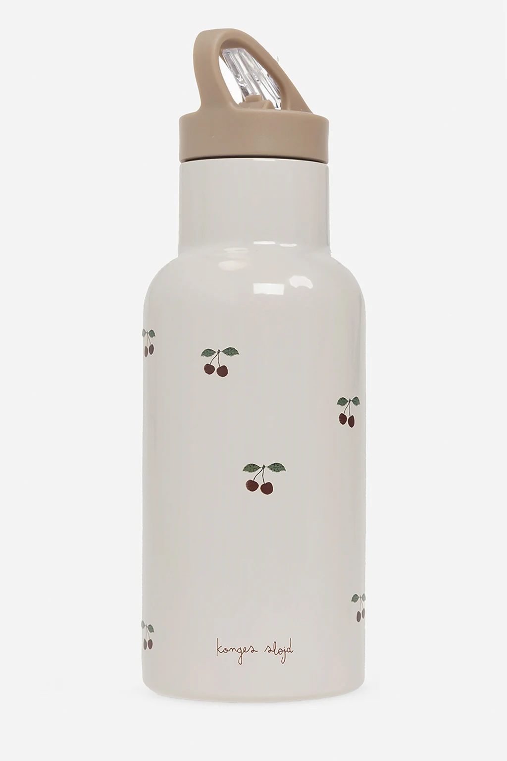 Kremowo-beżowa, termiczna butelka Konges Slojd. Ozdobiona kolorowym nadrukiem z motywem wiśni i logo. Dwie nakrętki, jedna ze słomką.
