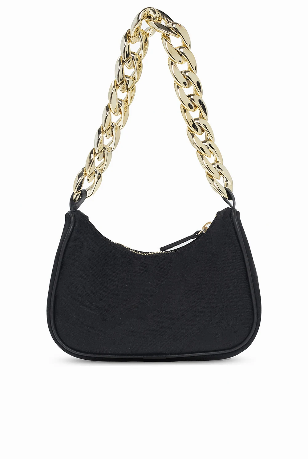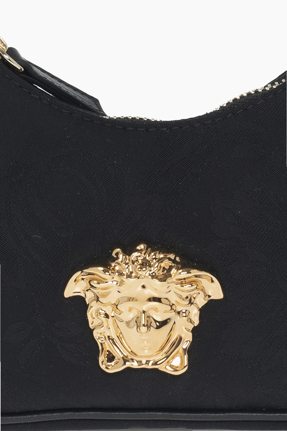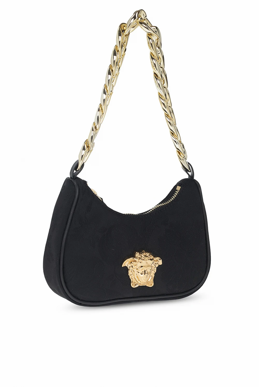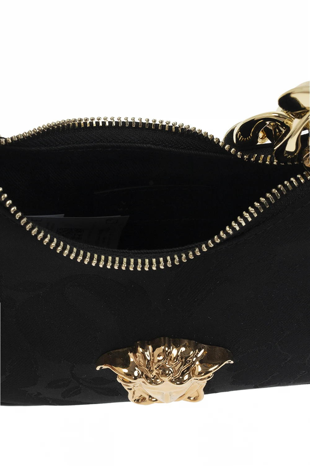 Czarna torba na ramię Versace Kids. Wykonana z materiału ozdobionego motywem barokowym. Zamykana na zamek. Z przodu charakterystyczna głowa Meduzy. Półokrągły pasek w formie łańcucha. Wewnątrz komora. Metalowe elementy w kolorze złotym.