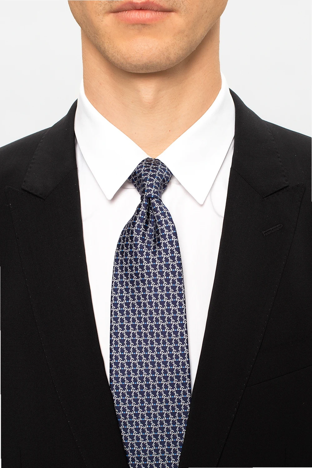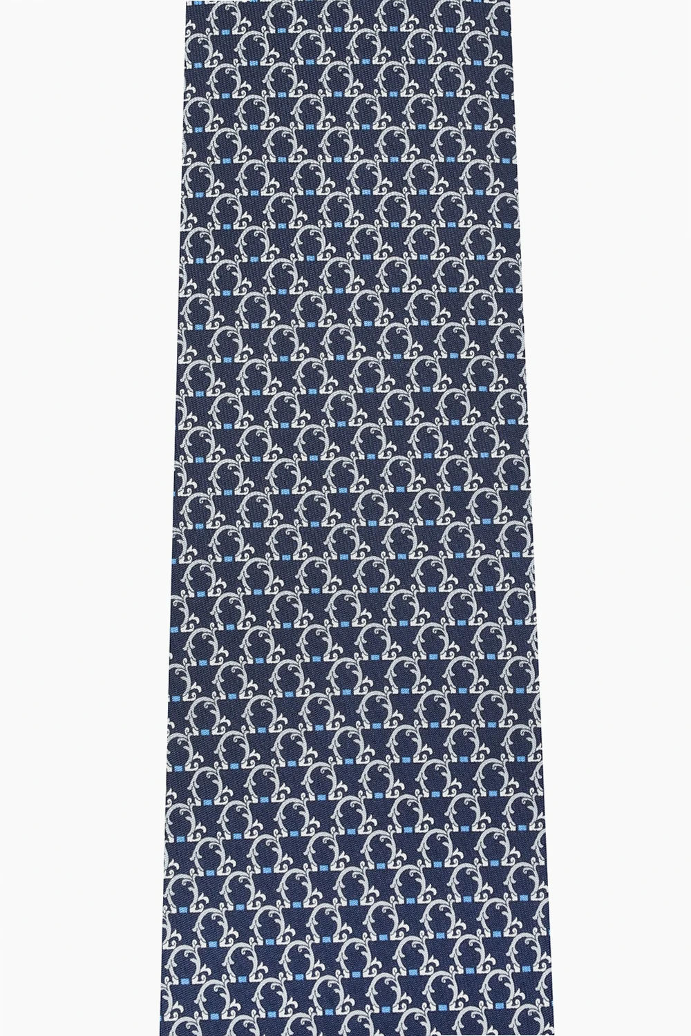 Granatowy, jedwabny krawat Salvatore Ferragamo. Ozdobiony nadrukowanym wzorem w kolorze szaro-niebieskim.